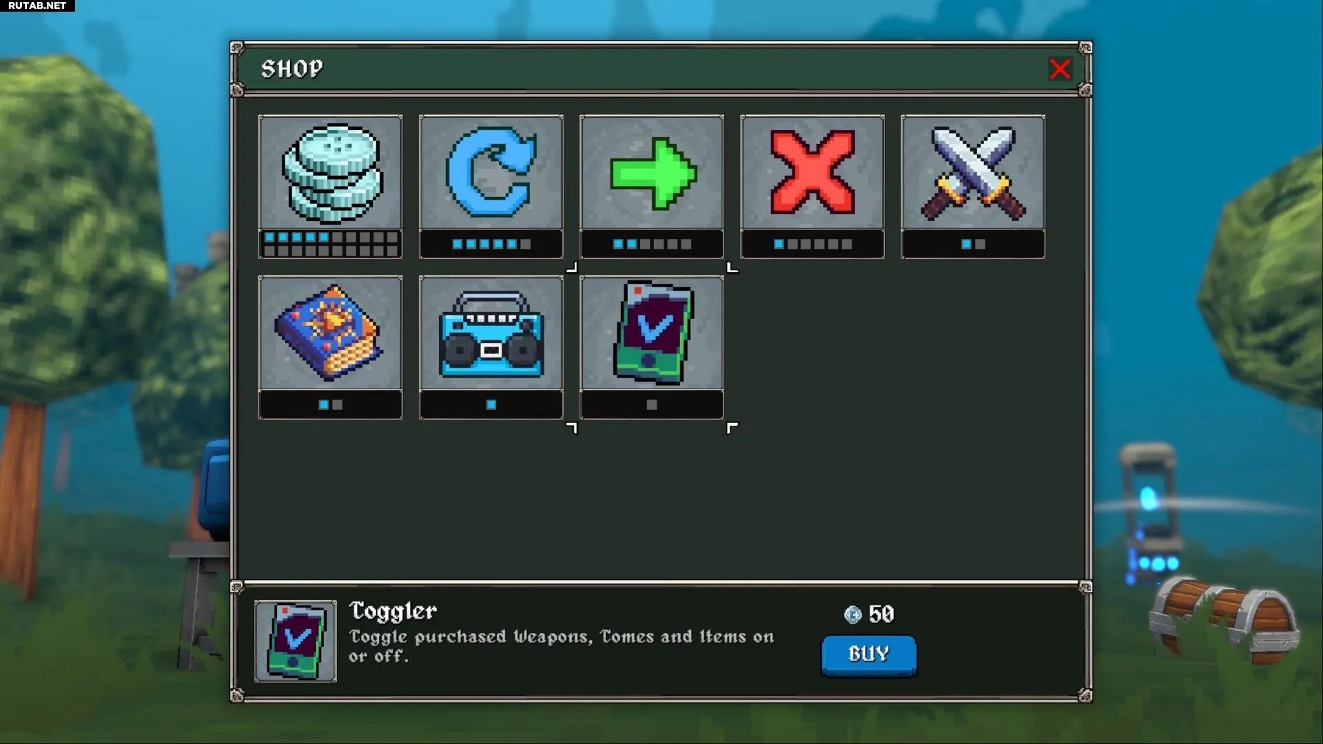 За 50 серебра можно приобрести Toggler, который окажется очень полезен при попытках собрать определённые предметы для забега. С его помощью игроки могут зайти в меню разблокировок и отключить любое купленное оружие, тома и предметы.
