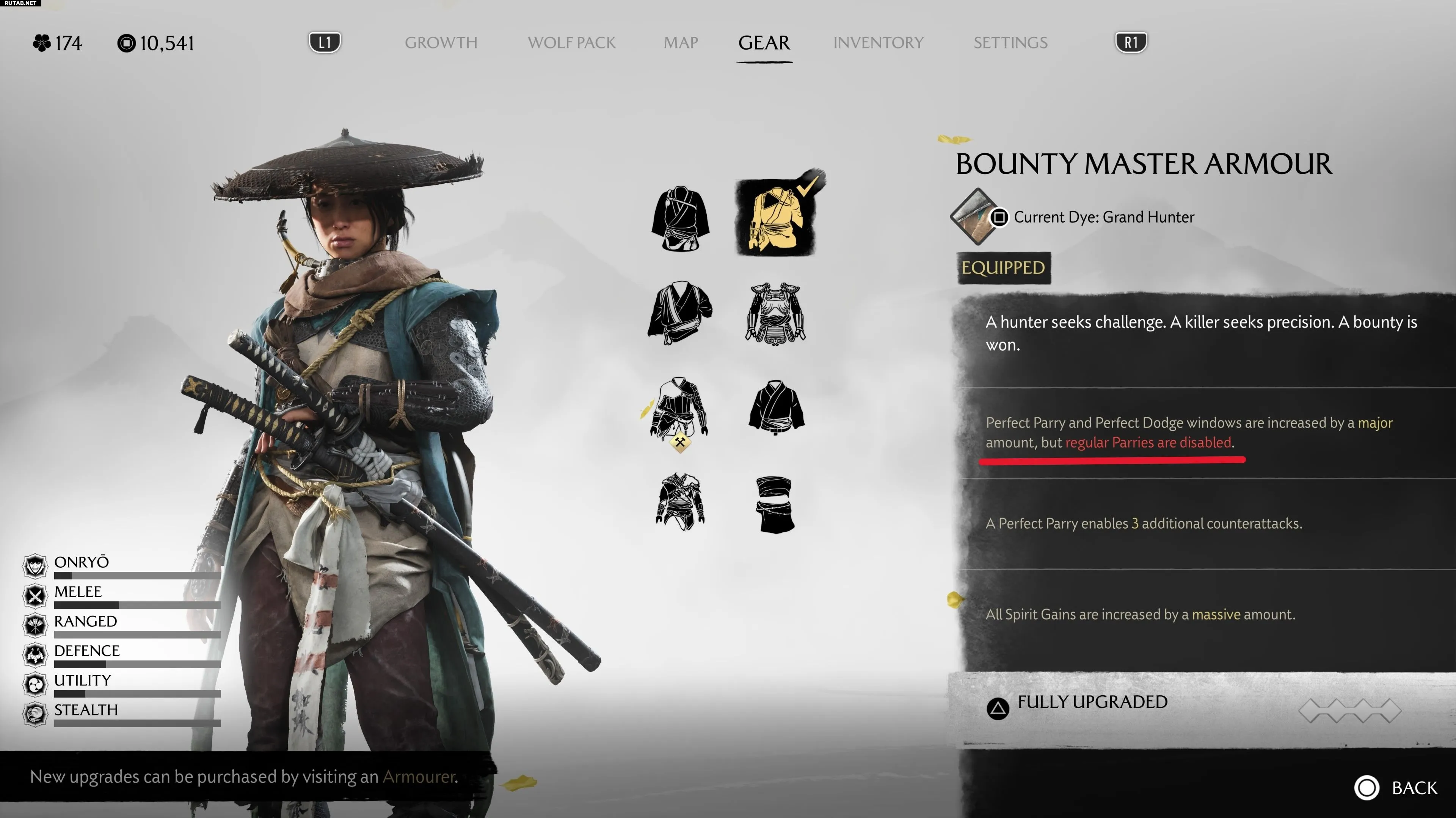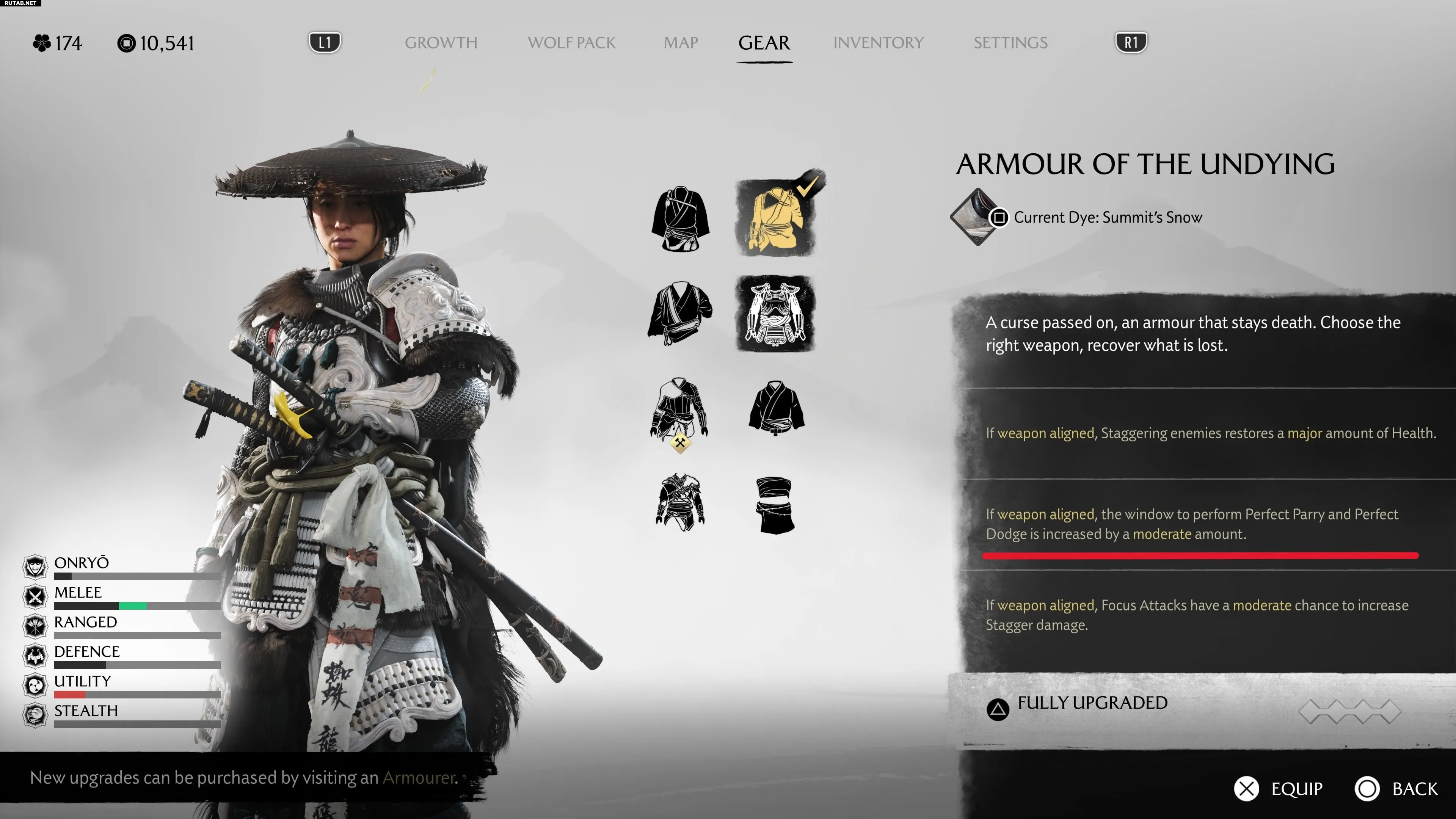 - Броня Бессмертного — увеличивает окно для идеального парирования и уклонения. Находится в мифической истории о Бессмертном Самурае на равнине Исикари.