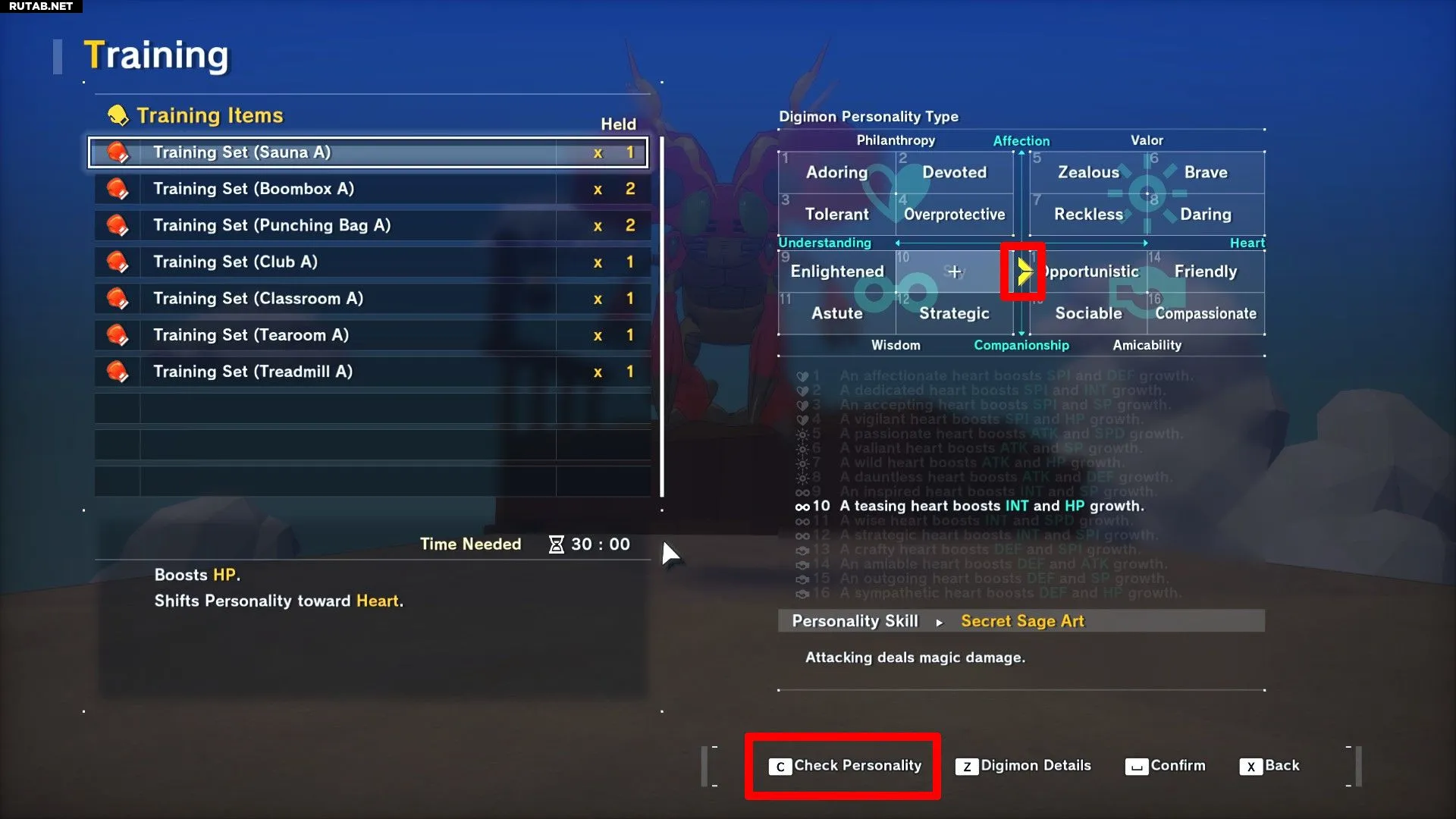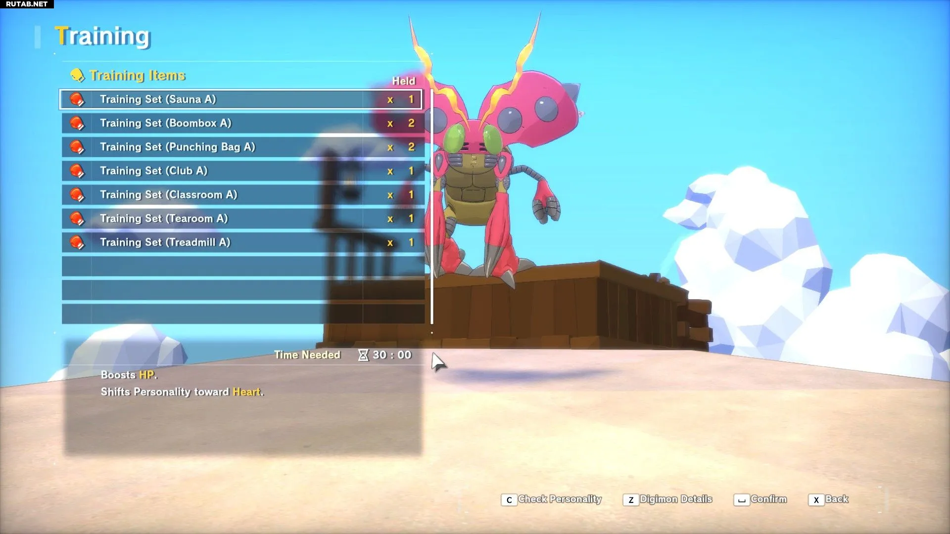 - Тренировка: По мере прогресса в игре игроки находят или покупают предметы для тренировки. Эти предметы повышают характеристики и сдвигают личность дигимона в указанных направлениях. Это позволяет оптимизировать рост характеристик.