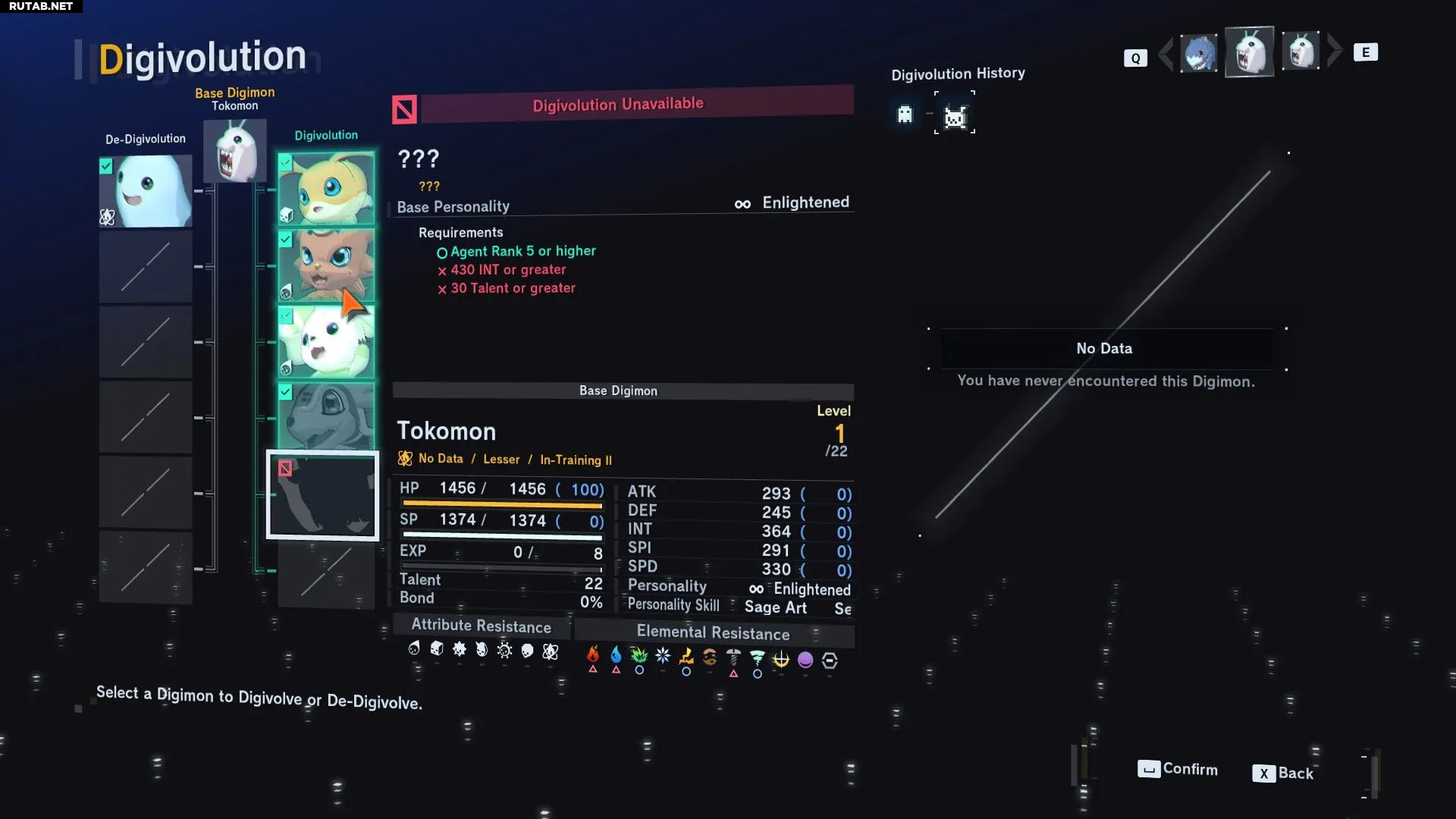 Потенциал таланта можно повысить с помощью «Усиления загрузки» (используя других дигимонов как материал) или «Чипа пробуждения таланта». При выполнении условий в линии эволюции Токомона появится новая ветка с требованиями:
