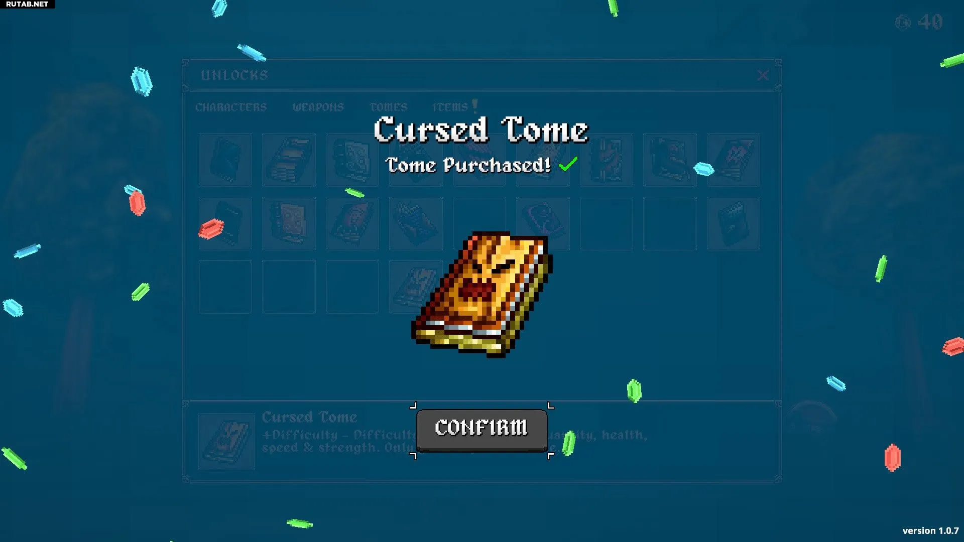 Том Удачи | Шанс выпадения 0.01% при убийстве любого врага | +Удача: улучшает шансы получения наград высшего уровня при повышении уровня и от Алтарей |