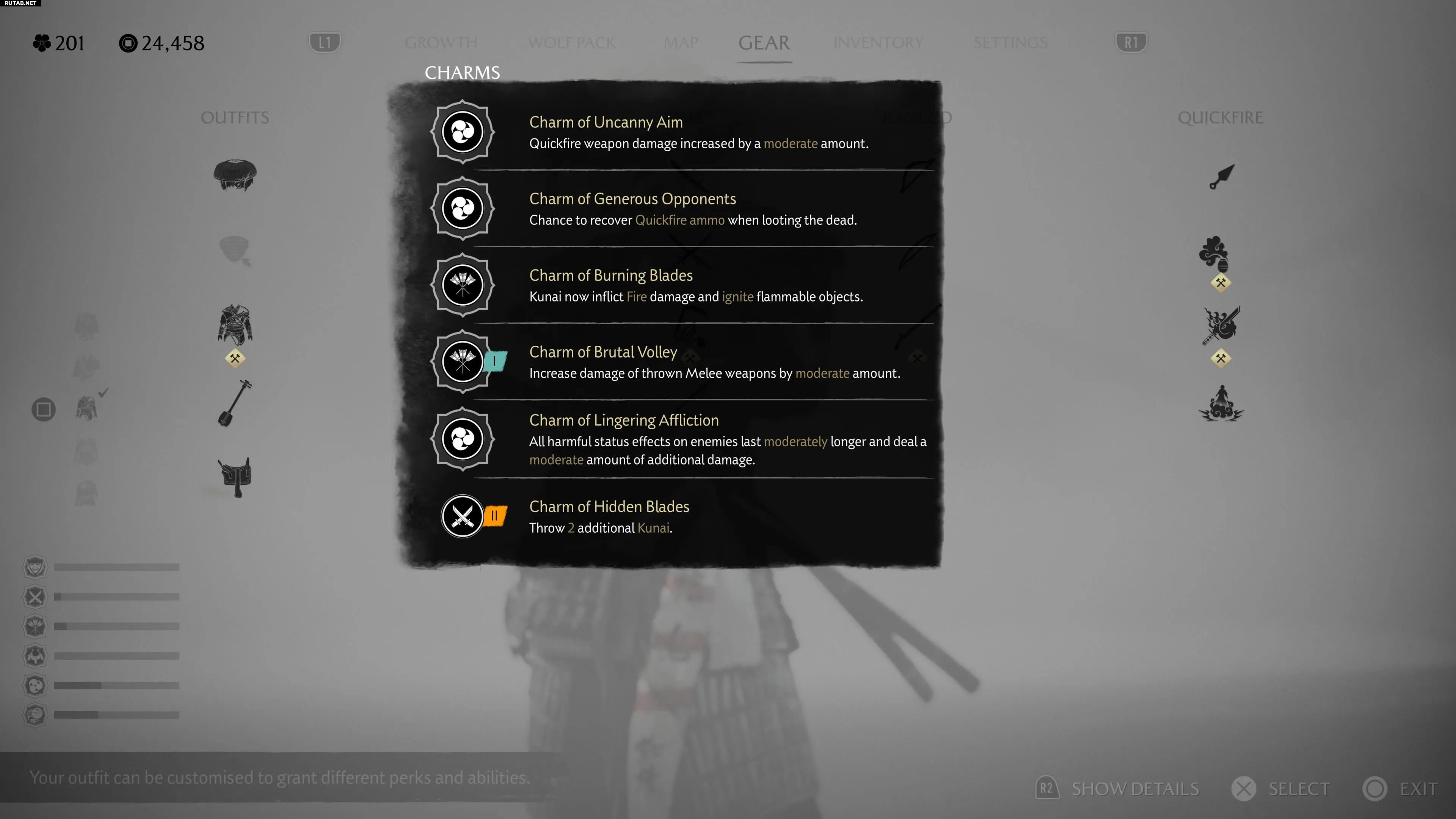 Среди перечисленных амулетов Амулет Скрытых клинков является самым важным — он позволяет метать три дополнительных куная при каждом использовании быстрых выстрелов. Амулет Горящих клинков прекрасно сочетается с Доспехами Девяти Хвостов, добавляя кунаям огненный урон, длительность которого увеличивается благодаря бонусам доспехов. Амулет Затяжного недуга дополнительно продлевает эти эффекты, а Амулет Сверхъестественной меткости усиливает урон от кунаев. Чтобы всегда иметь под рукой боеприпасы, используйте Амулет Щедрых противников, дающий шанс восстановить заряды быстрых выстрелов при обыске трупов. Наконец, Амулет Брутального залпа увеличивает урон метательного оружия ближнего боя, которое станет особенно эффективным при правильной прокачке навыков: