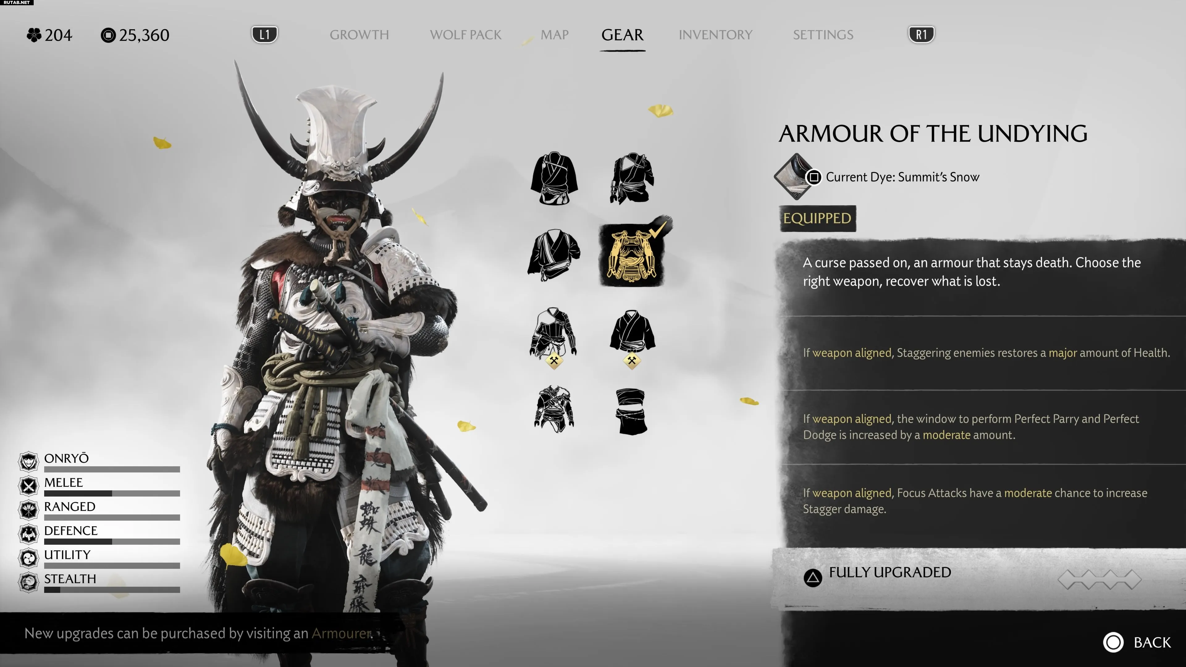 Доспехи Бессмертного | «Бессмертный самурай» (мифическая история на равнине Исикари) | При соответствии оружию оглушение врагов восстанавливает значительное количество здоровья. При соответствии оружию окно для выполнения идеального парирования и идеального уклонения увеличивается на умеренную величину. При соответствии оружию фокусированные атаки с умеренным шансом увеличивают урон оглушения. |