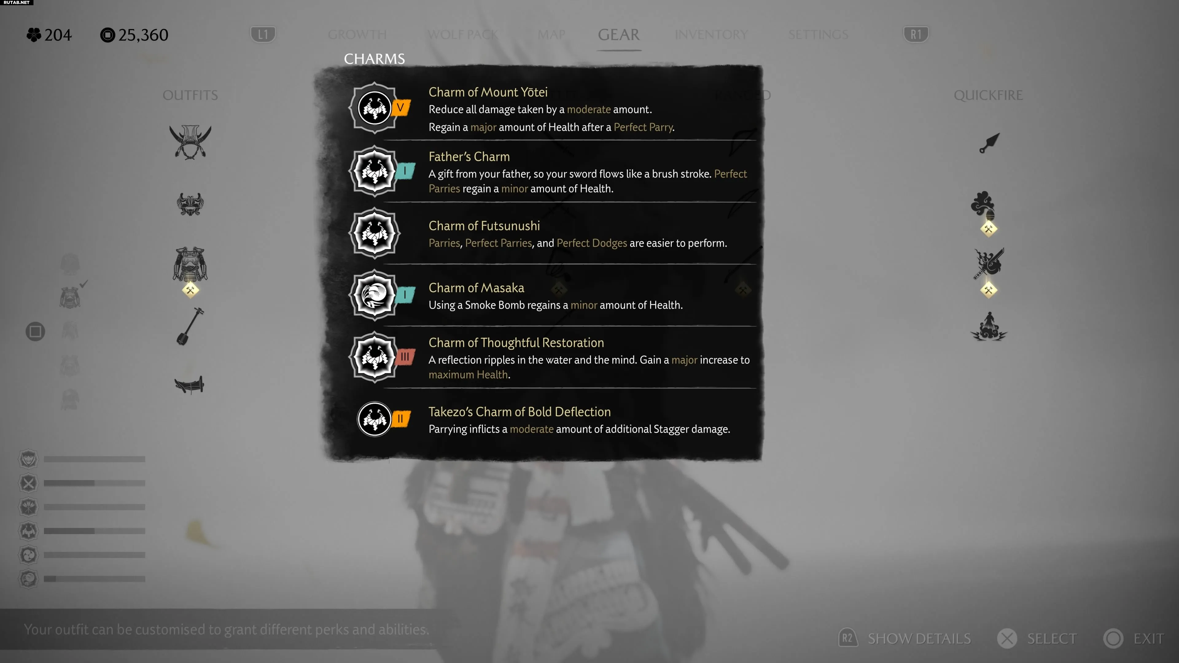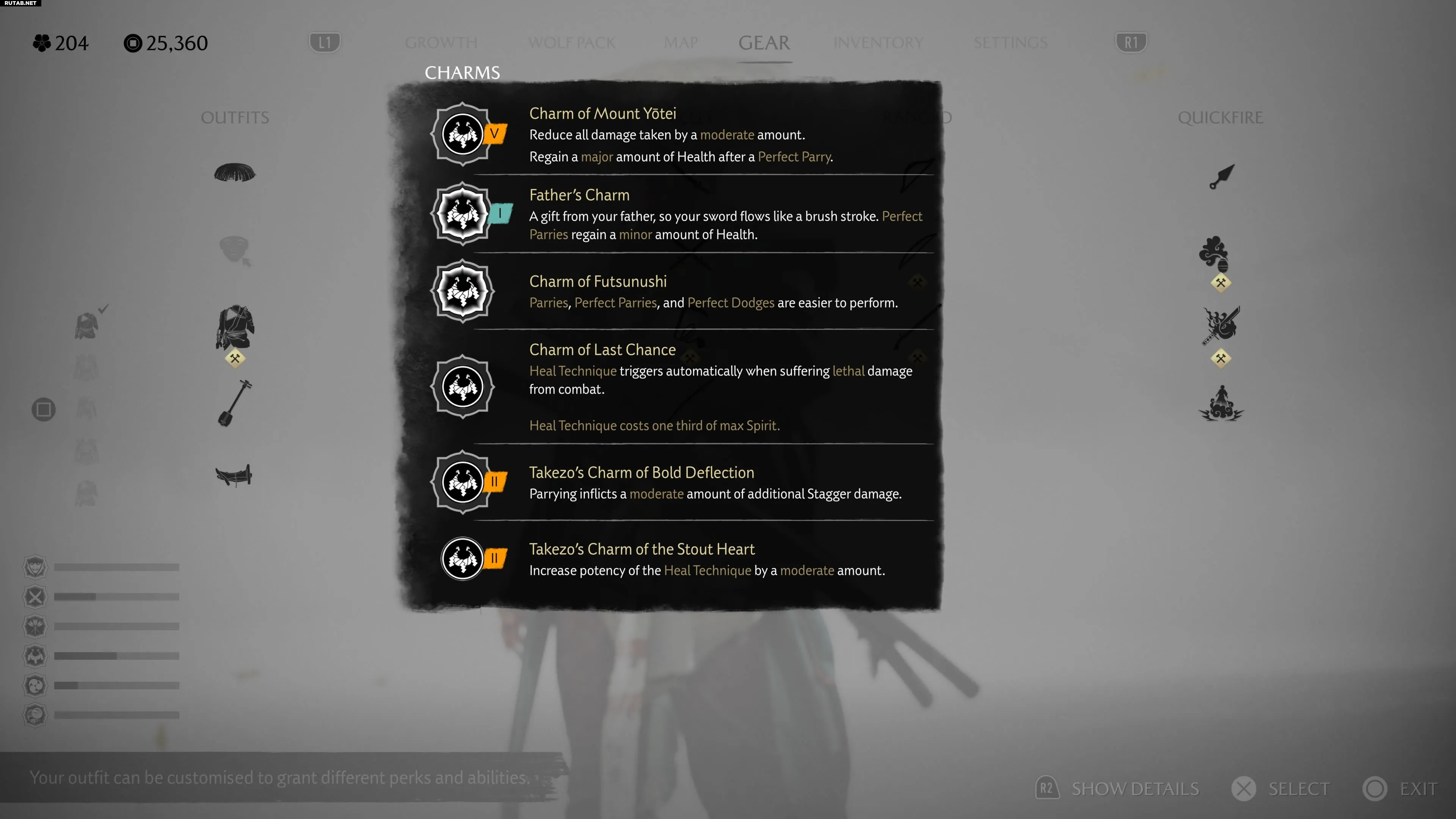 В качестве полезного дополнения можно использовать Амулет Устрашающей Защиты, который позволяет запугивать врагов после убийства одного из них идеальным парированием. Испуганные противники либо бросают оружие, либо сдаются, либо замирают в беззащитности, позволяя себя добить. Амулет Твёрдого сердца Такэдзо служит страховкой, позволяя быстро восстановить здоровье, если вы пропустили окно для идеального парирования.
