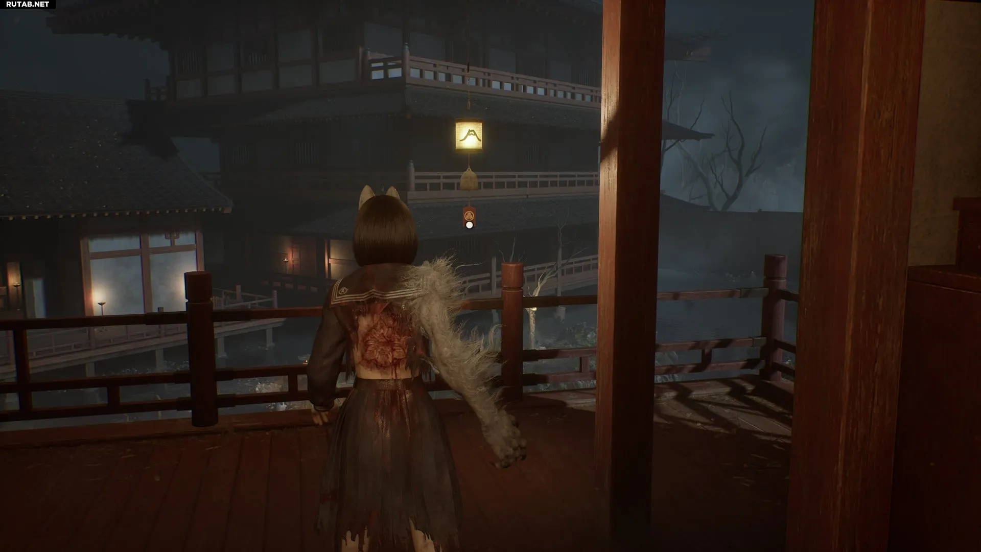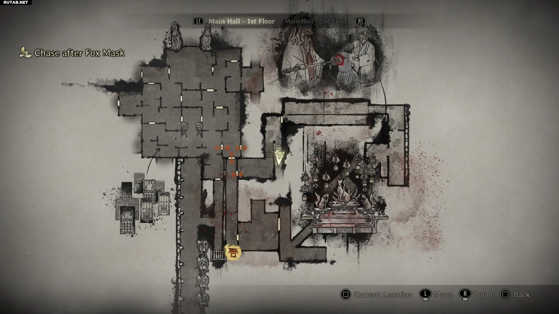 После этого необходимо добраться до зоны Главного зала, где Хинако в Мире святилища использует свои лисьи способности, чтобы перемещаться по огромному залу, преследуя Лисью маску.