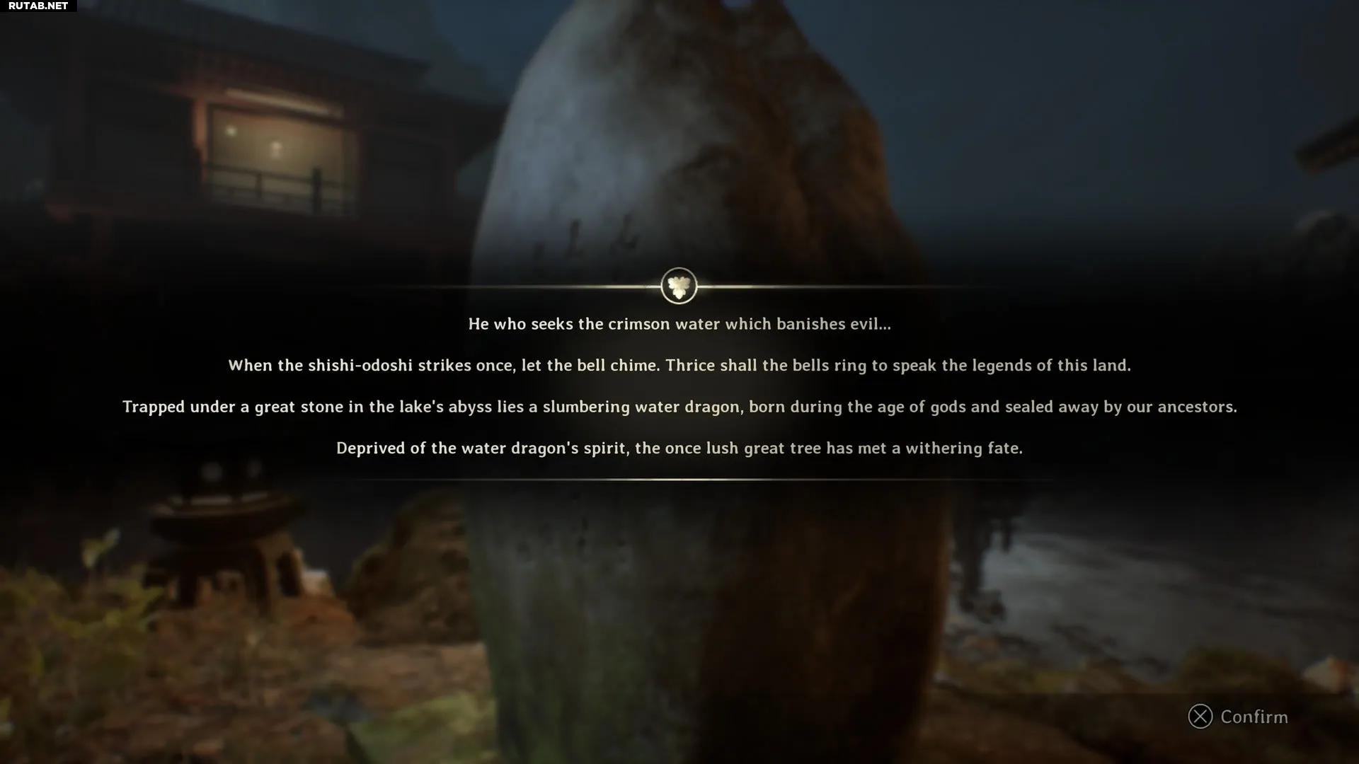 «Тот, кто ищет багровую воду, изгоняющую зло… Когда сяси-одоси ударит единожды, позволь колоколу прозвенеть. Трижды прозвенят колокола, чтобы поведать легенды этой земли. Под великим камнем в пучине озера покоится уснувший водяной дракон, рождённый в эпоху богов и запечатанный нашими предками. Лишённый духа водяного дракона, некогда пышный великий дерево обрёл увядающую судьбу».