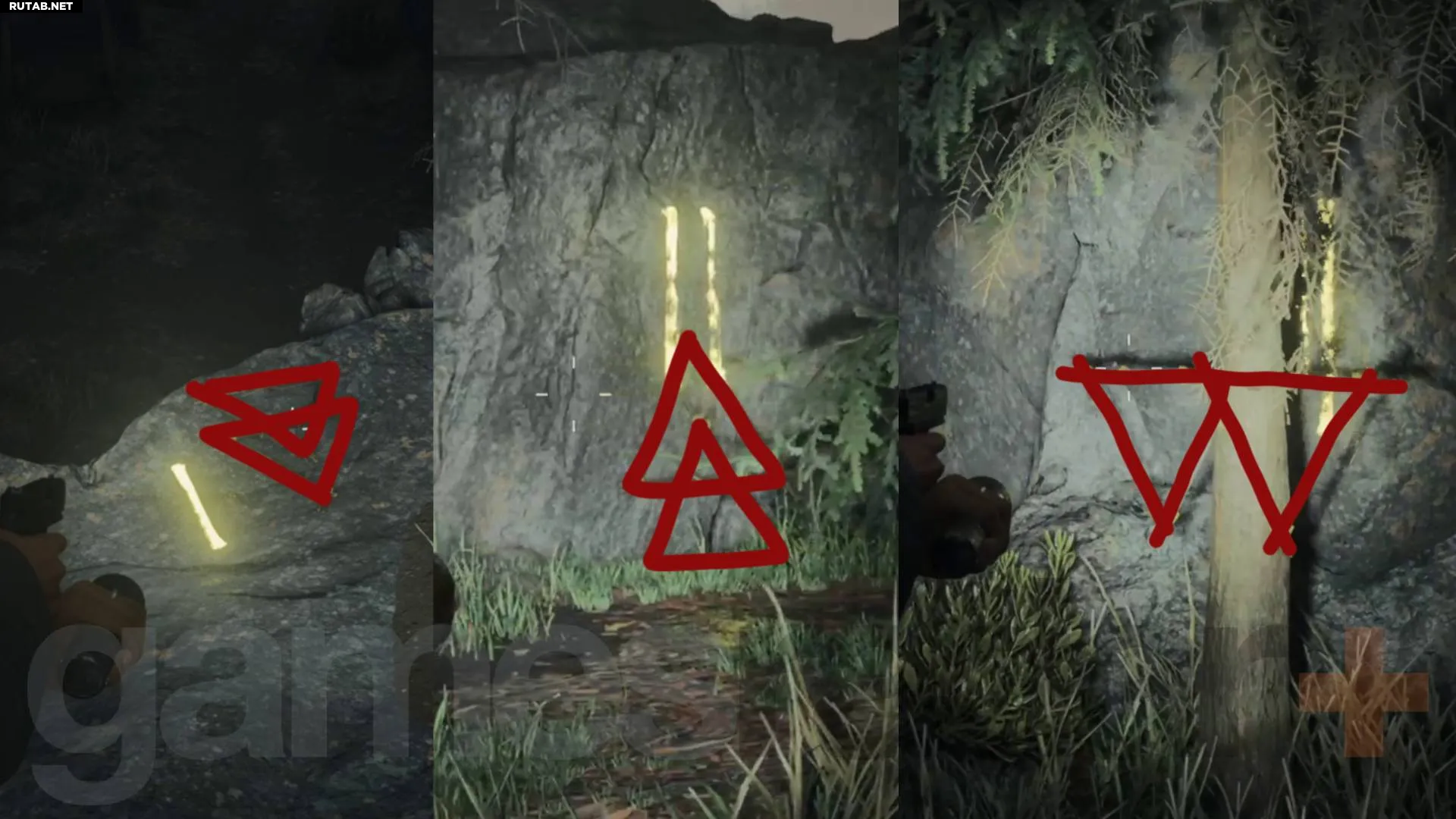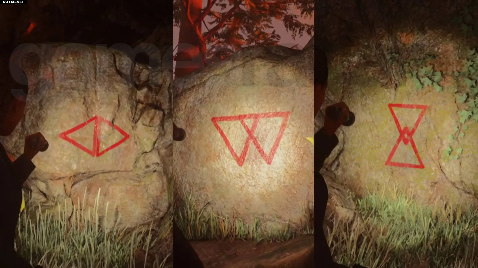 Для следующего культового тайника в глубине леса между Брайт-Фоллс и домом престарелых вам нужно использовать фонарик, чтобы следовать по маршруту с жёлтыми стрелками. По пути вы встретите красные треугольные символы культа, которые образуют код, необходимый для замка тайника — смотрите изображение ниже для символов. Этот тайник особенно полезен, так как вы получите ещё одно ракетное осветительное устройство, светошумовую гранату и дополнительные патроны для мощной охотничьей винтовки.