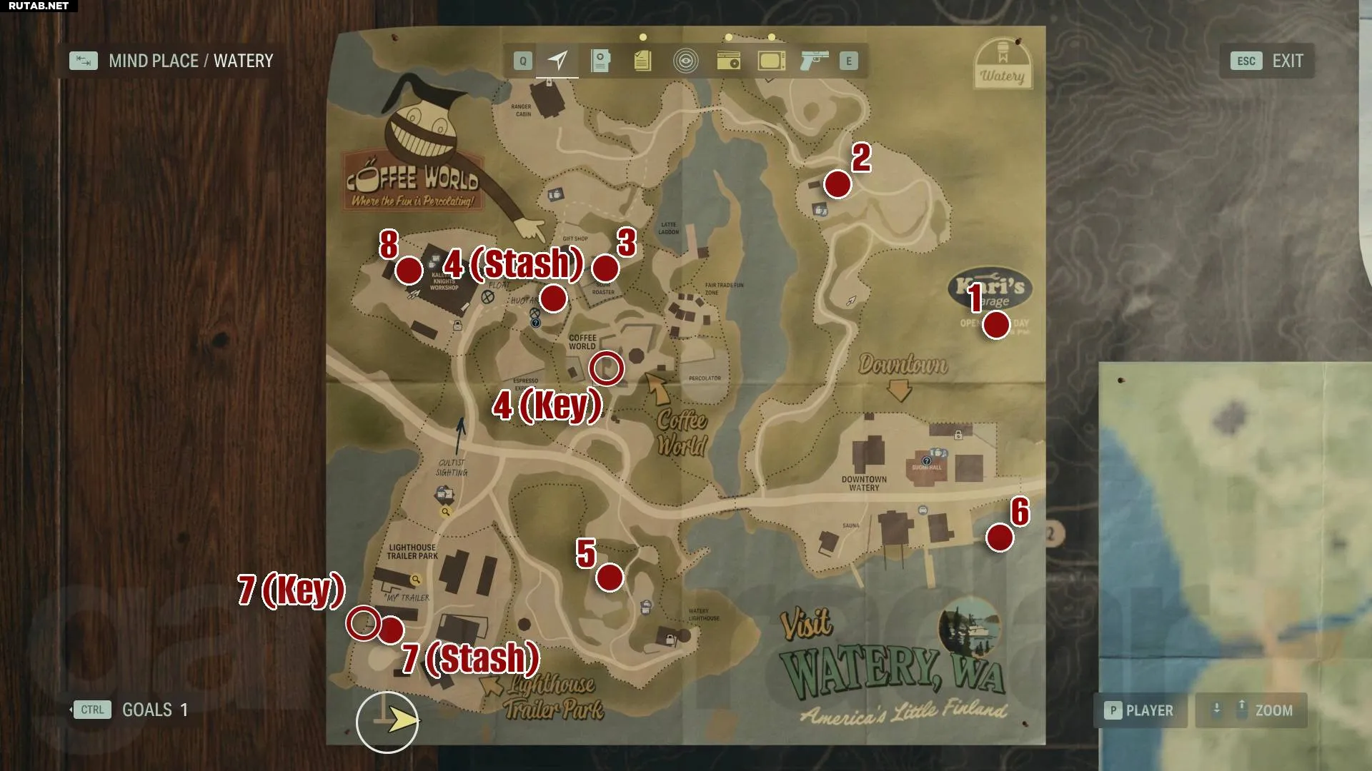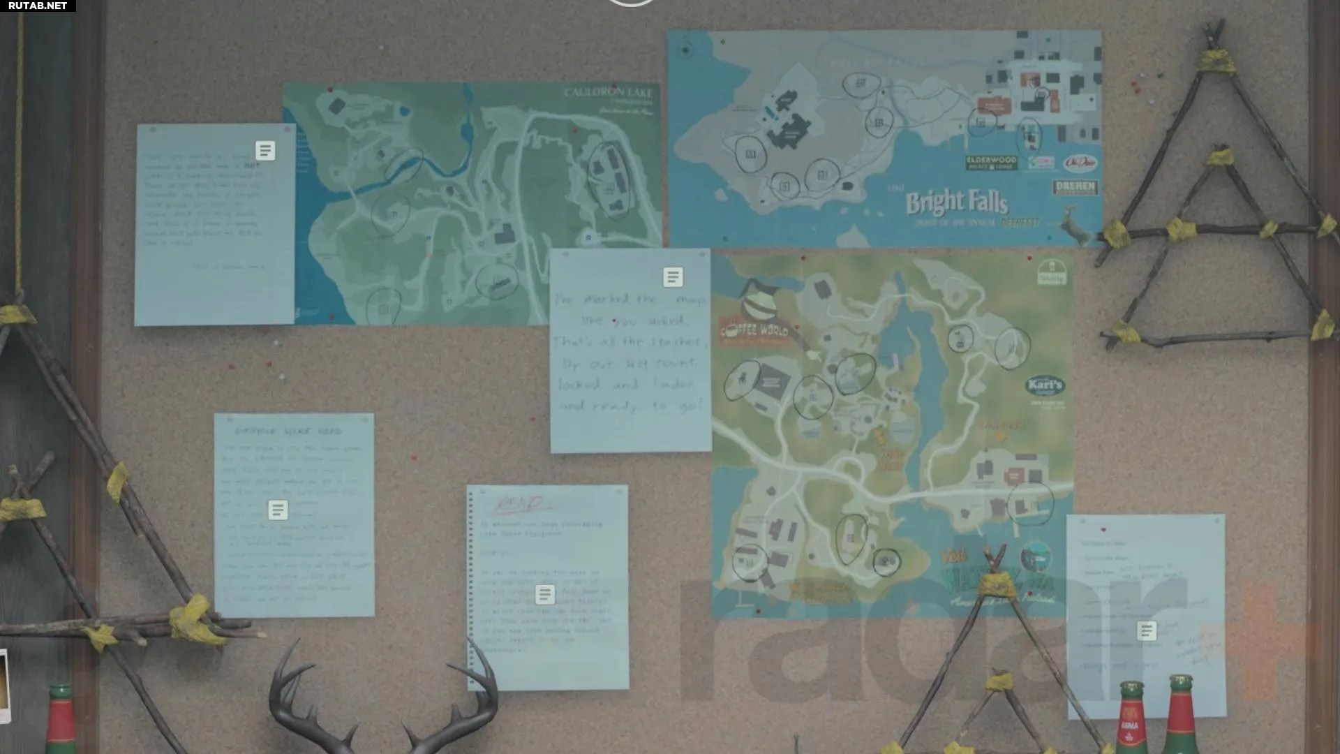 Во время первого визита в Брайт-Фоллс вы не найдёте тайников, но после прохождения первой секции с Аланом Уэйком вы вернётесь в город в роли Саги и сможете открыть один культовый тайник. Продолжайте расследование Саги и доберитесь до Уотери, чтобы разблокировать новые части карты Брайт-Фоллс и получить доступ к дополнительным тайникам, пока в конечном итоге не соберёте все девять.