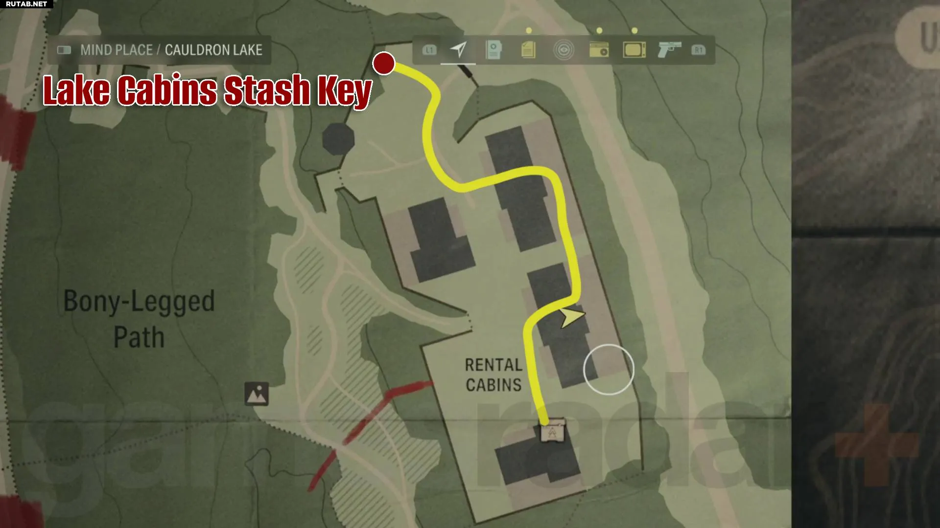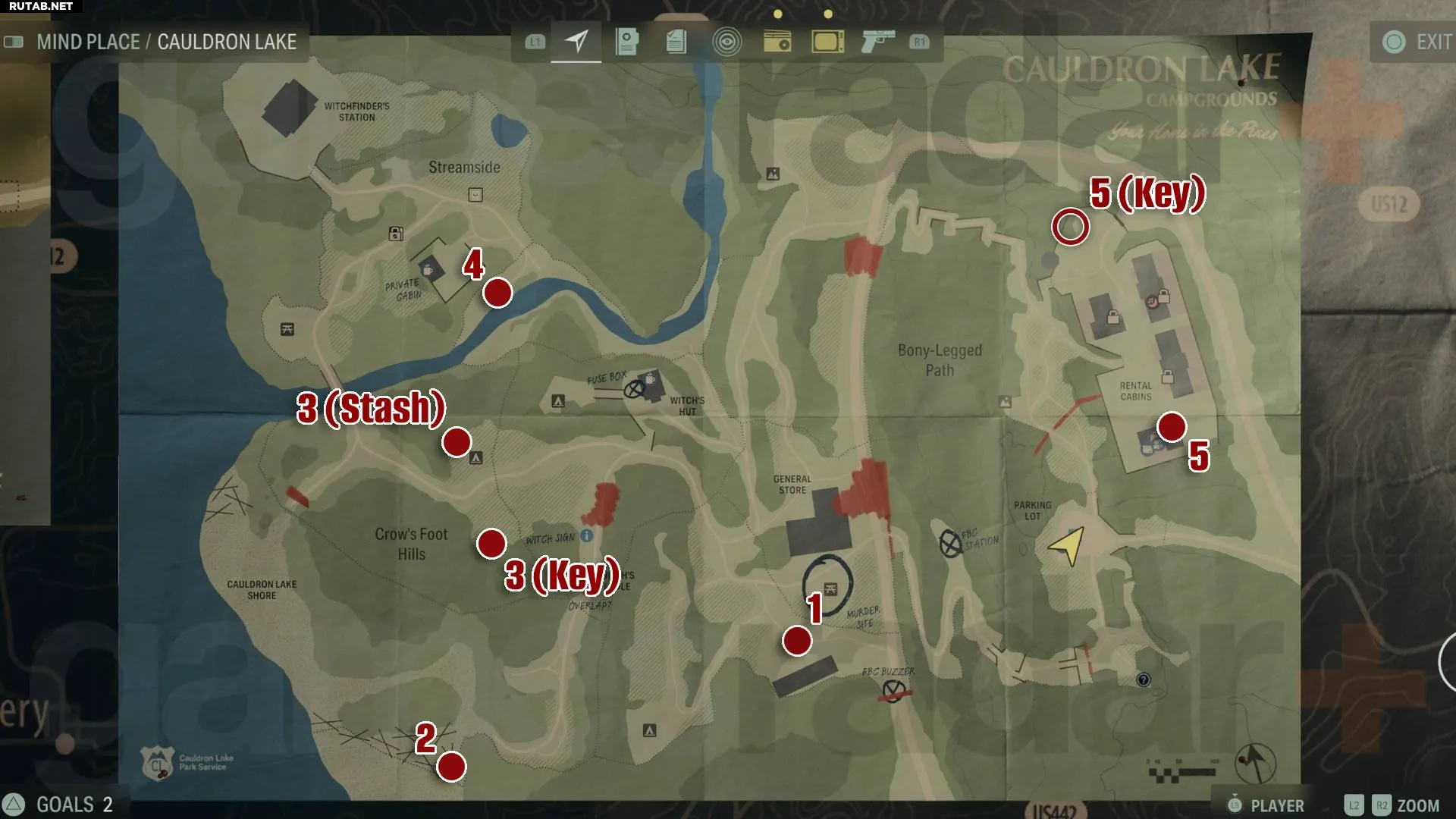 Начните с прохода через незапертый домик рядом с тем, где находится тайник, затем поверните налево и пройдите под поваленным деревом. Продолжайте движение через следующий домик до поляны, затем посмотрите направо и направляйтесь к ржавой машине. Подойдите к ней и посветите фонариком на деревья. Подойдите к дереву с отметкой «2» и поднимите ключ от тайника арендованных домиков за деревом.