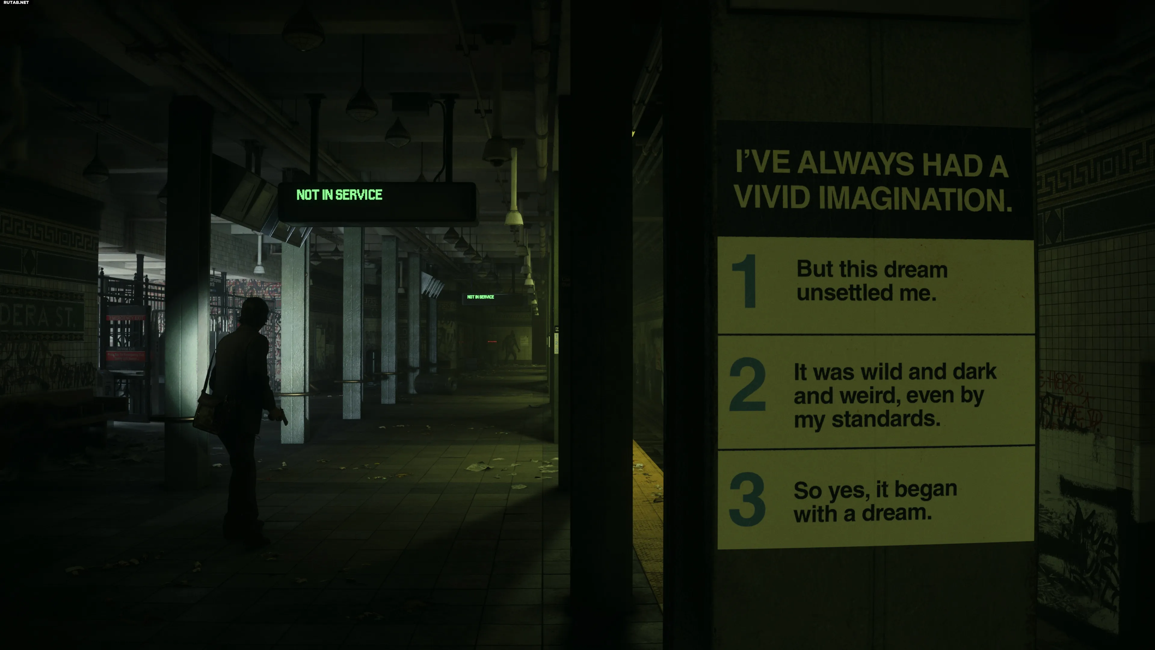 Алан заперт в закольцованном лабиринте Тёмного Места, и выжить здесь непросто. К счастью, вы можете находить скрытые Слова Силы на карте Нью-Йорка — просто направьте на них луч фонаря. После активации слова вы в любой момент можете вернуться в Комнату писателя, чтобы вложить очко улучшения.
