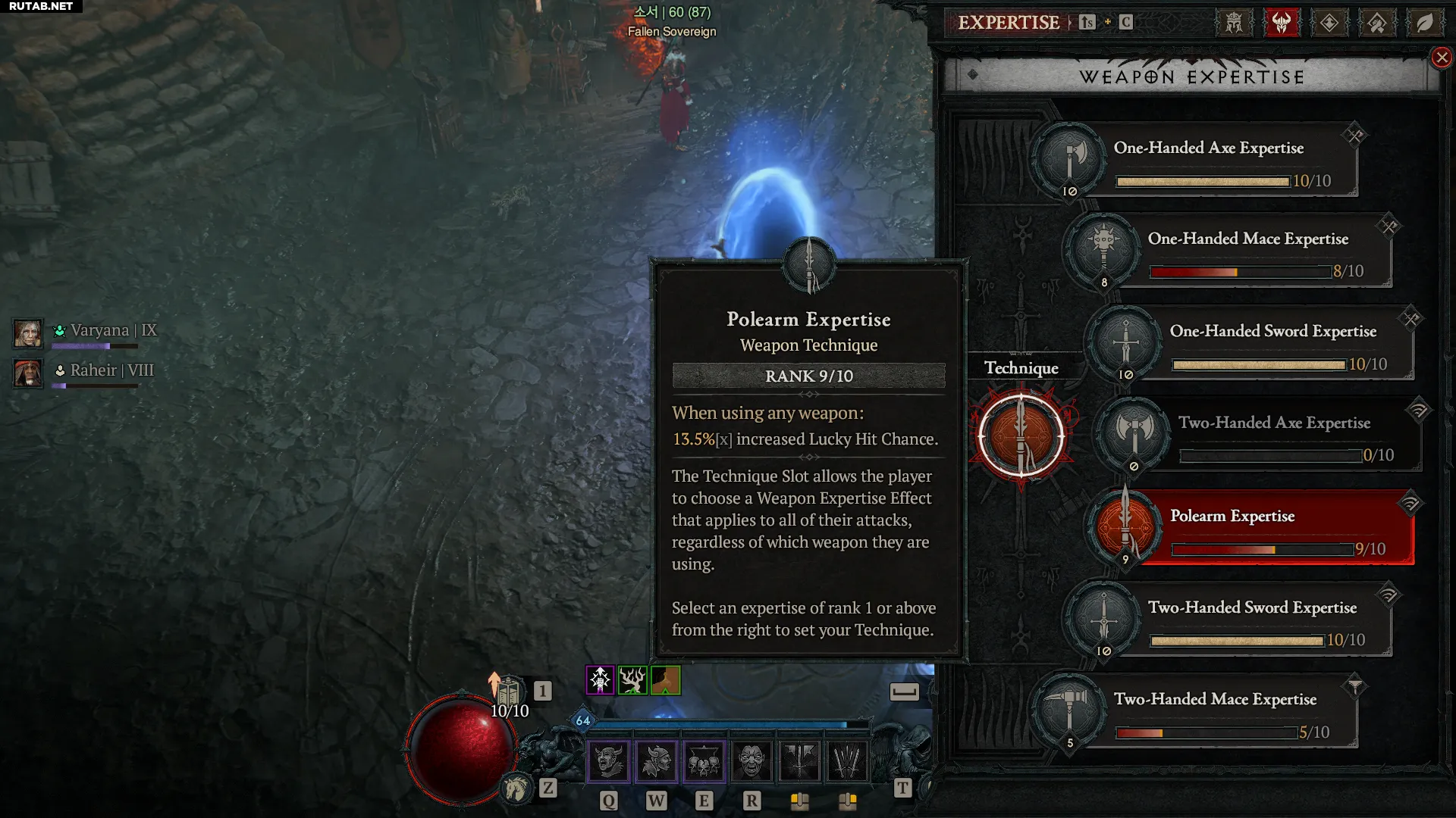 Для этого билда лучше всего подойдут одноручные мечи, поскольку высокая скорость атаки Неистовства хорошо сочетается с критами. В слот экспертизы 15-го уровня установите древковое оружие для дополнительного шанса удачного попадания. Это отлично сочетается с одним из хаос-перков, а также с любыми эффектами удачного попадания на снаряжении. Бонус 10-го уровня за древковое оружие также увеличивает урон, пока вы здоровы.
