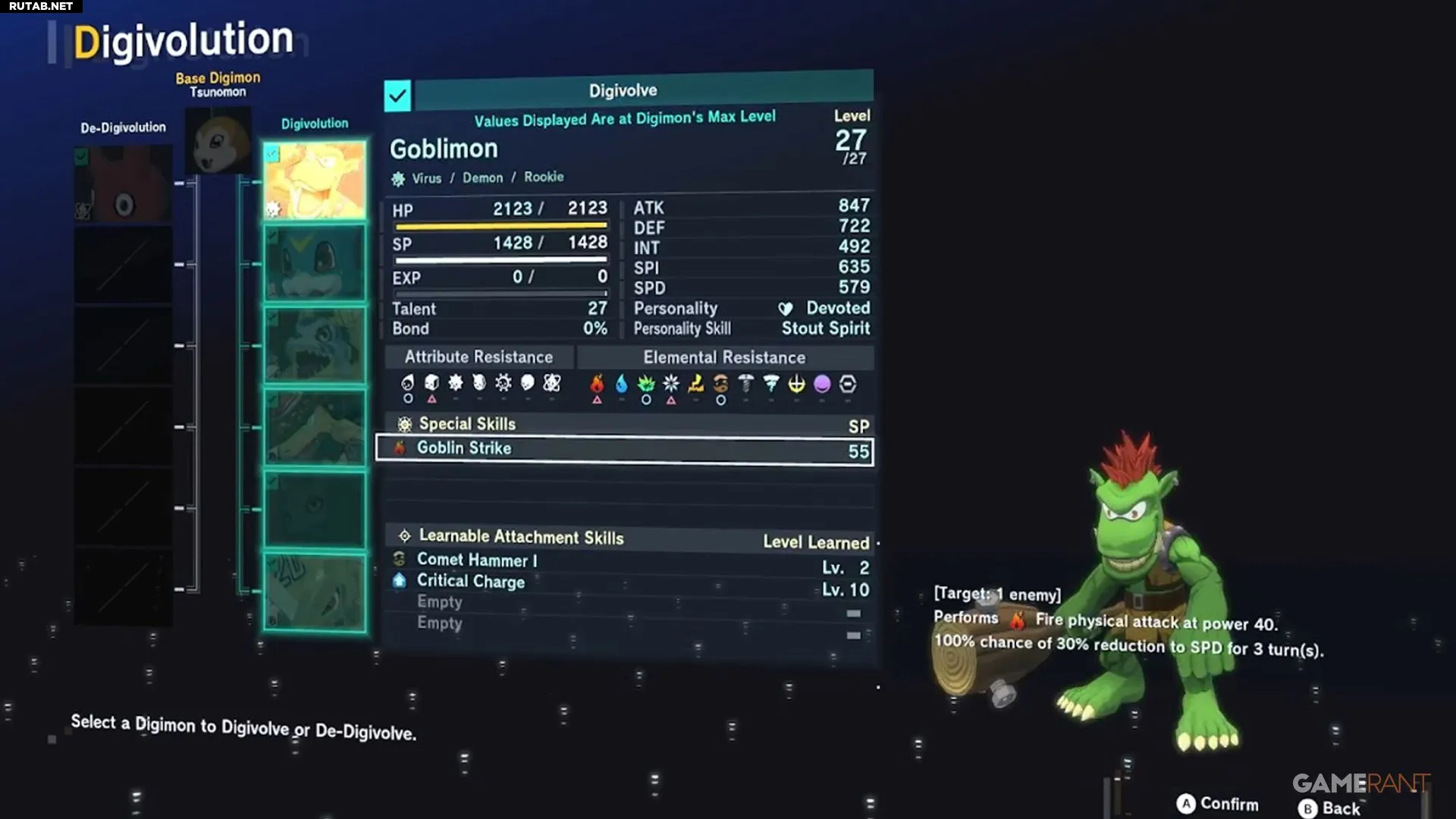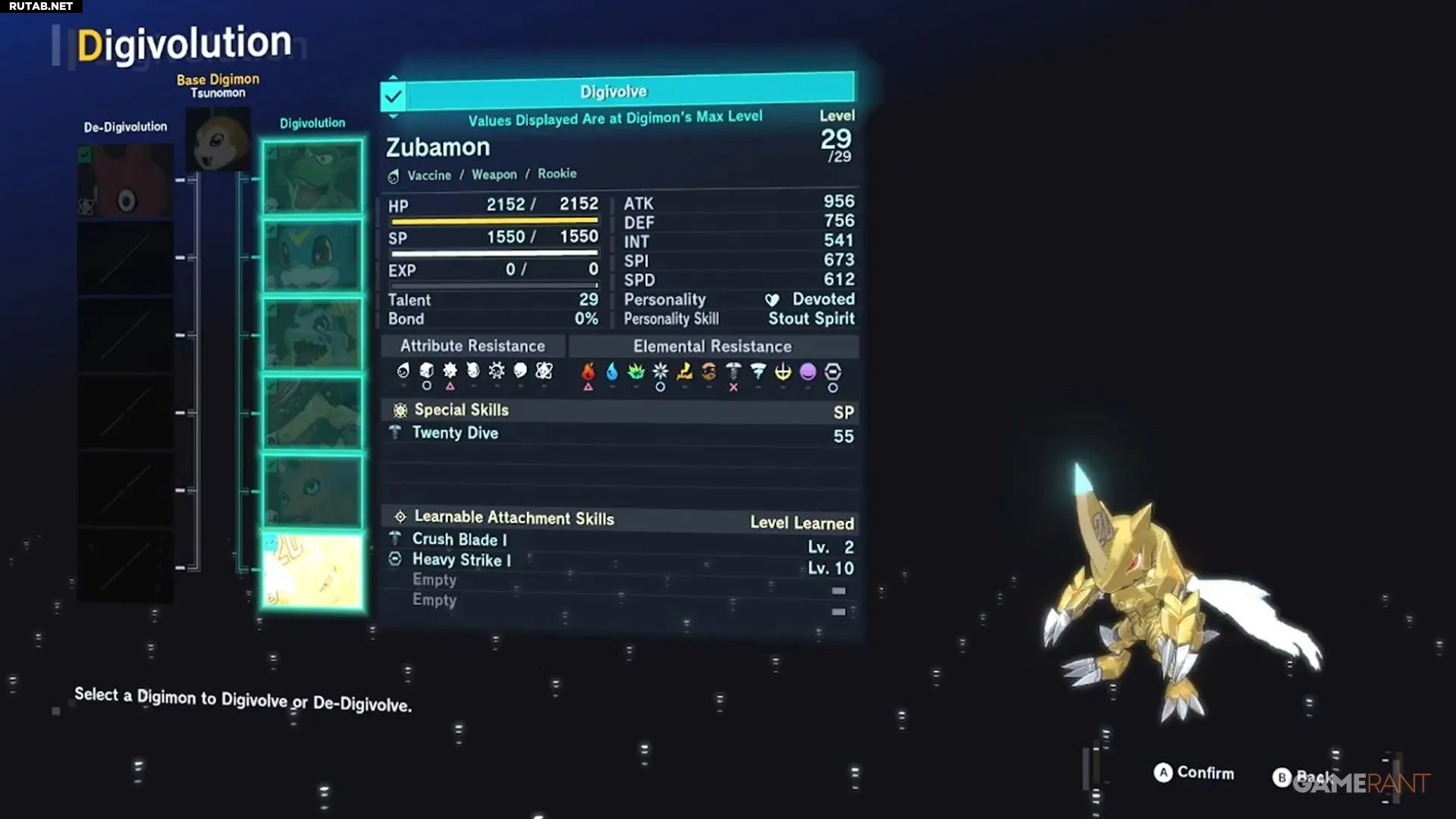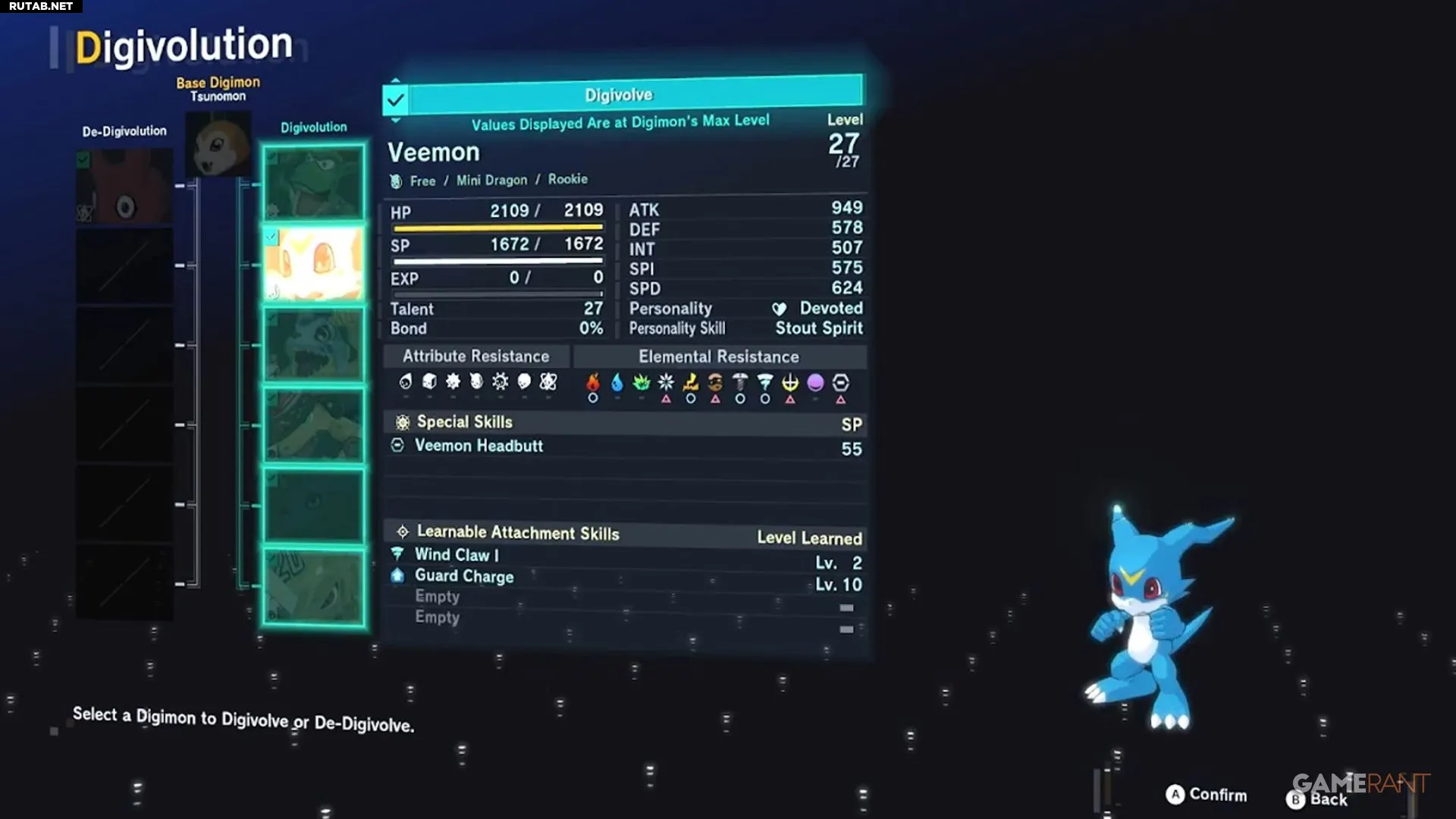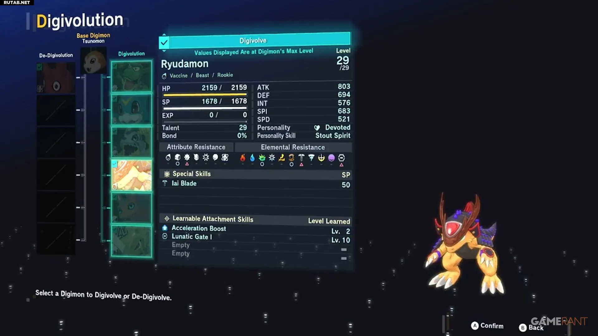 В игре показываются требования для эволюции Цуномона, которые обычно связаны с рангом Агента или характеристиками дигимона. Однако вы не увидите, в кого именно он эволюционирует (если только ранее не встречали этого дигимона).