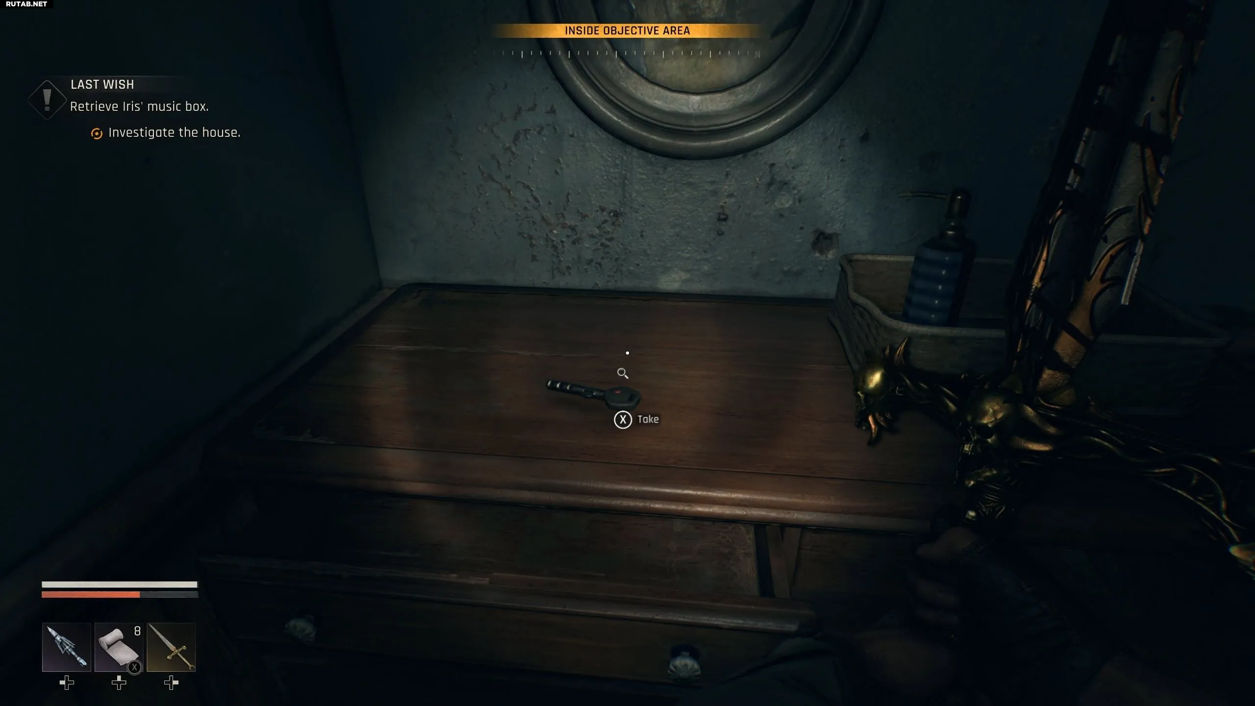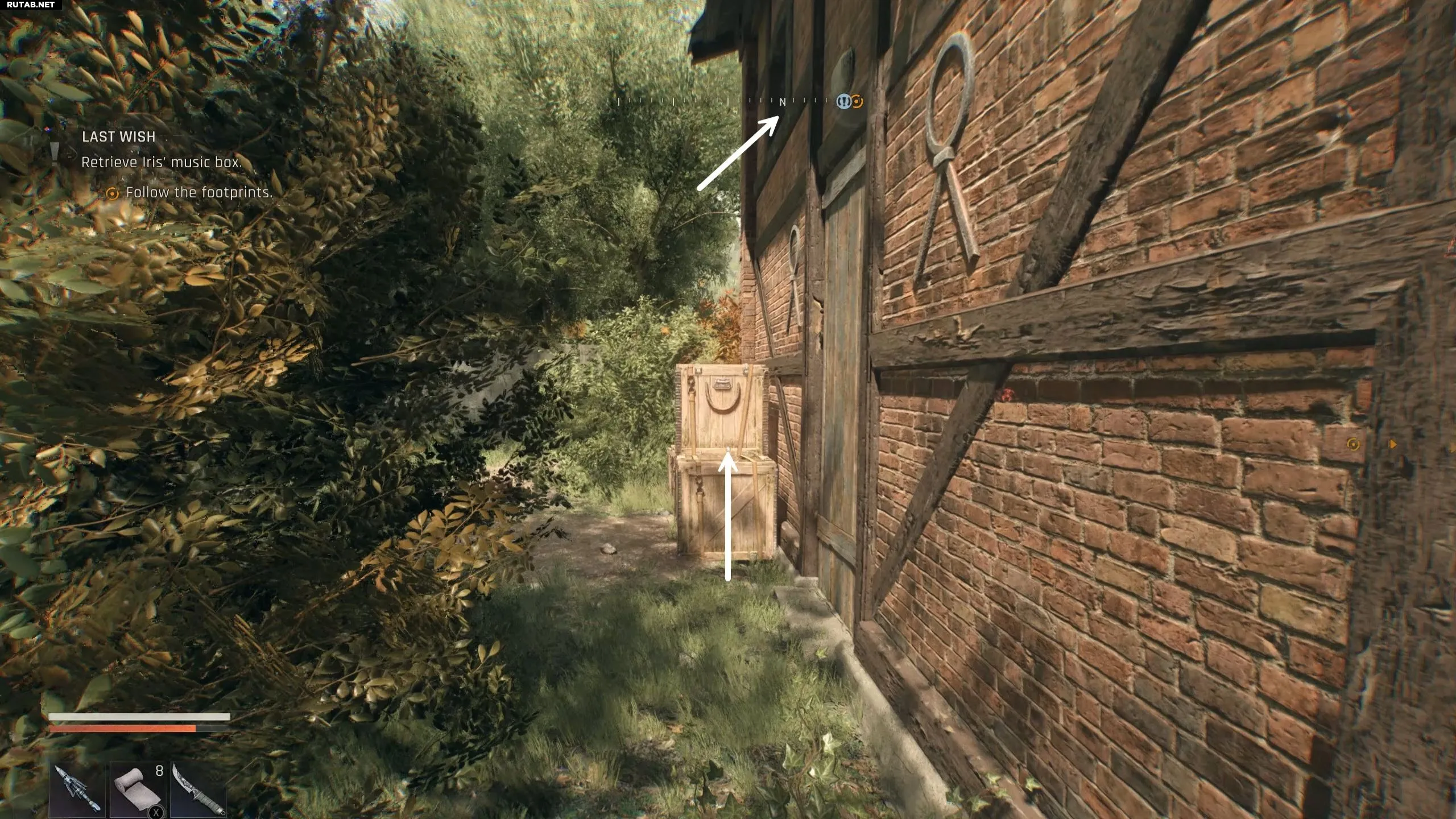 Следующая цель задания «Последнее желание» — найти музыкальную шкатулку для Ирис. Для этого вернитесь к дому Ирис и поднимитесь с восточной стороны, где увидите заколоченное окно. Разбейте деревянные планки оружием и войдите в дом.