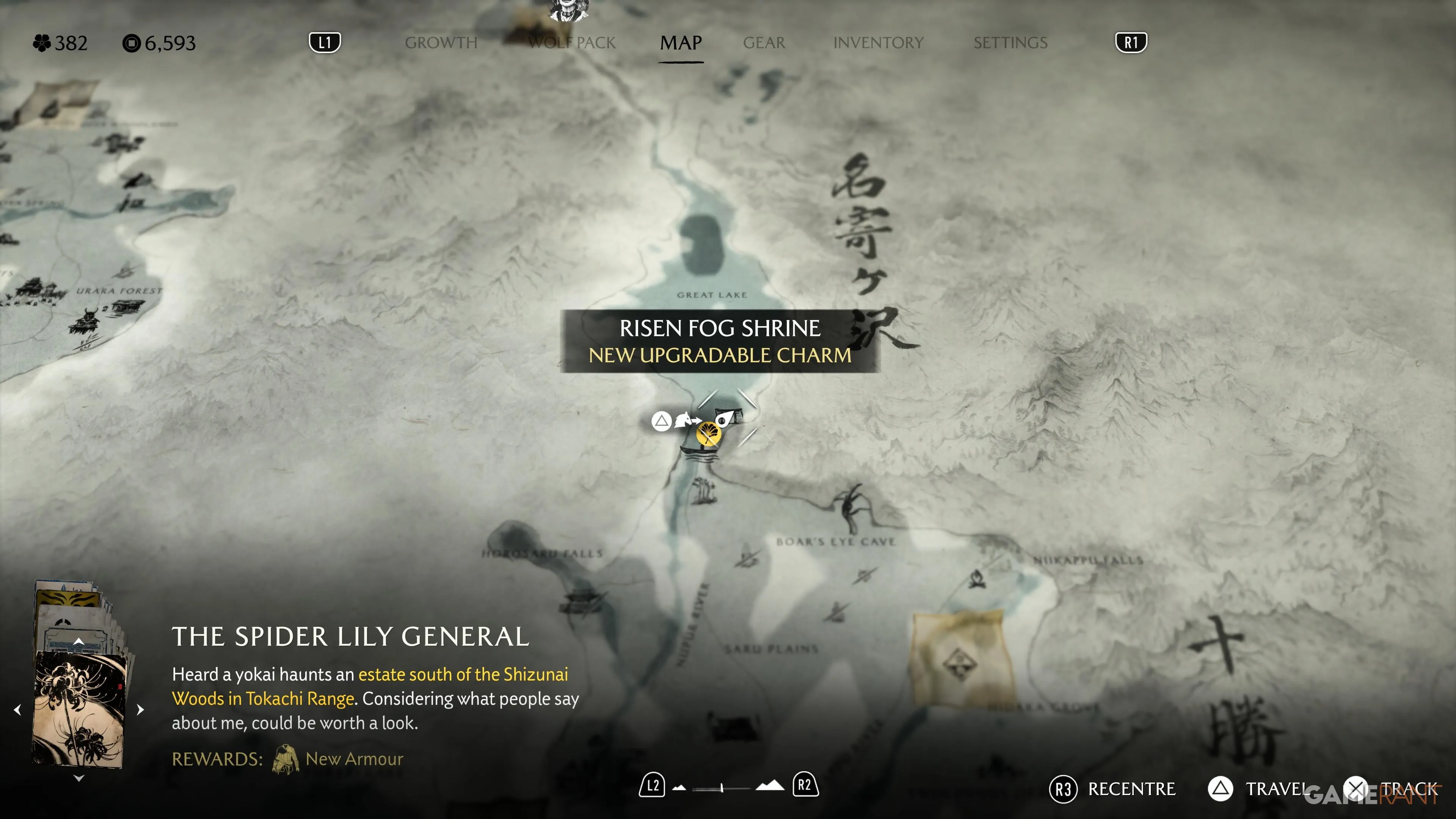 Это святилище находится к северо-западу от Страж-Леса. Здесь можно получить Талисман Масака, который восстанавливает здоровье при использовании Дымовых бомб. Это особенно полезный талисман на высоких уровнях сложности, помогающий выйти из рискованных ситуаций и восстановить потерянное здоровье. |