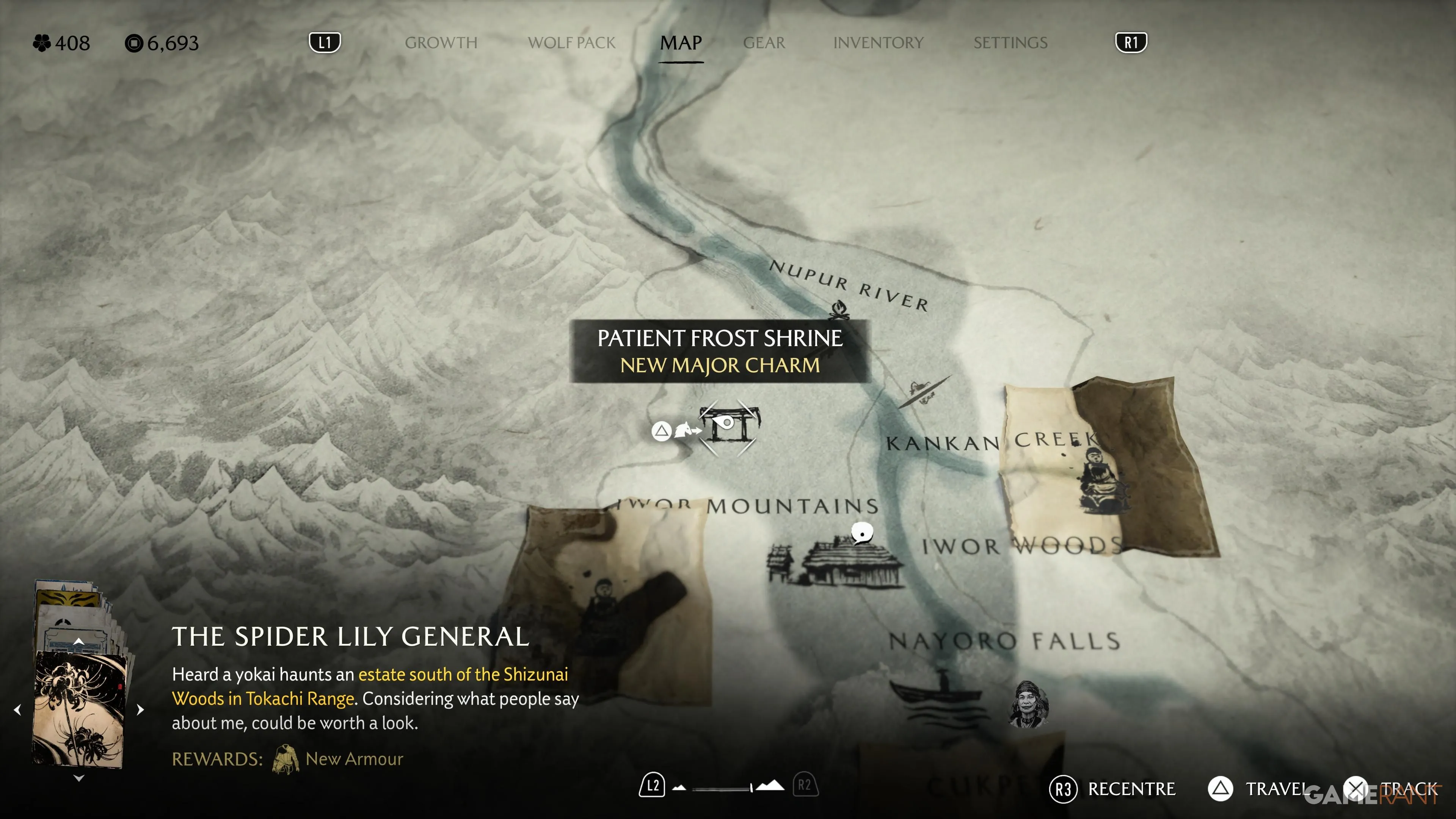 Это святилище находится к северо-востоку от Равнин Охара, за Деревом Мёртвого Человека, где обычно можно встретить Таро. Талисман позволяет воскресать с полным здоровьем при наличии открытого навыка Воля Онирё. |