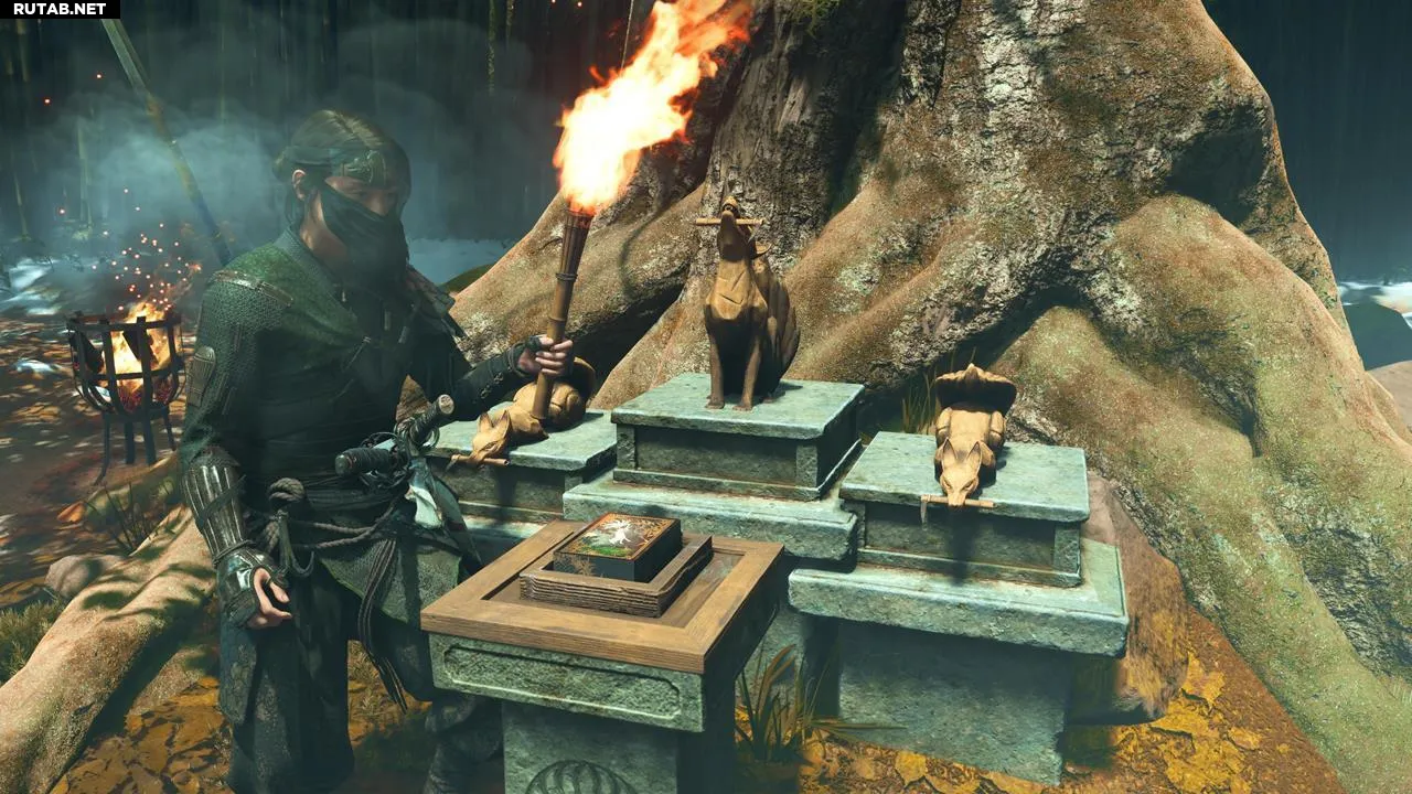 - На входе изучите позы статуй лис в каждом наборе, затем посмотрите на позу статуи лисы на скале в центре каждого водоема. Используйте факел, чтобы зажечь только правильные фонари.