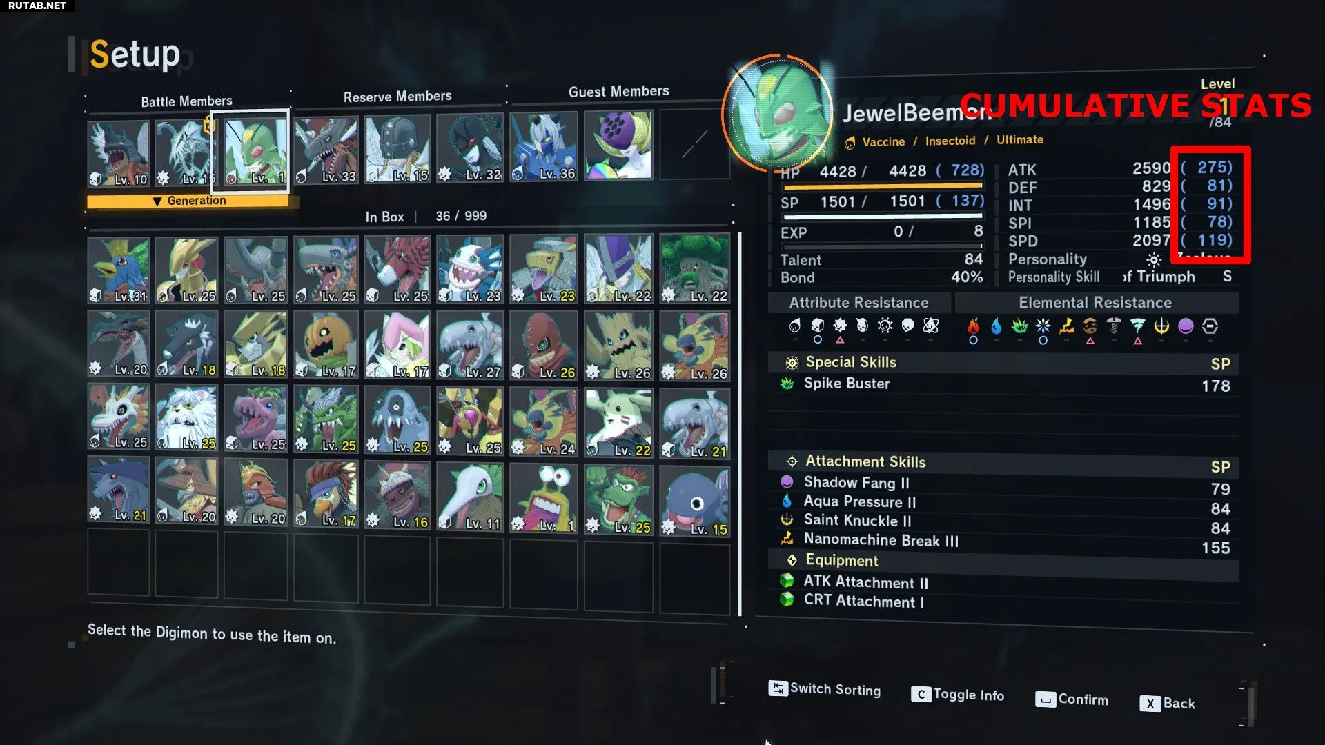 Как уже упоминалось, Накопительные характеристики — это показатели, которые передаются при дигиволюции и де-дигиволюции. Они отображаются в виде синих чисел рядом с базовыми характеристиками дигимона. Игроки могут напрямую увеличивать Накопительные характеристики, используя усиливающие предметы. Кроме того, процент характеристик, которые дигимон получает за повышение уровня и тренировки на Диги-ферме, также добавляется к его Накопительным характеристикам при эволюционных преобразованиях. Именно этот механизм является ключом к созданию максимально сильных существ.