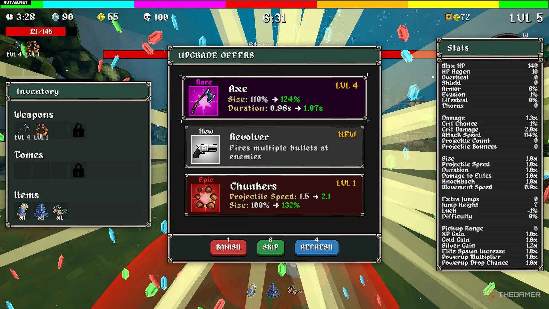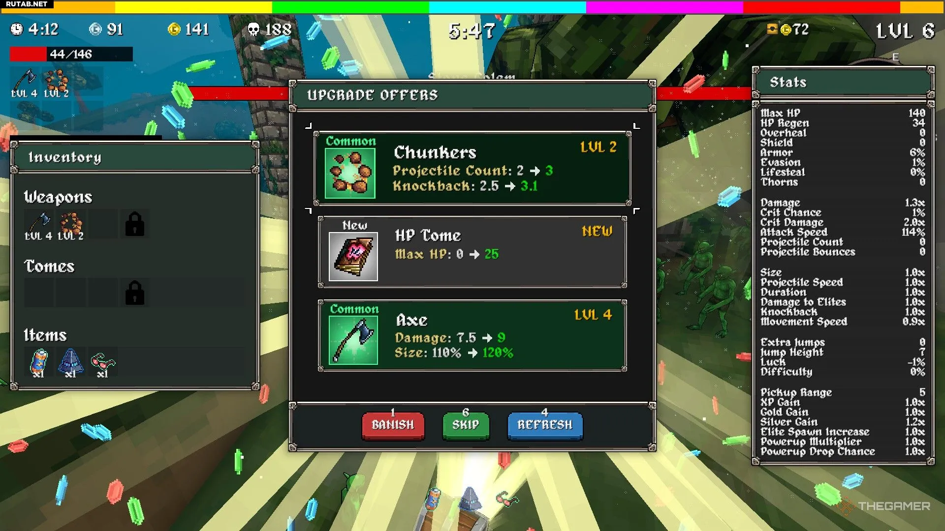 - Оставайтесь в самой гуще толп врагов, чтобы максимизировать урон вращающегося топора. Ваше пассивное шкалирование облегчает поздние бои, если вы переживете ранние волны.
