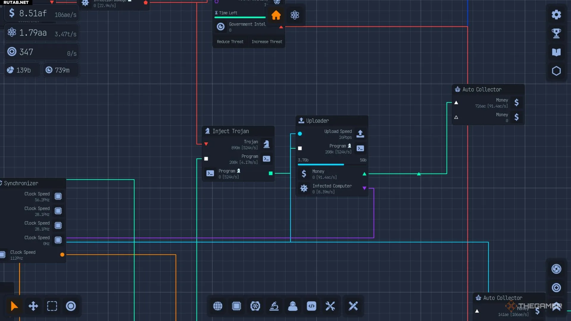 Когда файл с прикреплённым трояном продаётся, он генерирует новый ресурс под названием «Заражённые компьютеры». Их можно отправить в узел «Дренаж», который подключается к Сети, Процессору или GPU для повышения их производительности. Чем больше Заражённых компьютеров подключено к узлу Дренажа, тем выше будет множитель производительности.