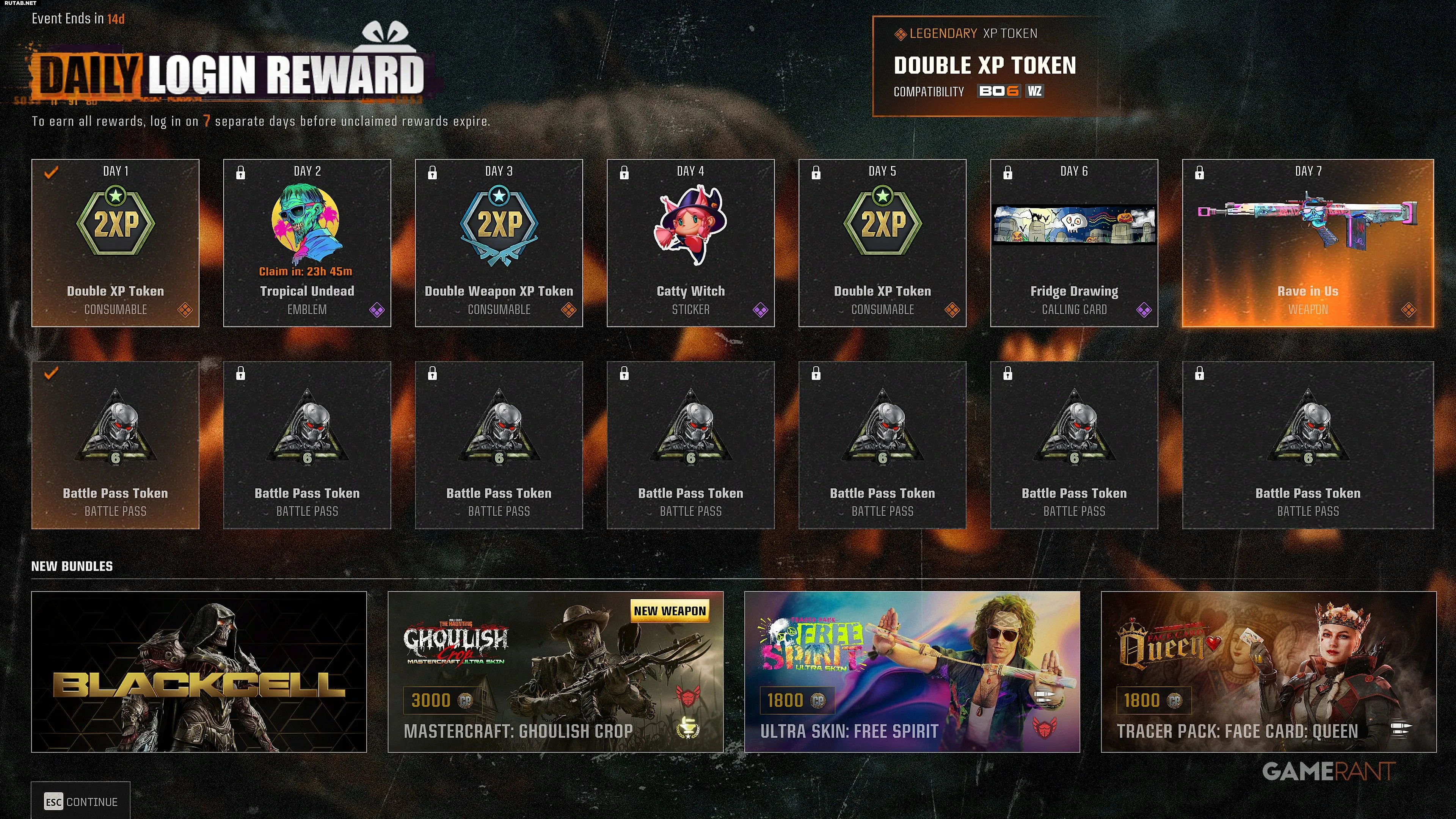 Всего доступно семь наград за ежедневный вход. Каждая из них включает в себя бесплатный жетон боевого пропуска, который можно потратить на разблокировку предметов из боевого пропуска 6 сезона. Эти награды доступны до 23 октября, 9:00 по тихоокеанскому времени. Для получения всех наград необходимо заходить в Black Ops 6 или Warzone в течение семи отдельных дней.