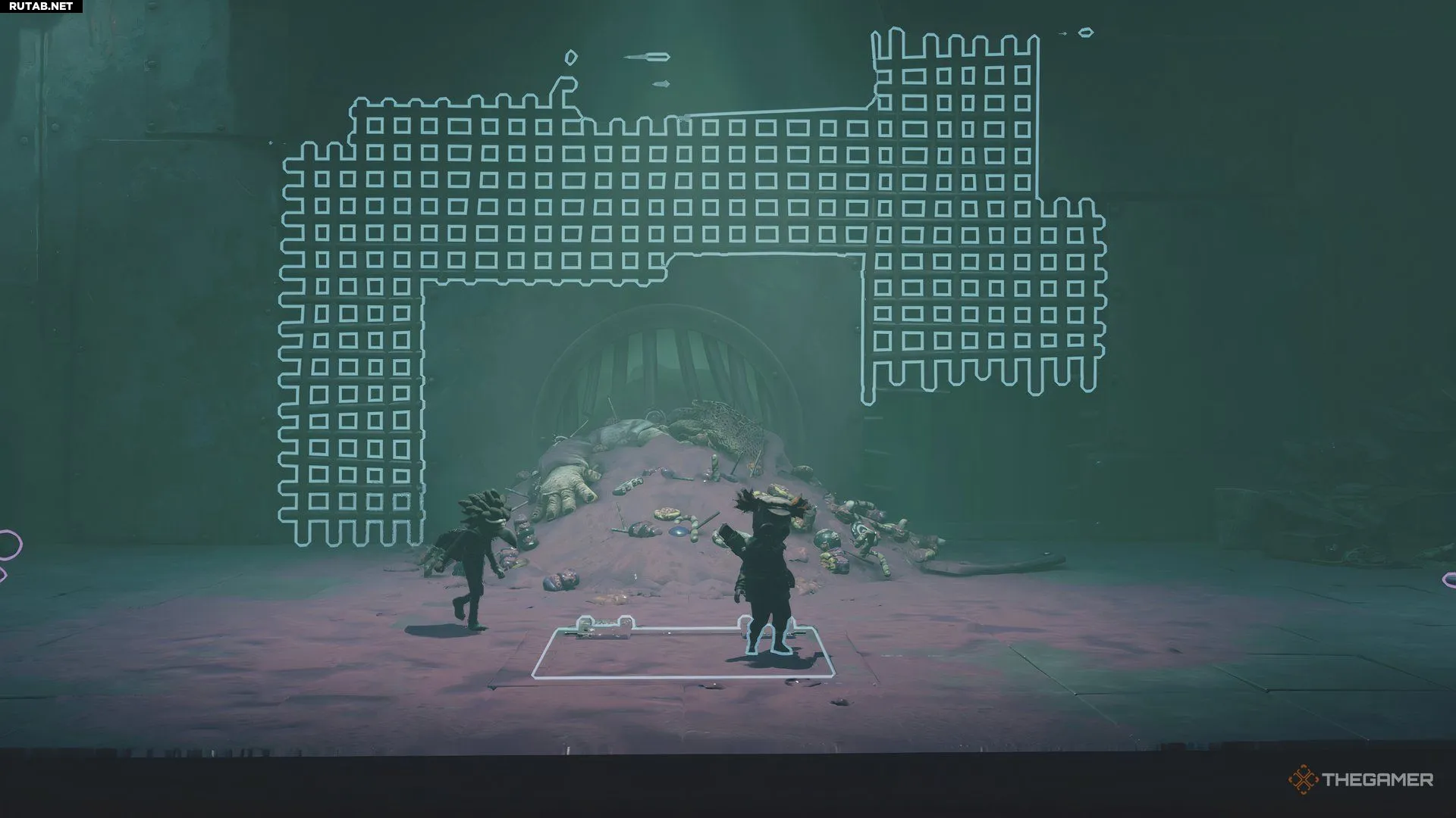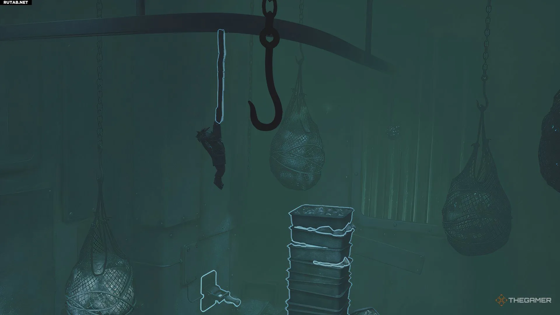В комнате слева от лифта с грудой предметов посередине один игрок должен забраться на эту кучу, а другой — дёрнуть рычаг в дальнем левом углу. Это активирует крюки, которые начнут двигаться над грудой; игрок наверху может подпрыгнуть и ухватиться за них.