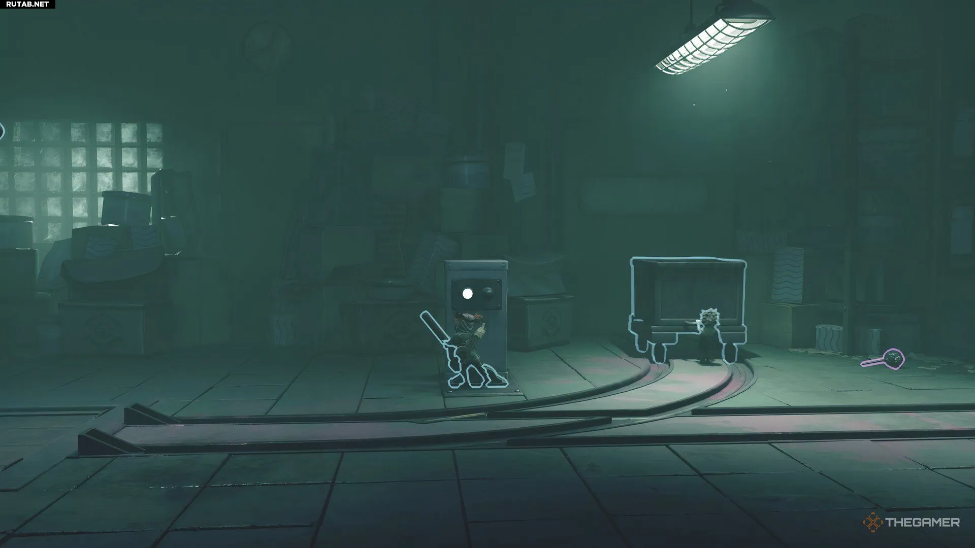Вскоре после сбора третьей куклы вы попадёте в комнату с картотечными шкафами. Один игрок должен открыть нижний ящик, чтобы подсадить другого в комнату с разбитыми мониторами. Сдвиньте монитор с пола направо, чтобы заблокировать закрытие двери.
