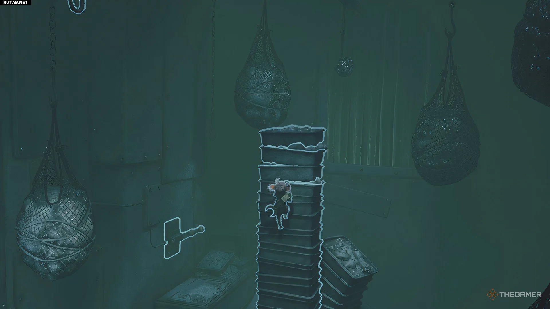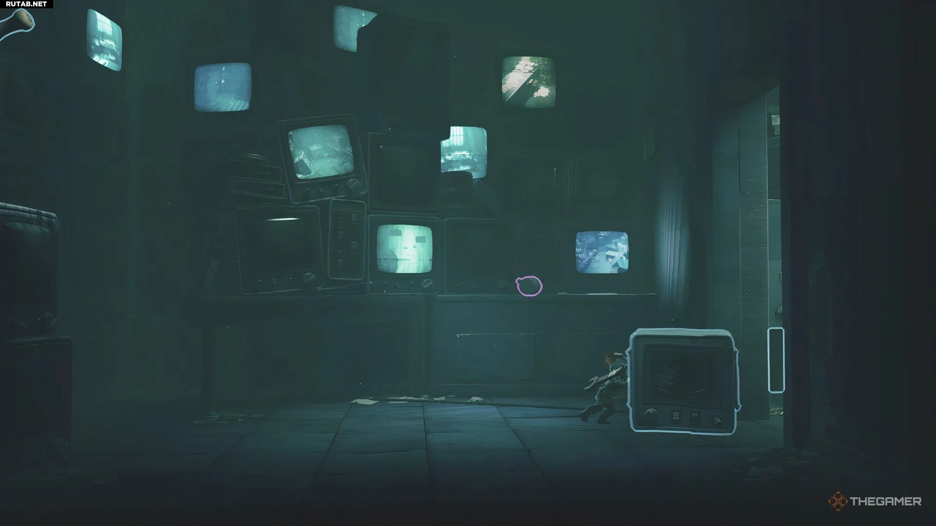Вернитесь в коридор, где дверь справа постоянно закрывалась при вашем приближении — теперь вы сможете пройти через неё. Вы окажетесь над другим помещением, где мельком увидите, как Надзирательница проходит мимо и паникует из-за камер.