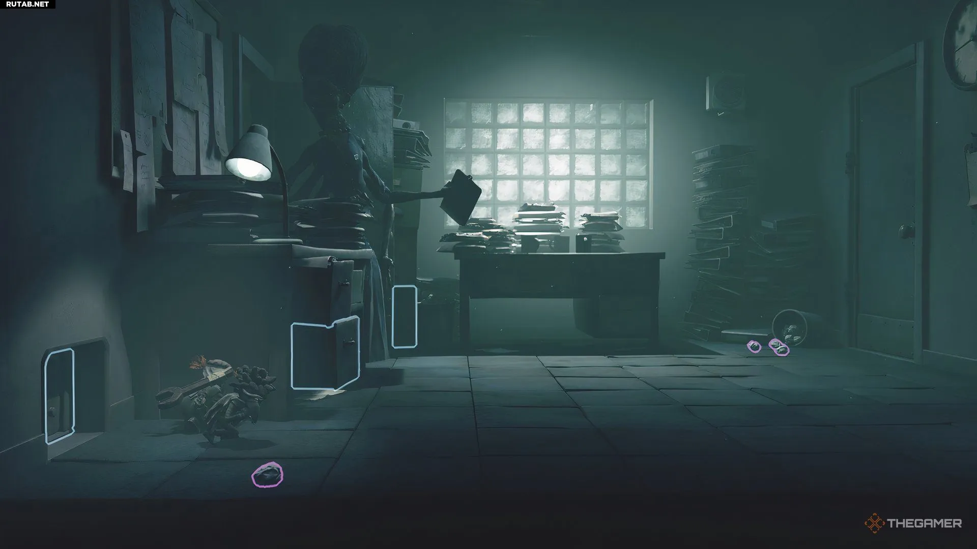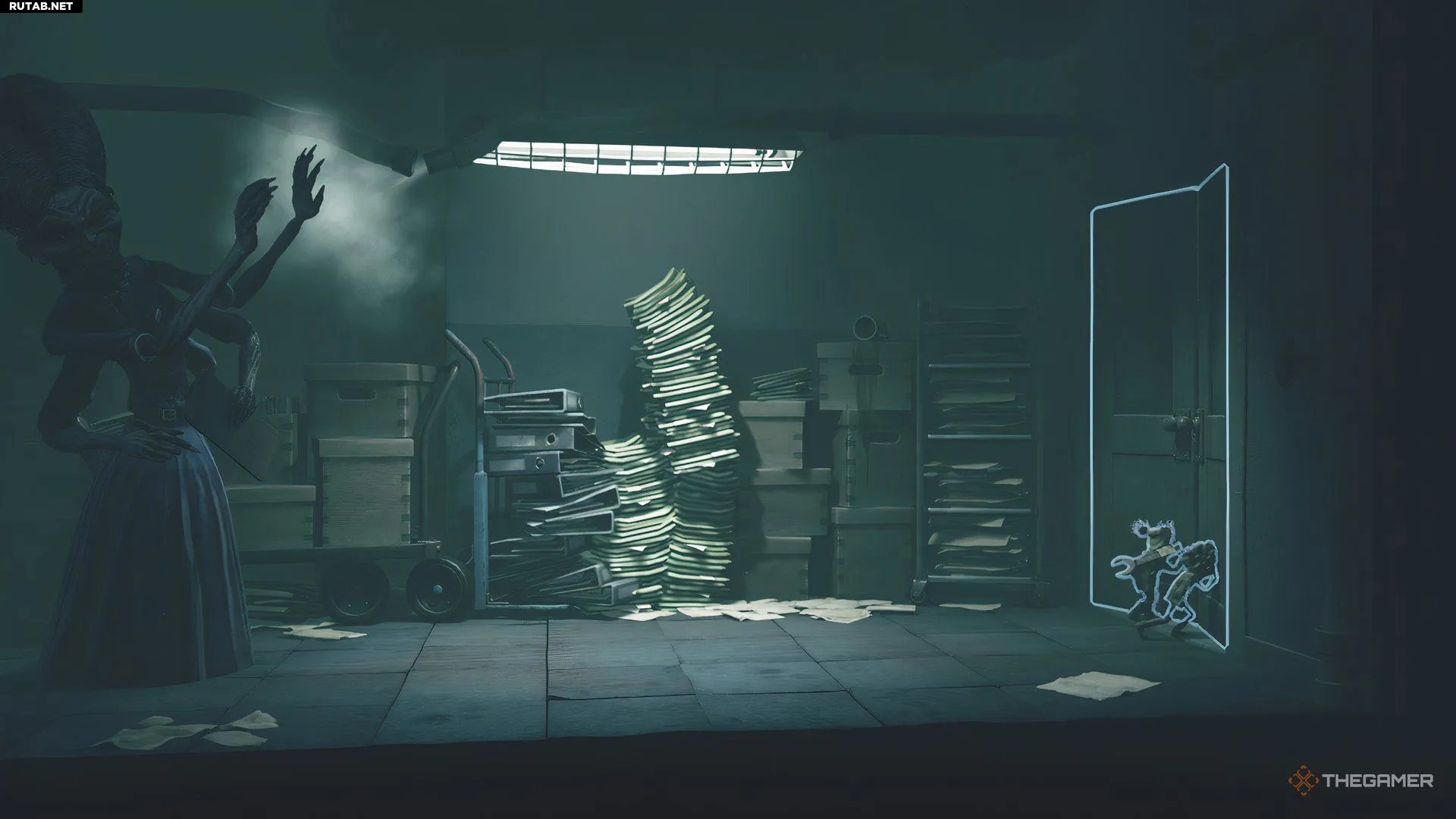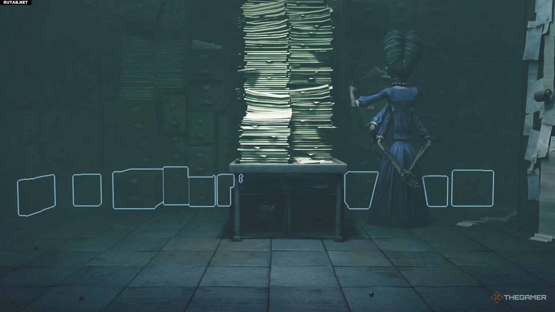 Следующая комната будет представлять собой большое помещение с картотечными шкафами. Как и в офисе, Надзирательница войдёт в комнату и начнёт медленно ходить туда-сюда между левой и правой сторонами. Вам нужно будет применить ту же тактику скрытного перемещения, что и раньше: сначала доберитесь до середины комнаты, а затем до дальней правой стороны, где вы найдёте лестницу.
