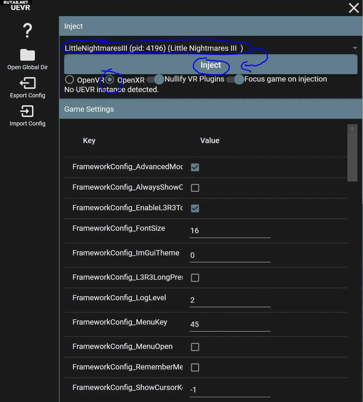 4) После полной загрузки игры (главное меню или уровень) сверните её сочетанием Alt+Tab, откройте папку с распакованным модом UEVR, щелкните правой кнопкой мыши на UEVRInjector.exe и запустите от имени администратора (это обязательно). В открывшемся окне инжектора выберите Little Nightmares 3 из выпадающего списка, убедитесь, что ниже кнопки инжекции выбран OpenXR, и нажмите Inject.