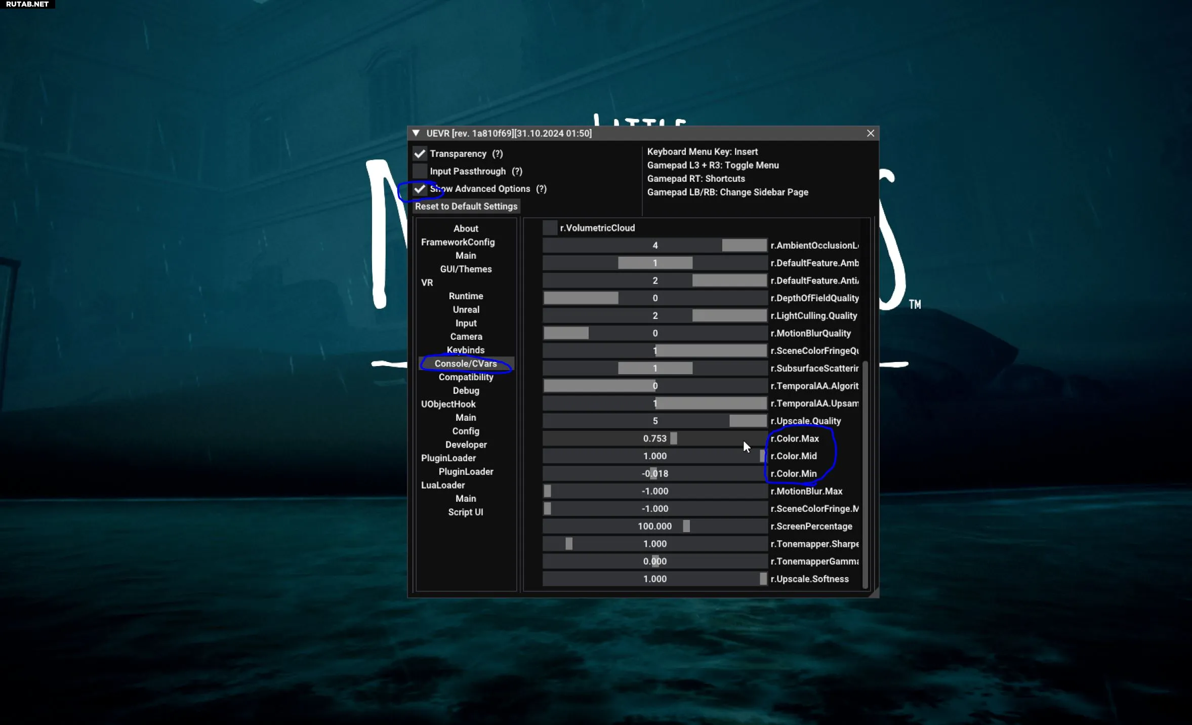 r.color.min— настраивает уровень черного. Отрицательные значения «схлопывают» тени, добавляя изображению контраста и насыщенности. Будьте осторожны — этот параметр очень чувствителен. Я уменьшил его ровно настолько, чтобы самые темные участки игры совпали по тону с черным фоном вокруг виртуального экрана. В темных сценах граница экрана становится невидимой, что усиливает погружение!