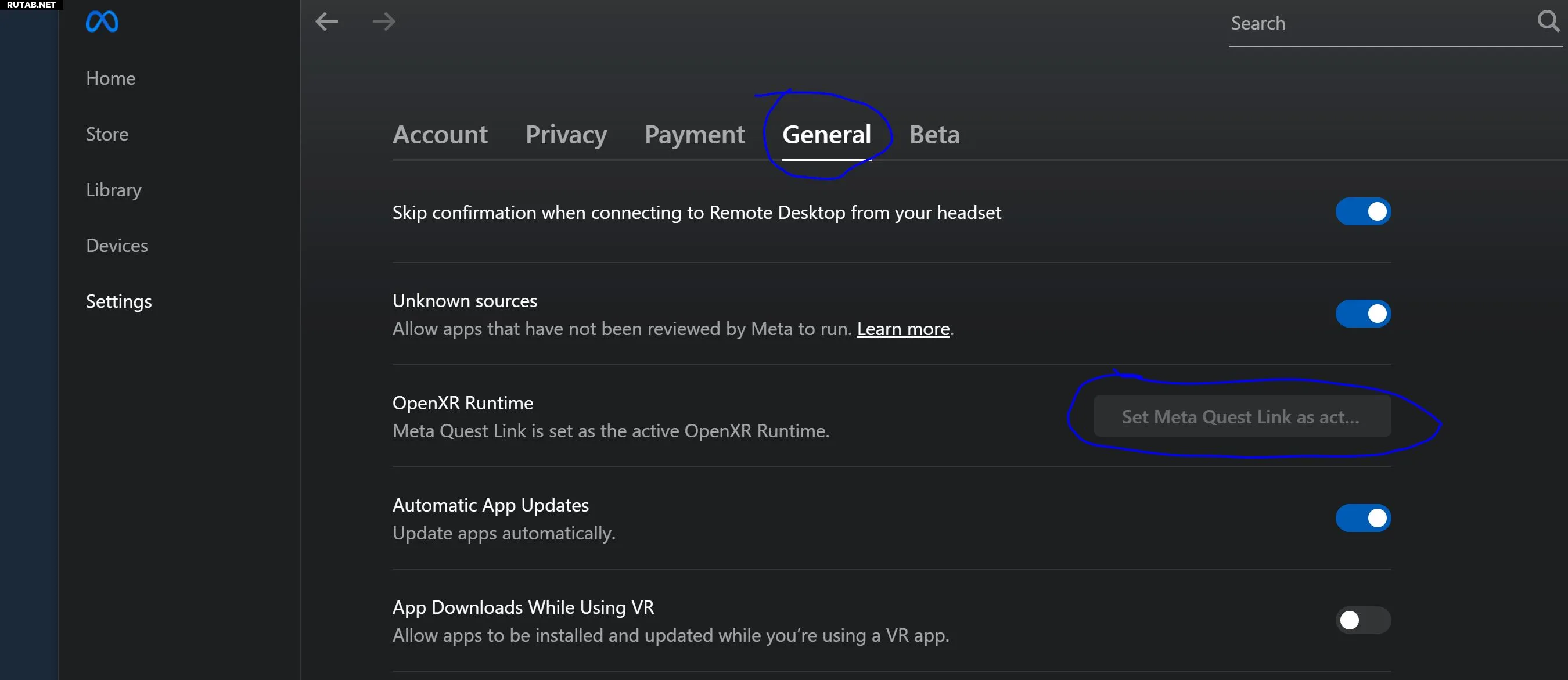 2) Установите и настройте приложение Meta Quest Link на компьютере. Настройте параметры шлема, такие как разрешение и частота обновления. В разделе Настройки → Общие убедитесь, что в качестве среды выполнения по умолчанию выбран OpenXR, а не OpenVR. Это предотвратит запуск SteamVR, который нам не нужен при использовании Quest Link.