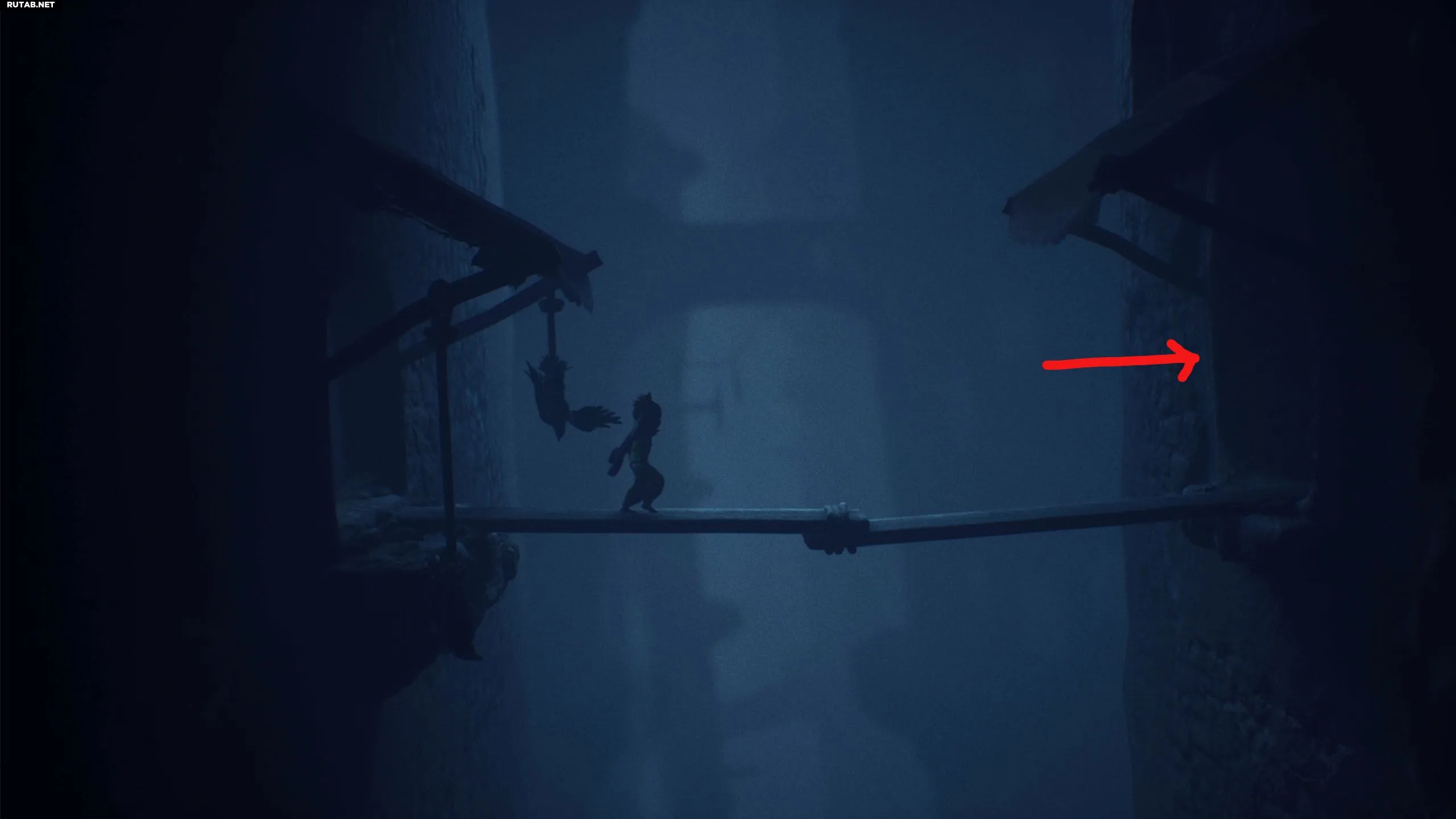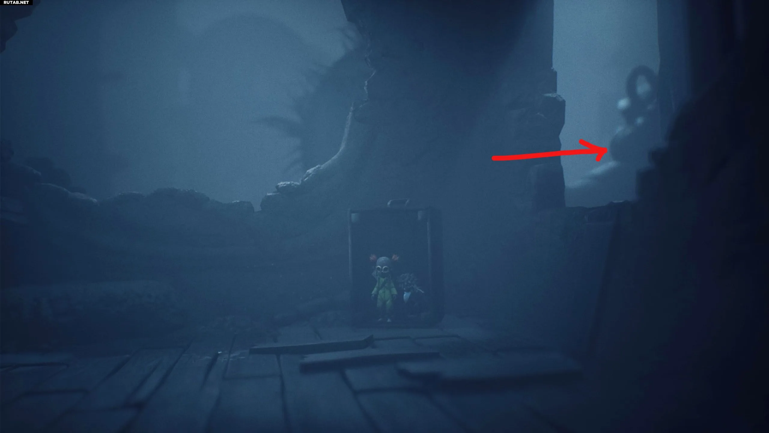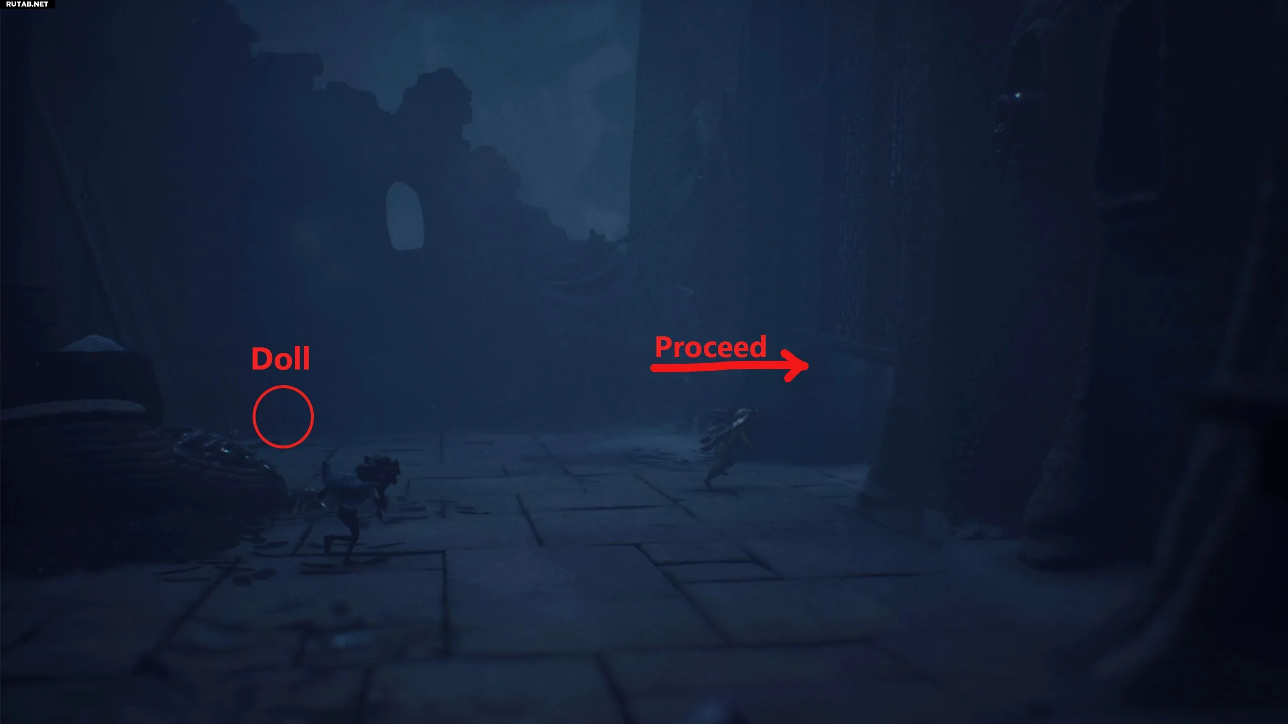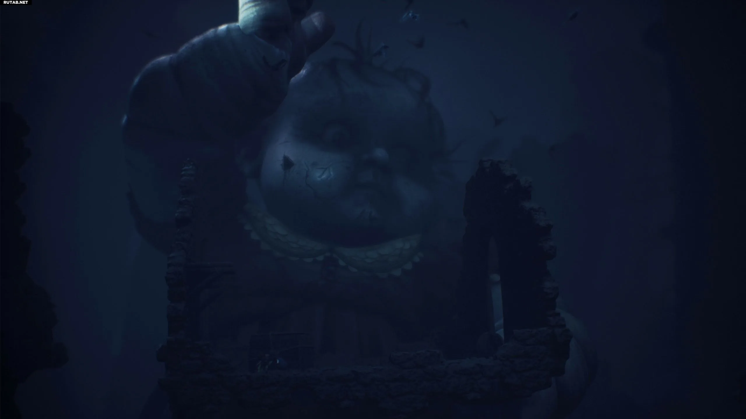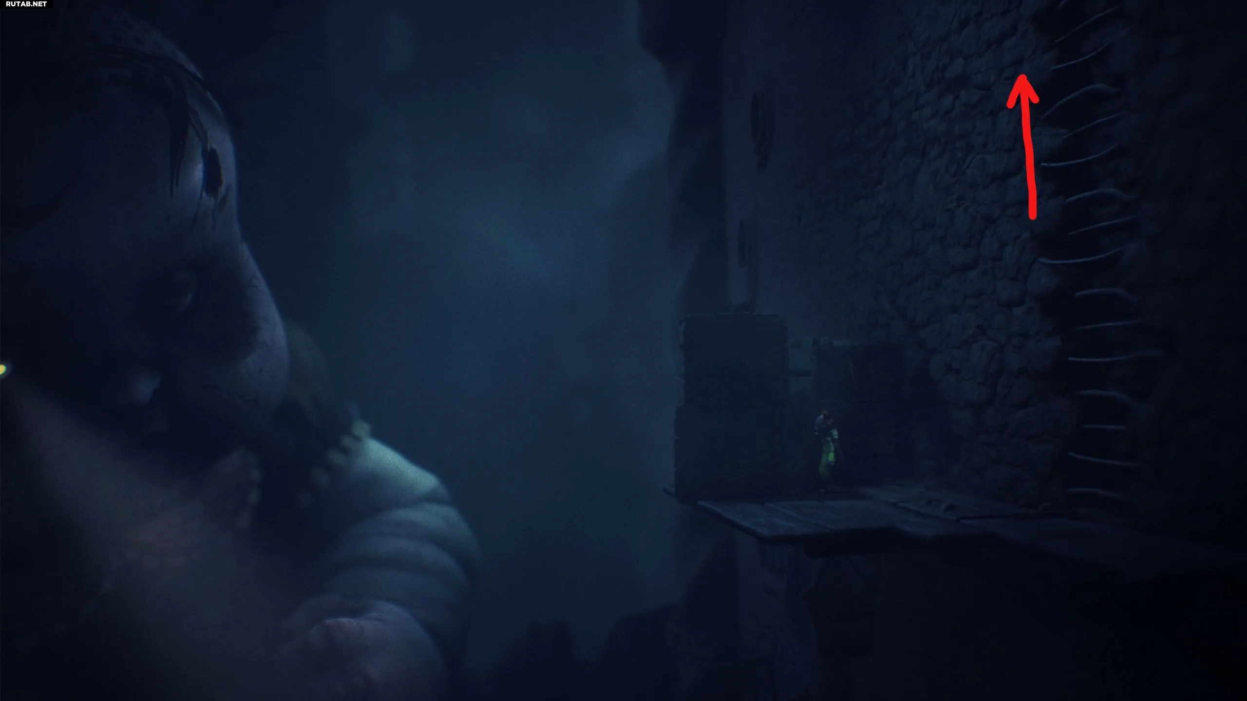 Сначала пролезьте через щель слева, чтобы забрать четвертую Куклу, затем запрыгните на уступ справа, чтобы продолжить путь. Перейдите по доскам и спуститесь по винтовым лестницам, чтобы снова встретить гигантского младенца.