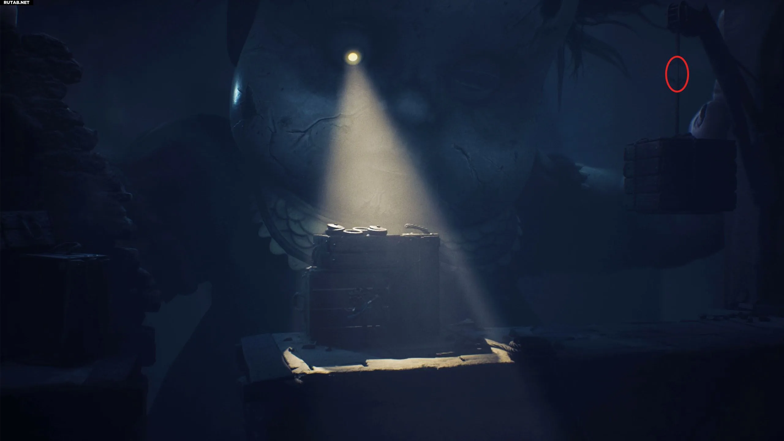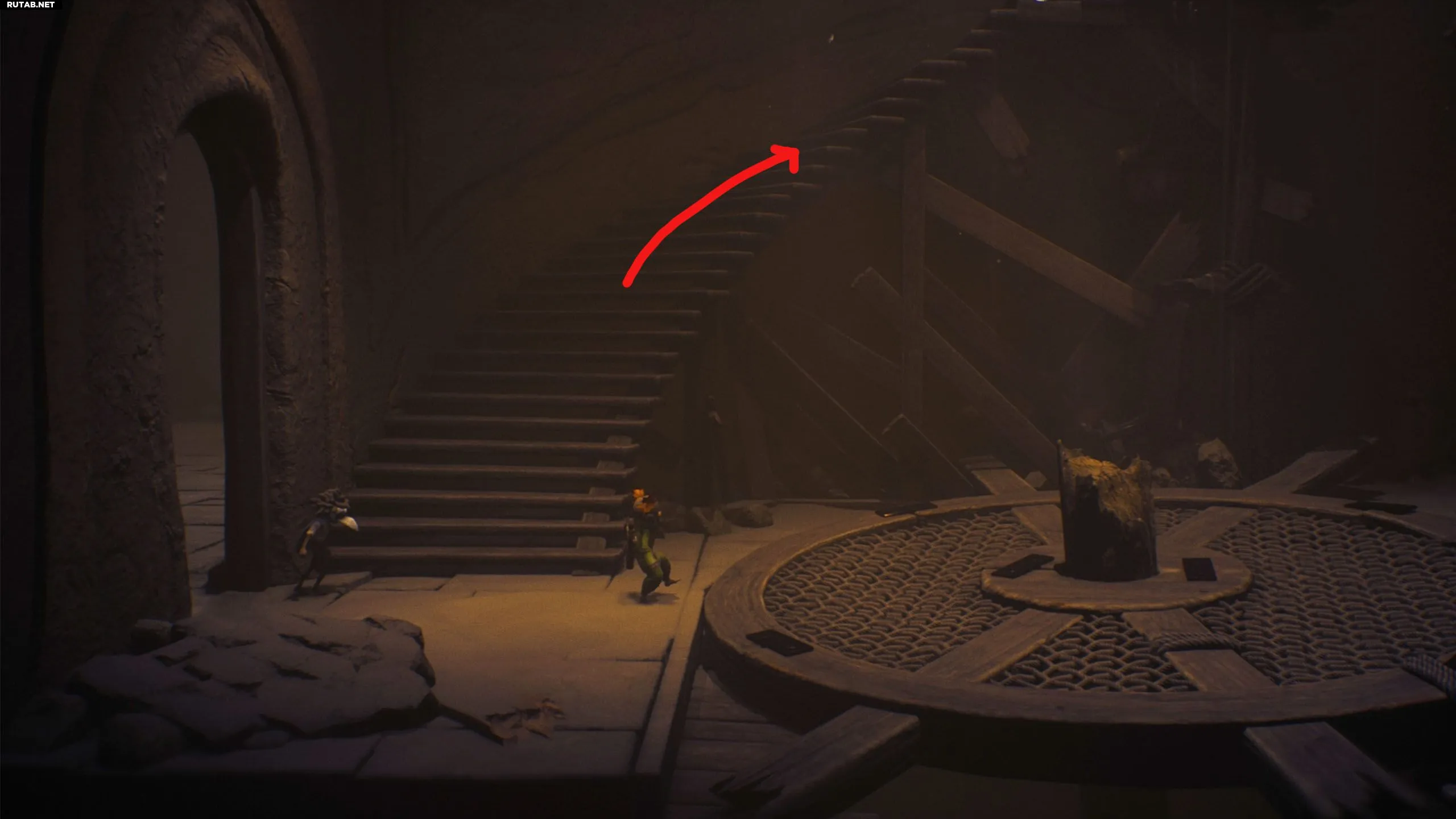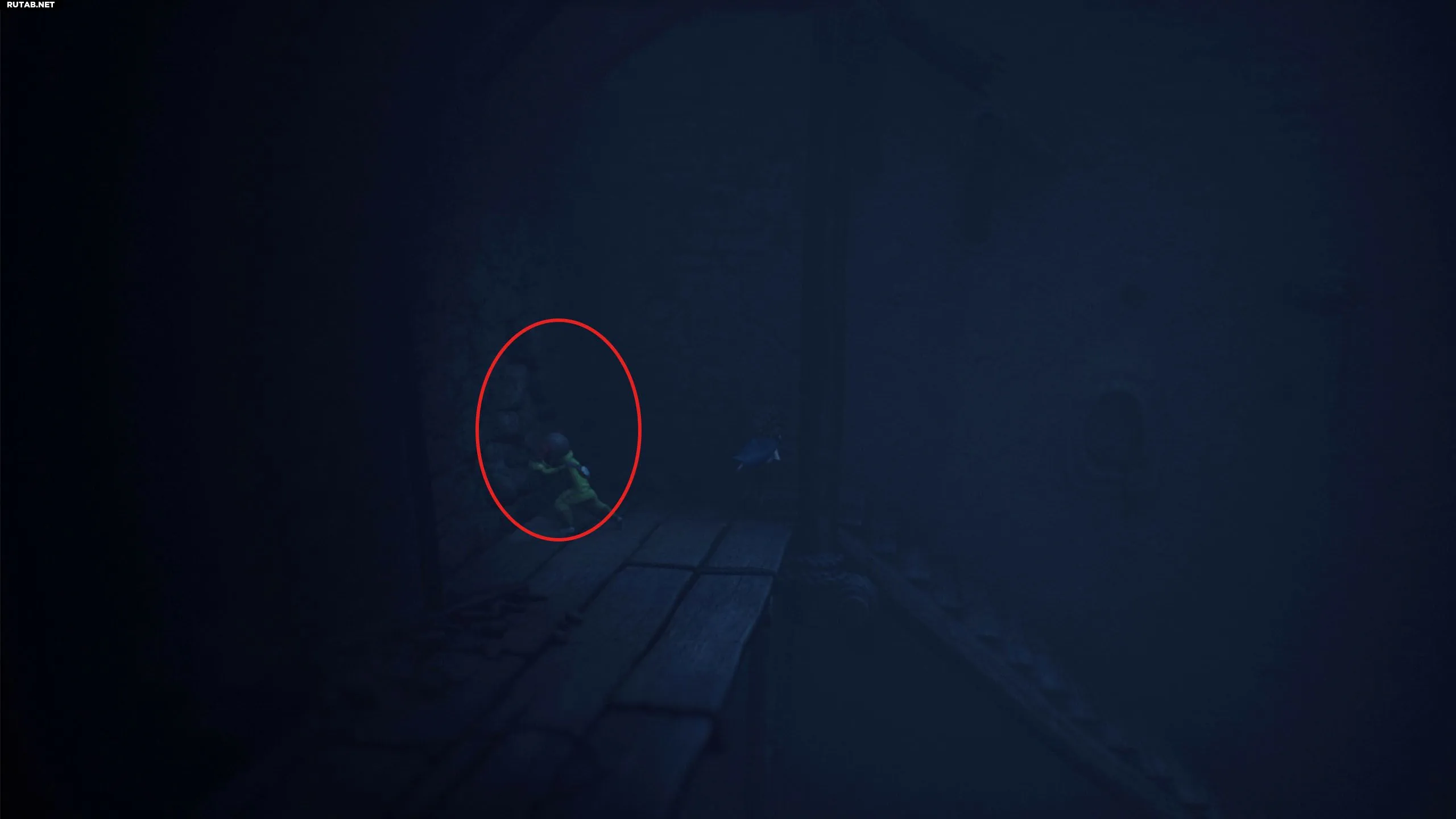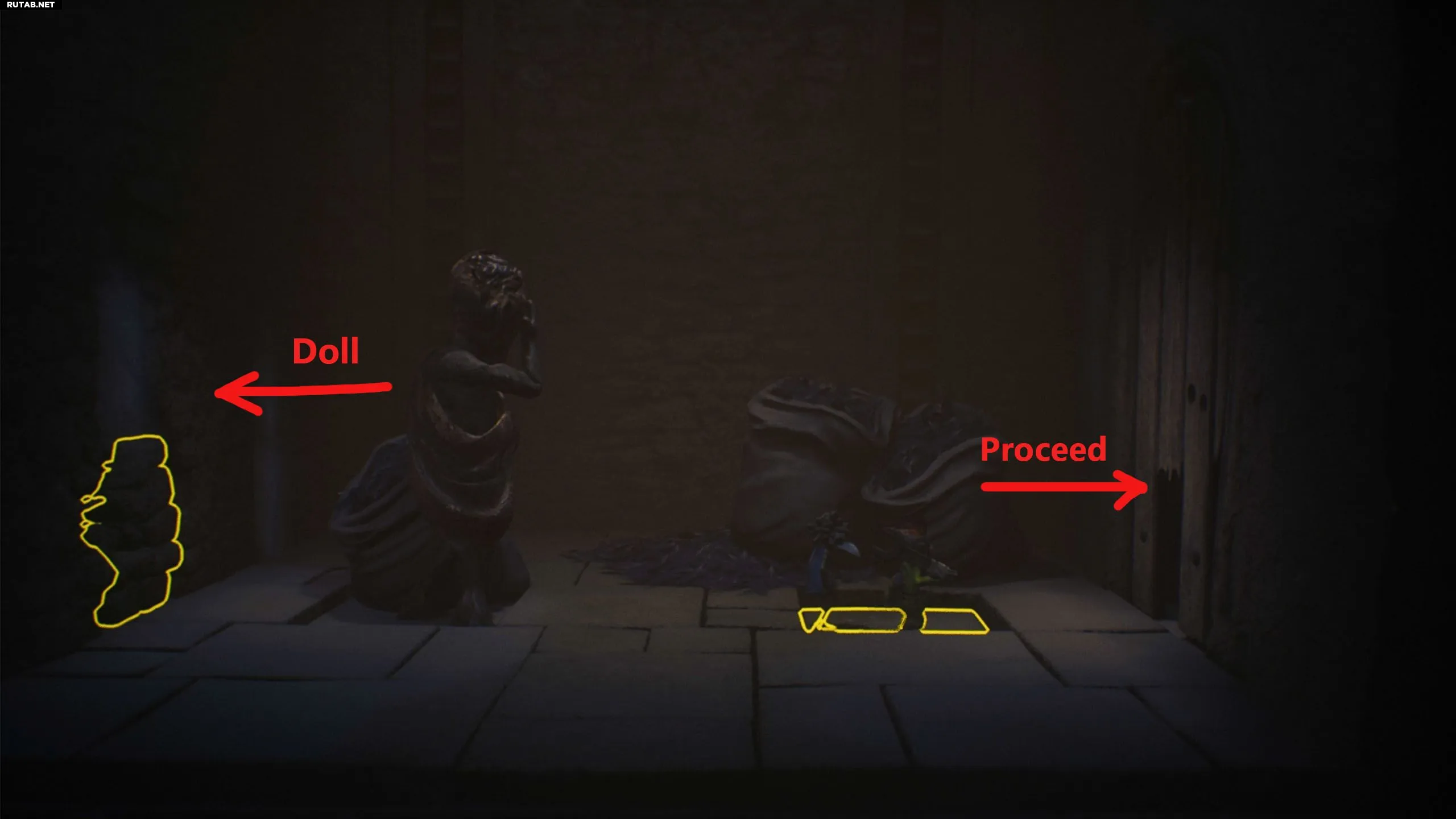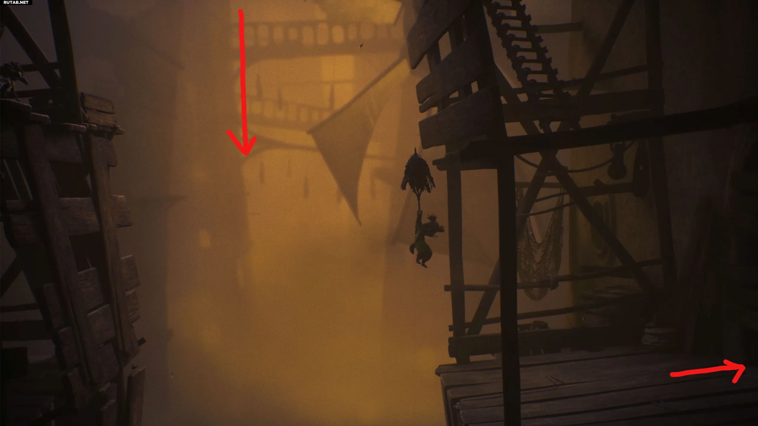 Сначала пролезьте через щель слева, чтобы забрать четвертую Куклу, затем запрыгните на уступ справа, чтобы продолжить путь. Перейдите по доскам и спуститесь по винтовым лестницам, чтобы снова встретить гигантского младенца.