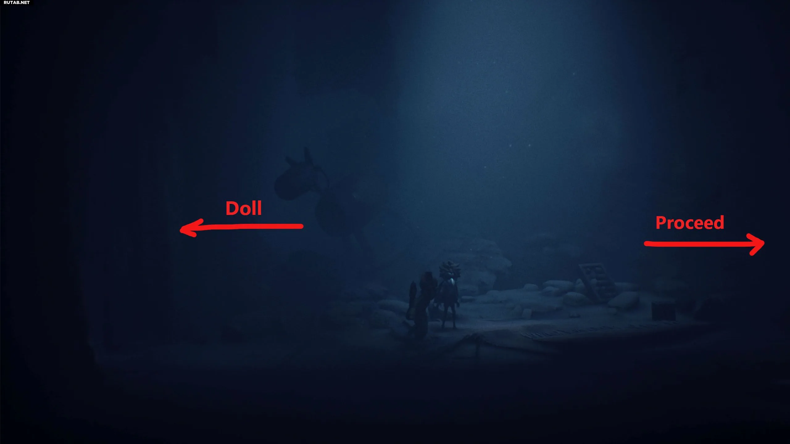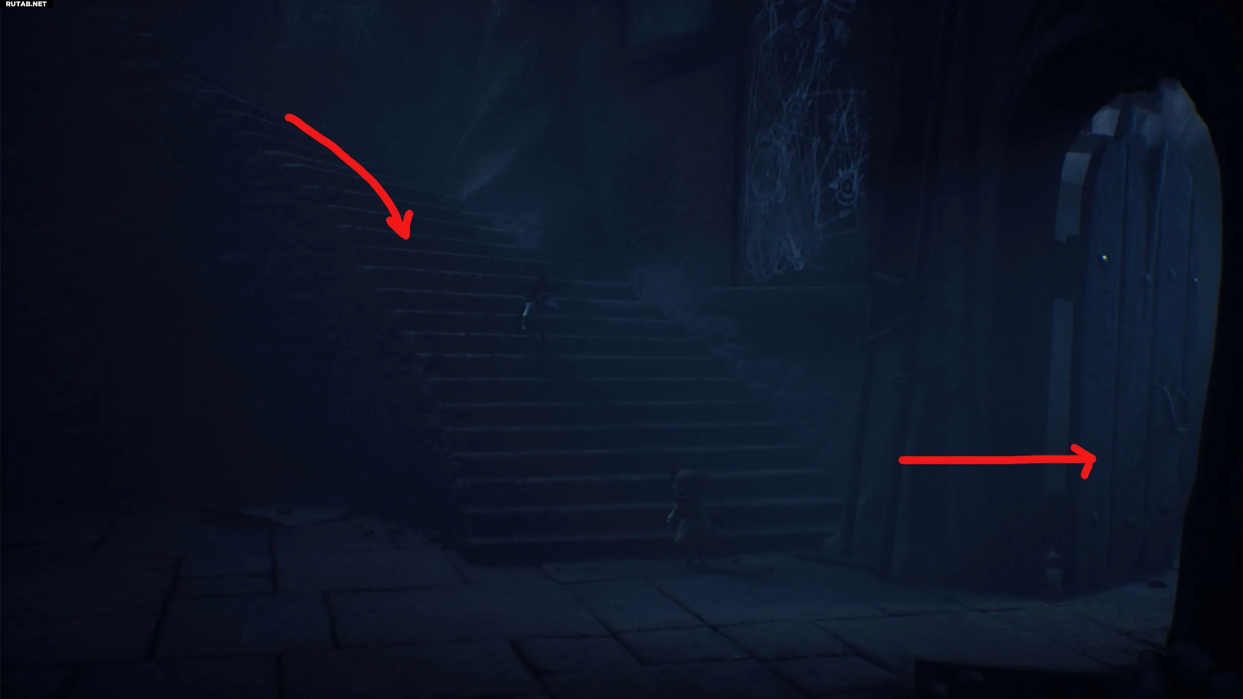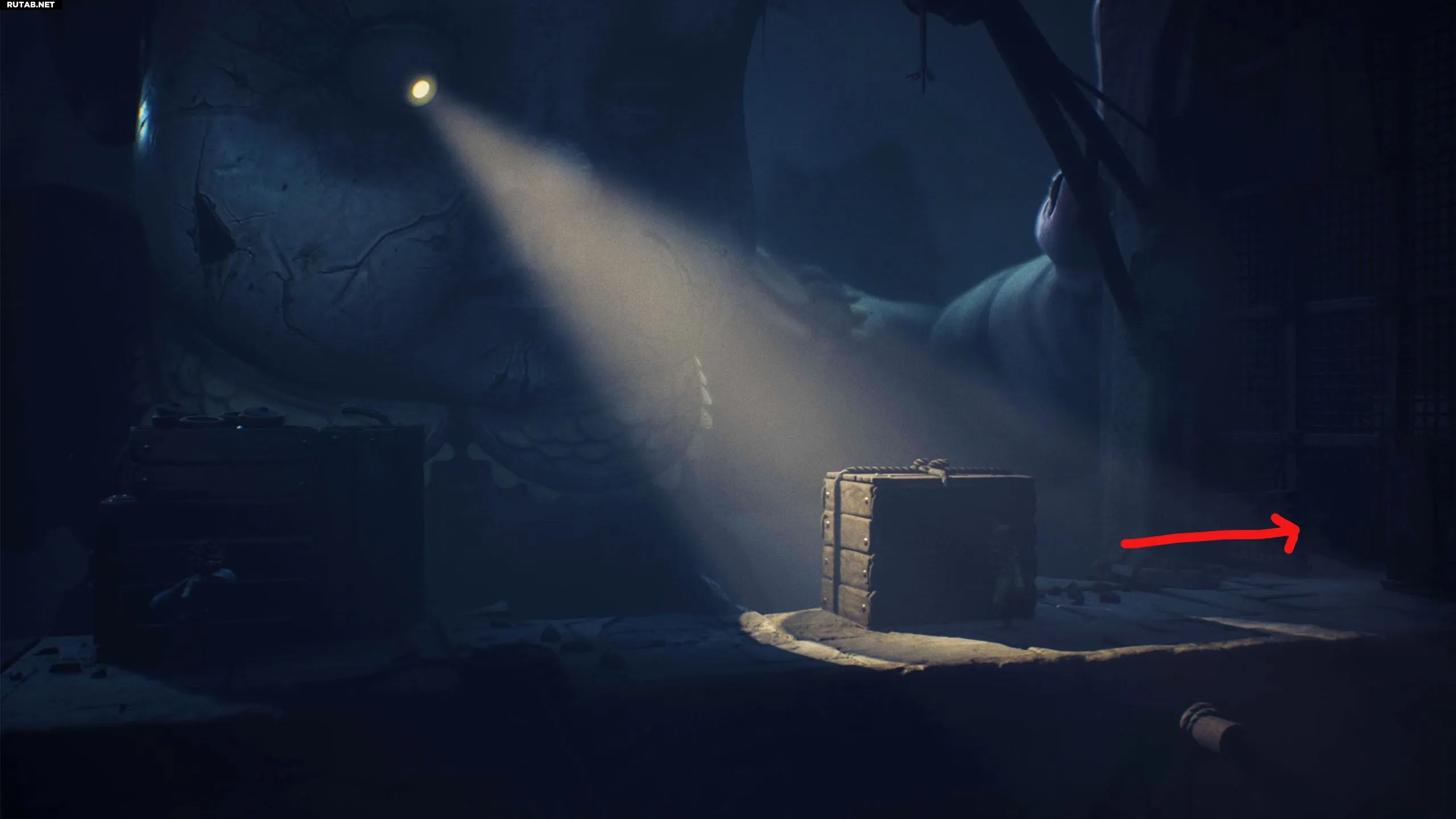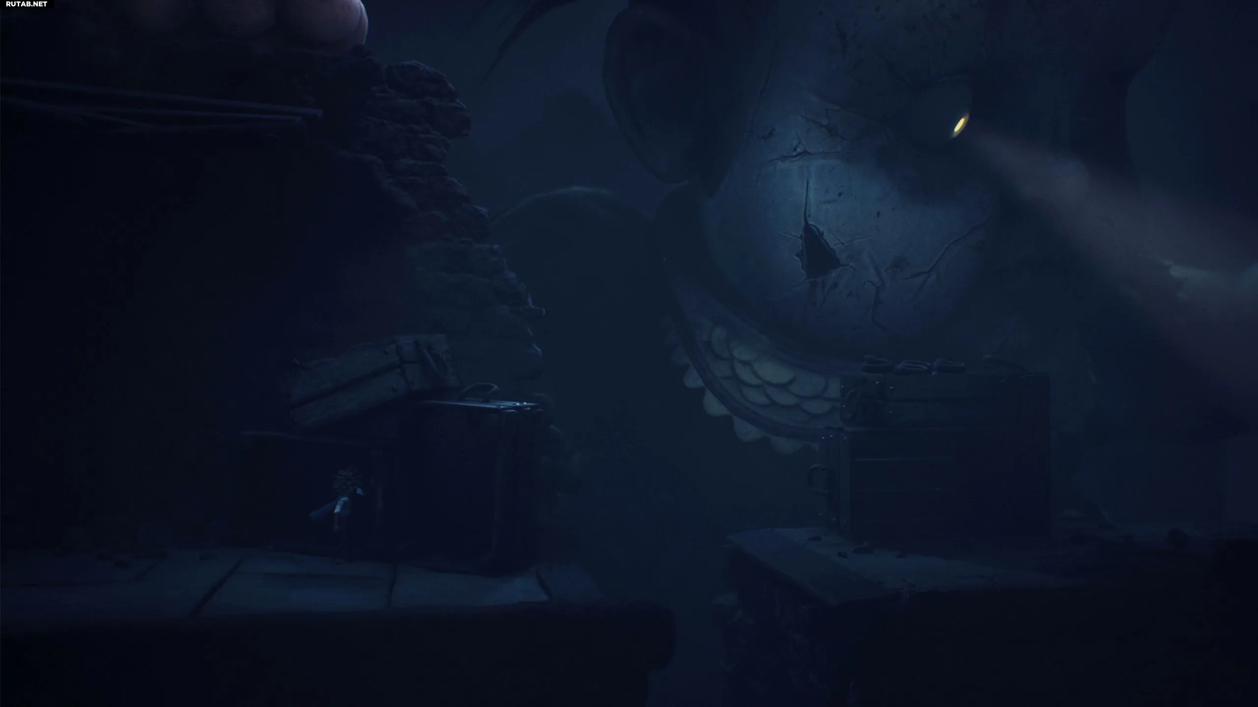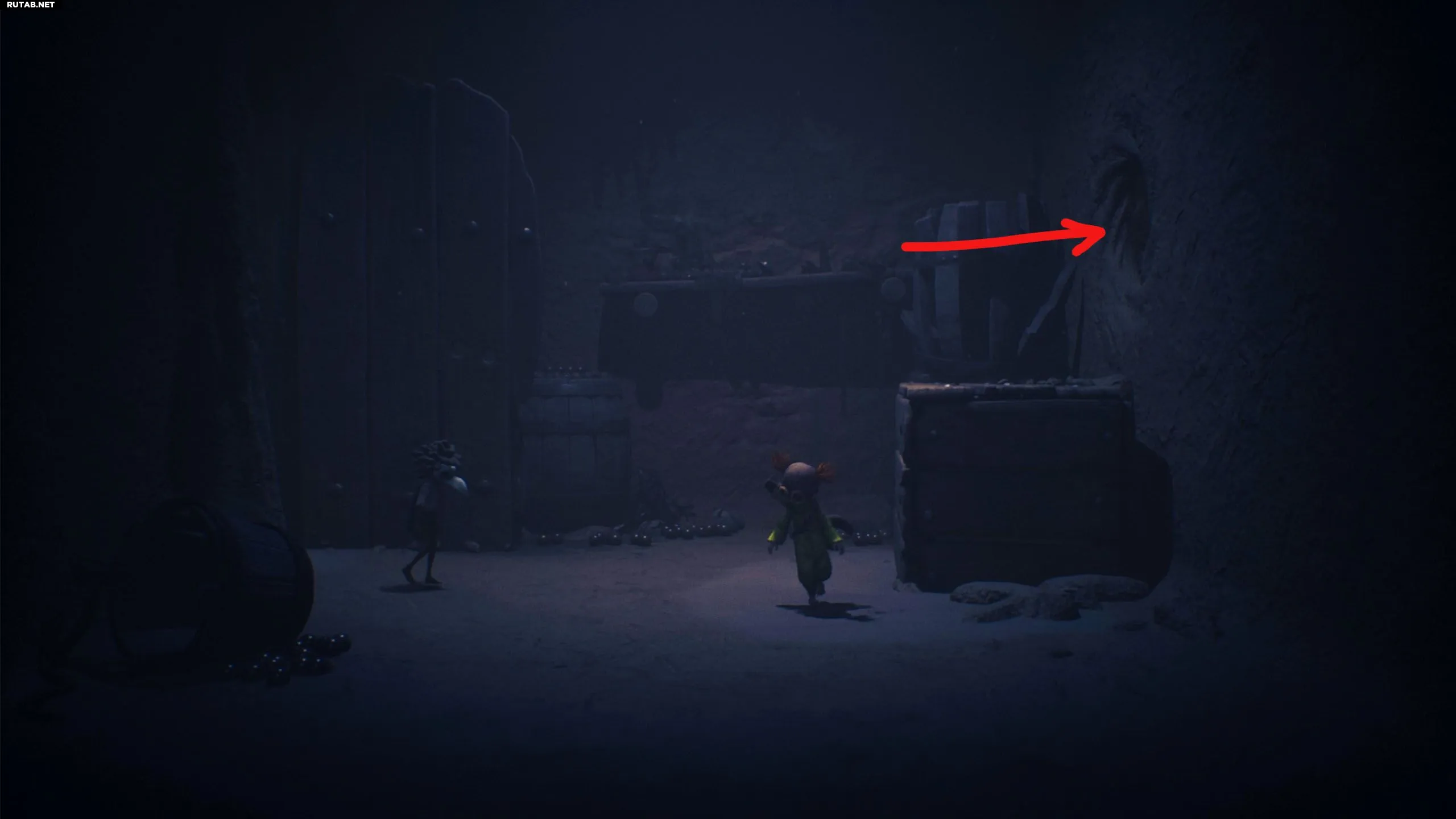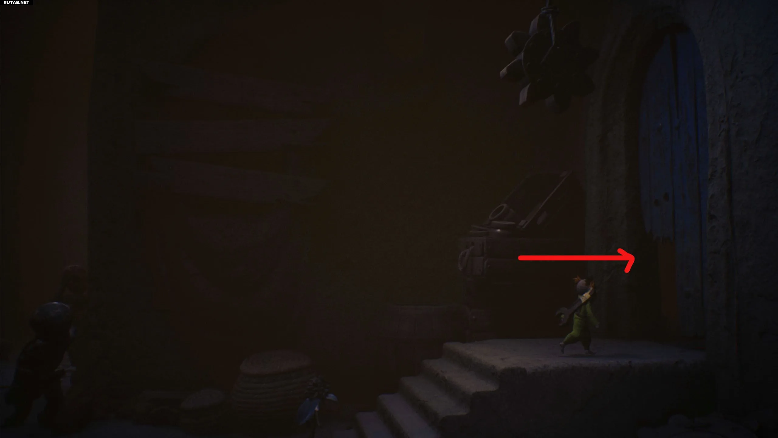 Сначала пролезьте через щель слева, чтобы забрать четвертую Куклу, затем запрыгните на уступ справа, чтобы продолжить путь. Перейдите по доскам и спуститесь по винтовым лестницам, чтобы снова встретить гигантского младенца.
