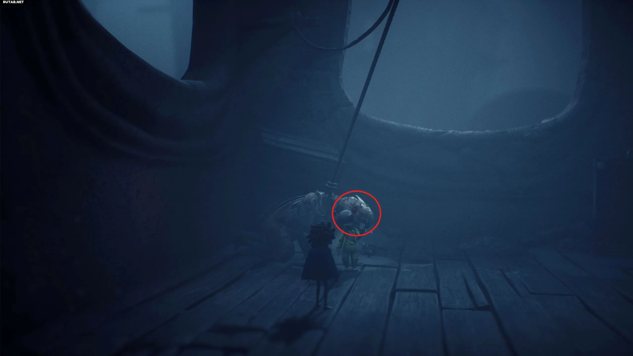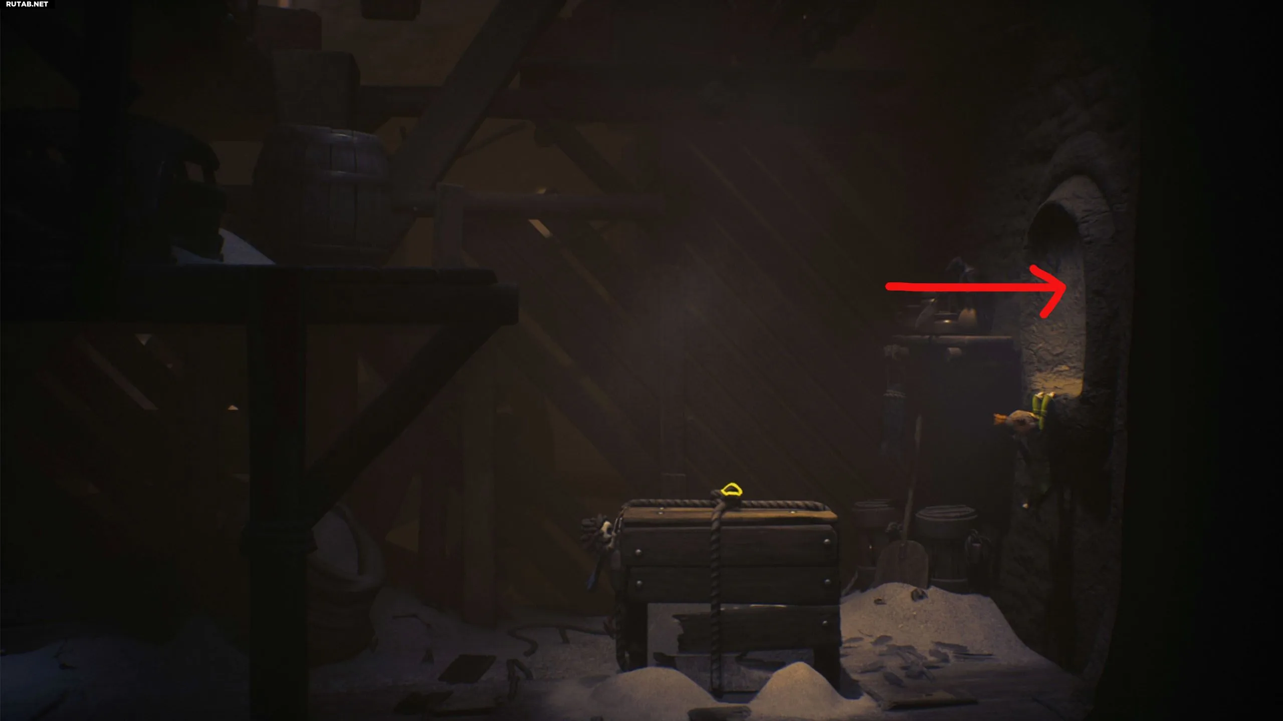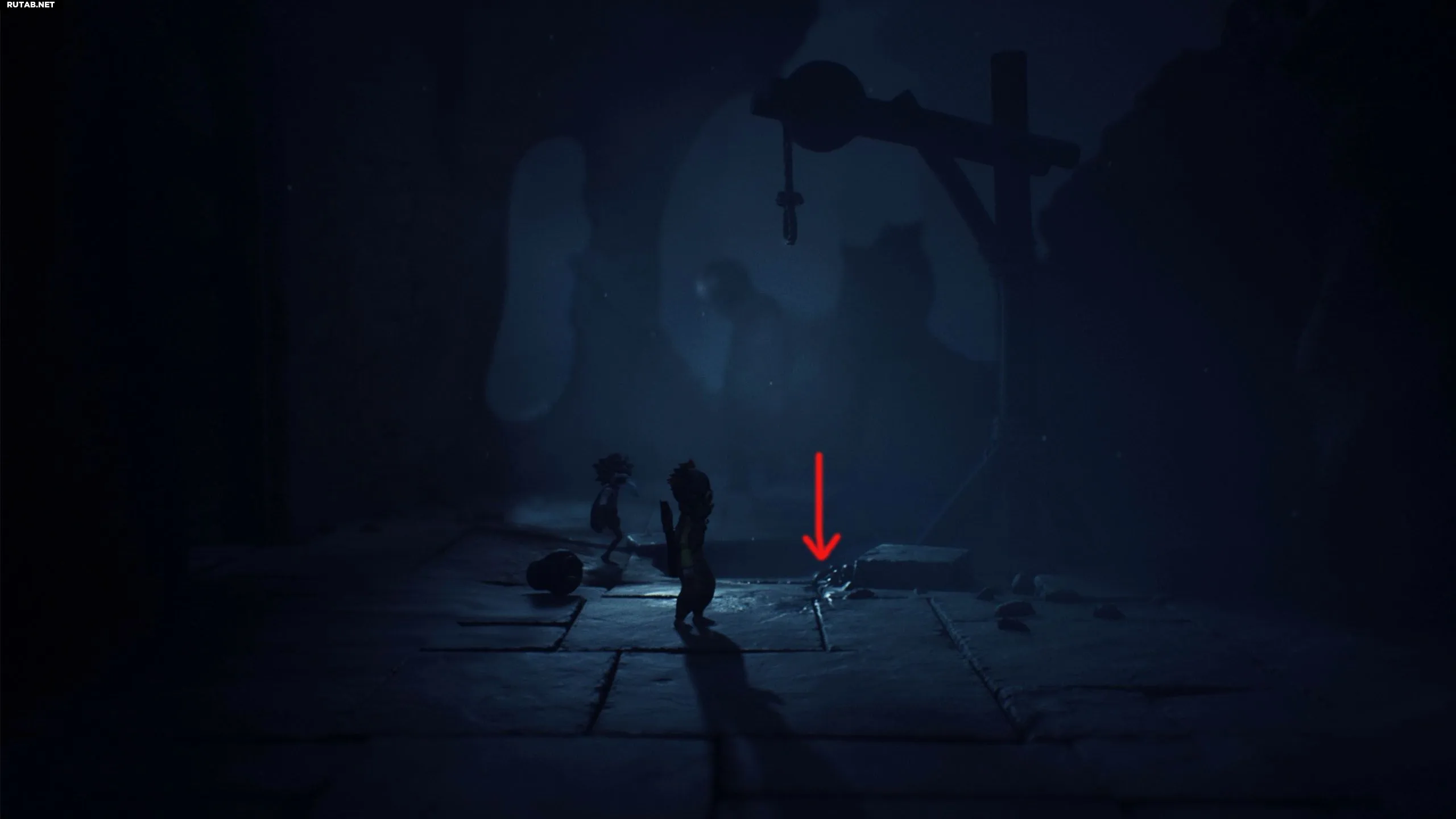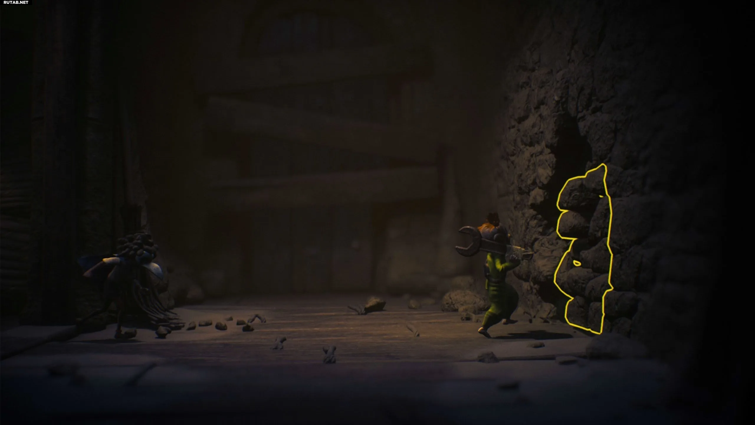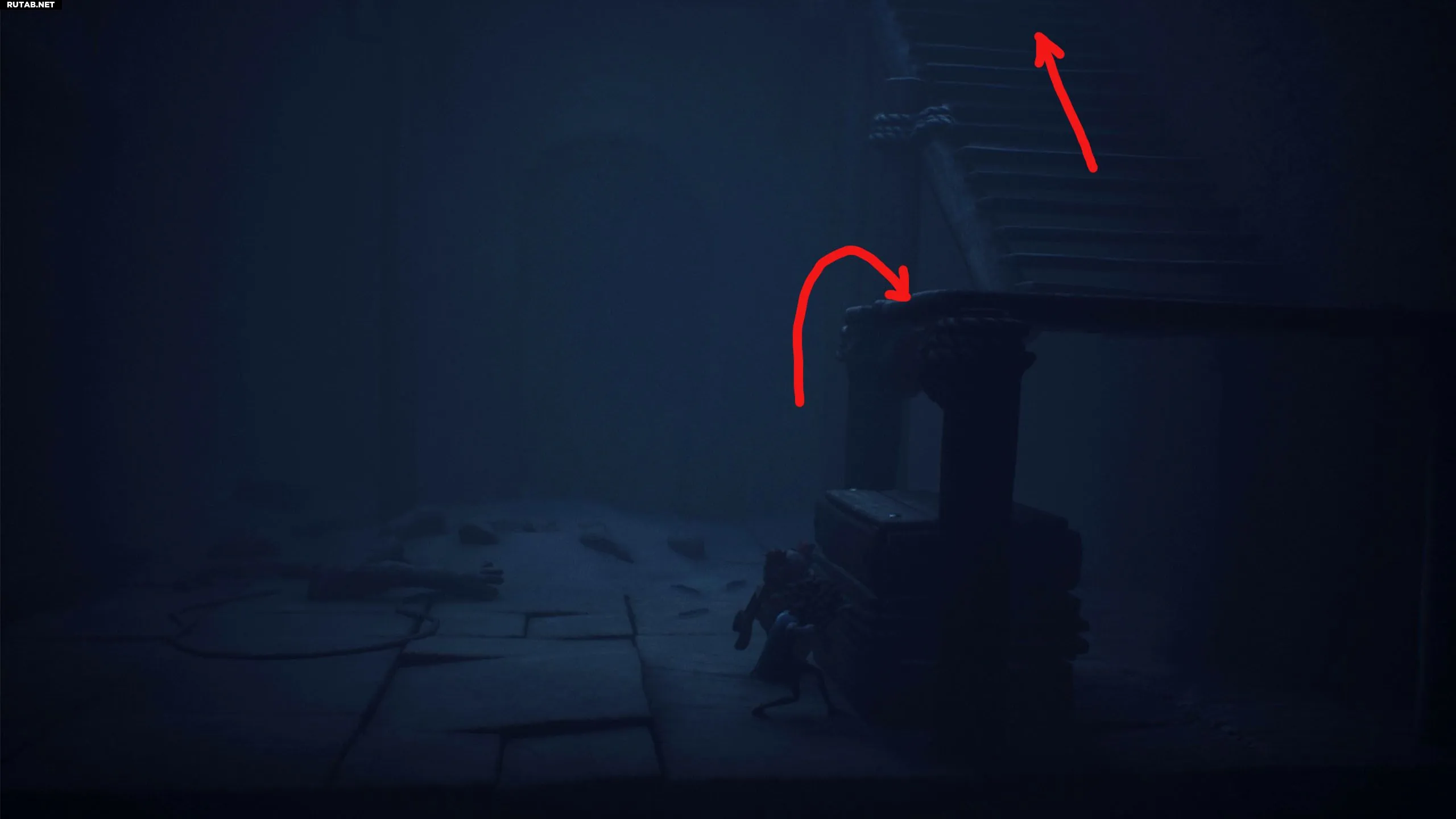 Сначала пролезьте через щель слева, чтобы забрать четвертую Куклу, затем запрыгните на уступ справа, чтобы продолжить путь. Перейдите по доскам и спуститесь по винтовым лестницам, чтобы снова встретить гигантского младенца.