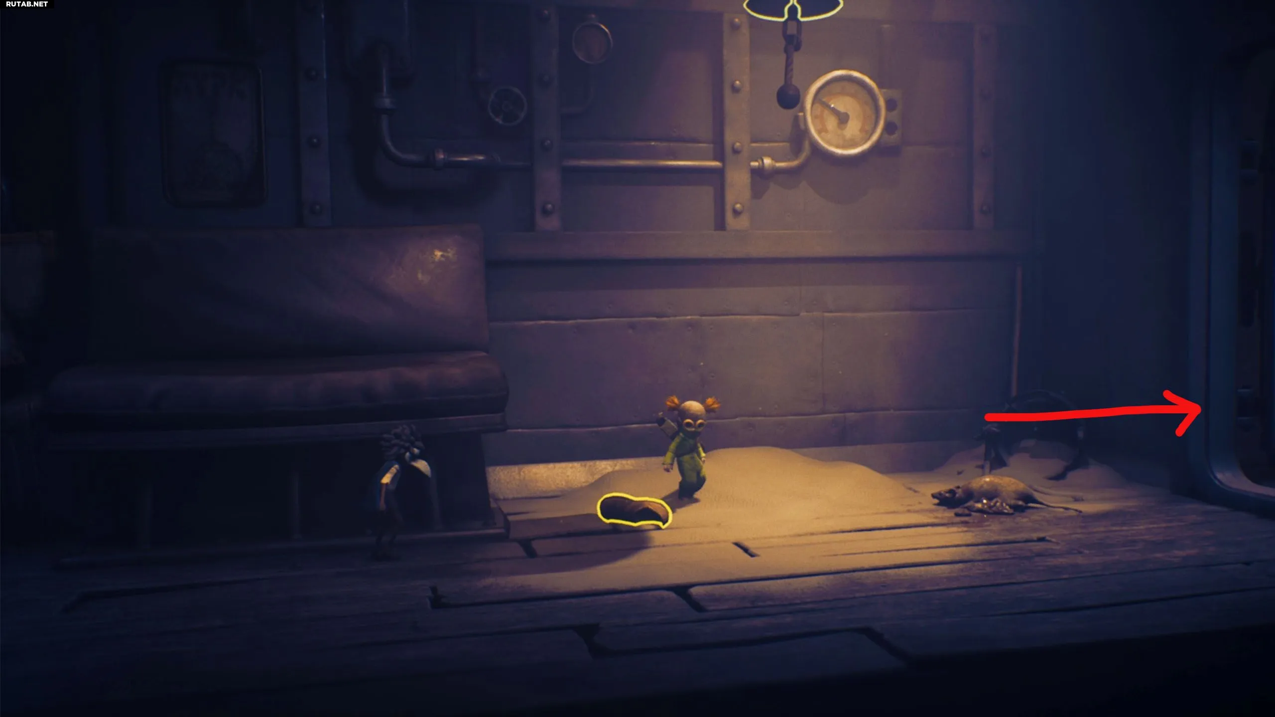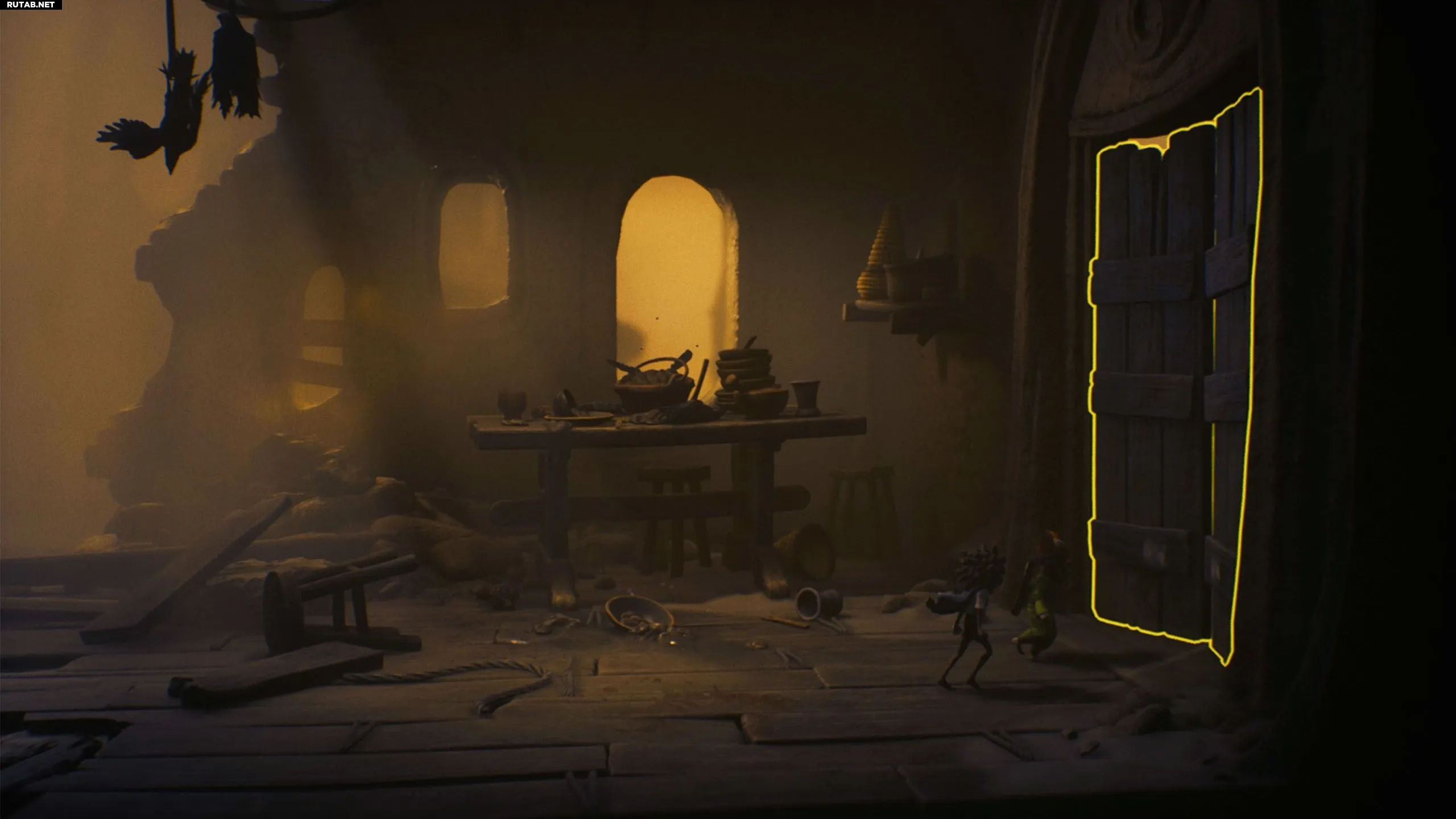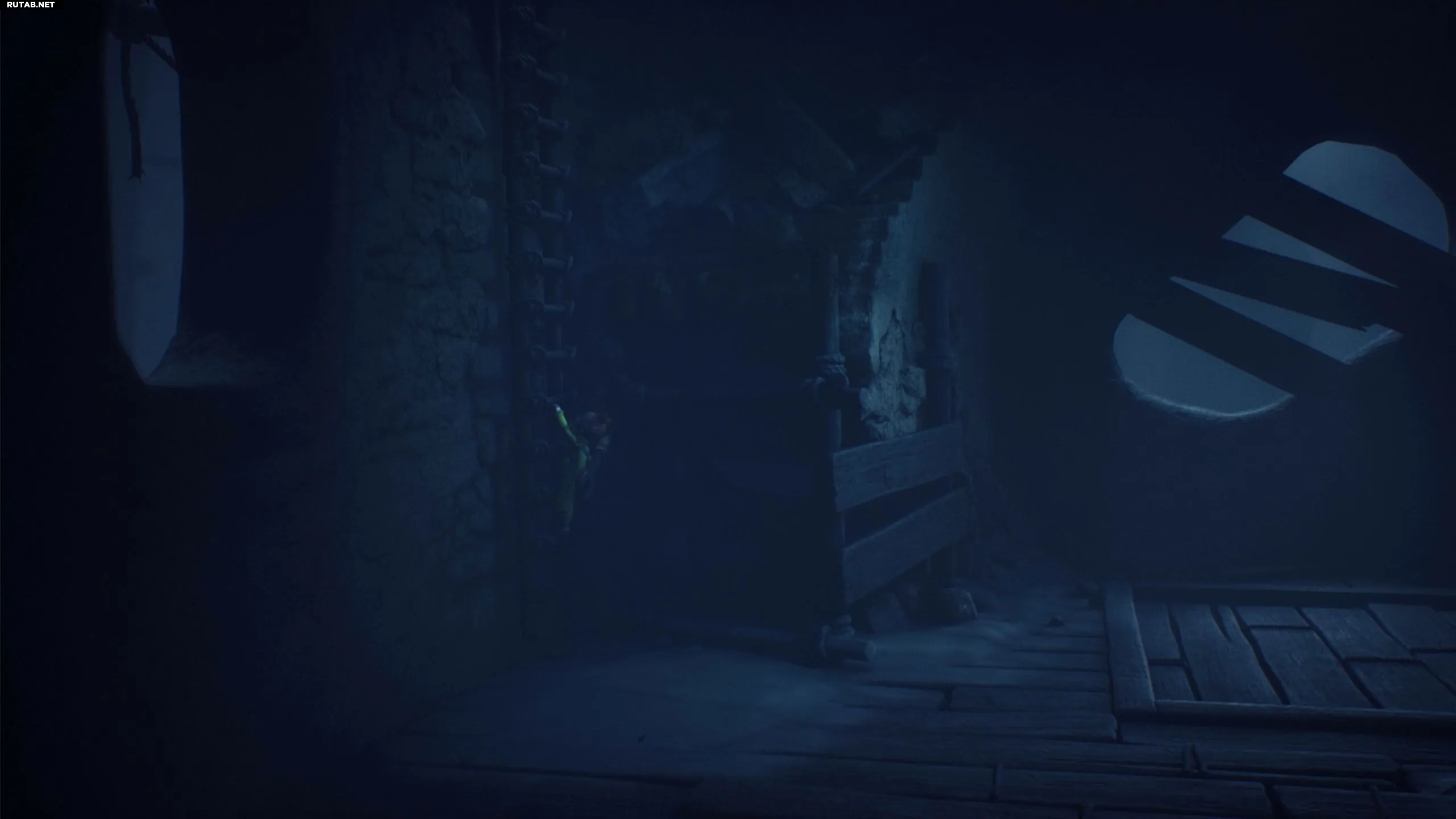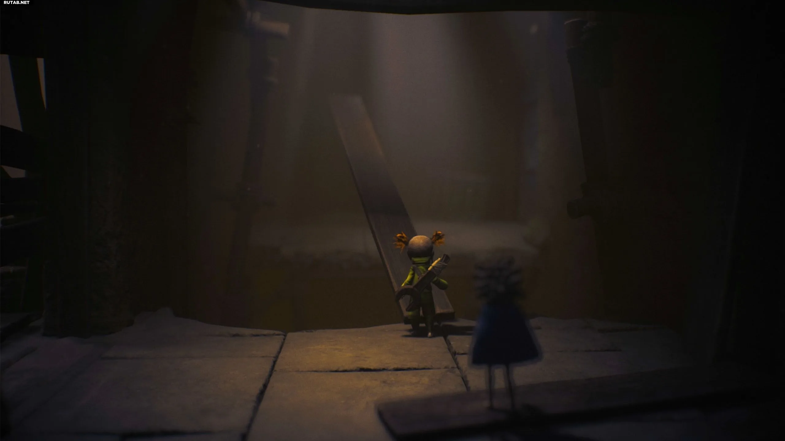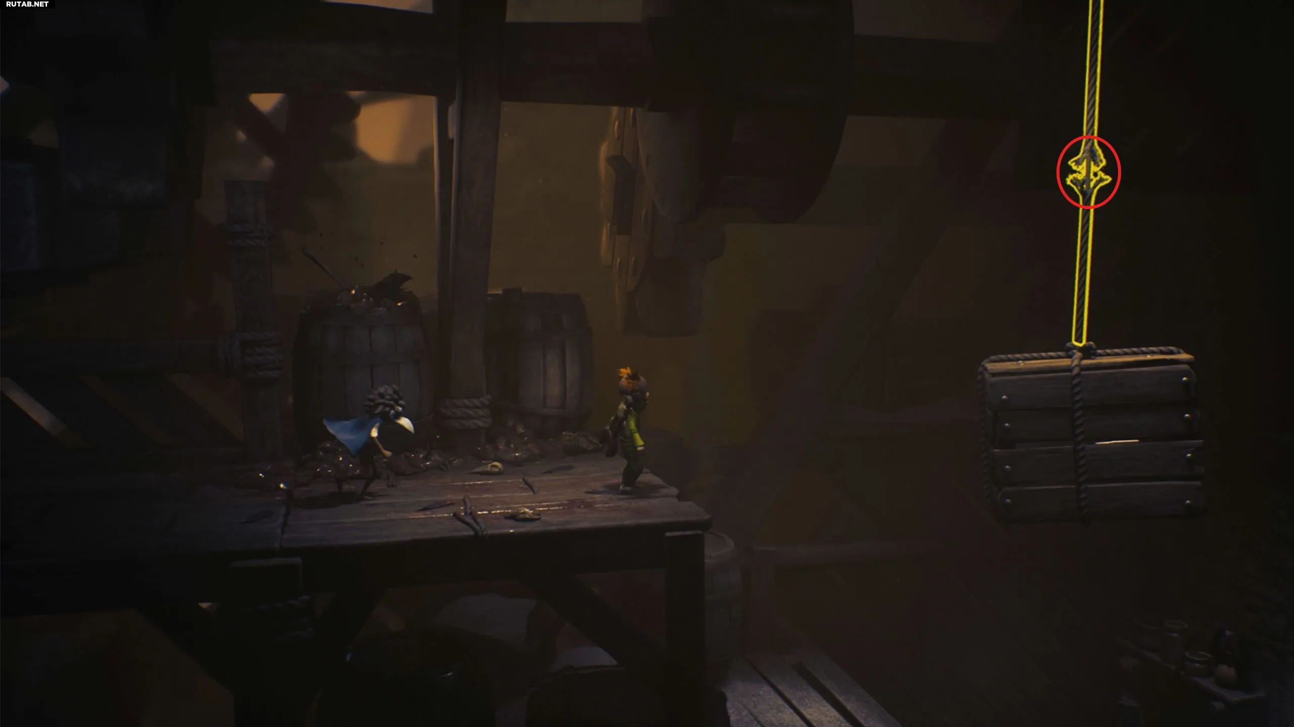 Сначала пролезьте через щель слева, чтобы забрать четвертую Куклу, затем запрыгните на уступ справа, чтобы продолжить путь. Перейдите по доскам и спуститесь по винтовым лестницам, чтобы снова встретить гигантского младенца.