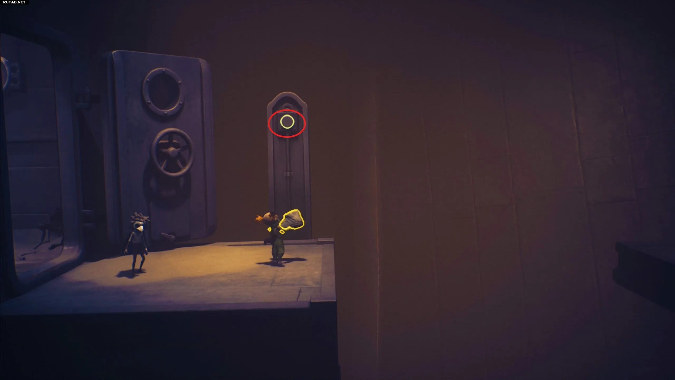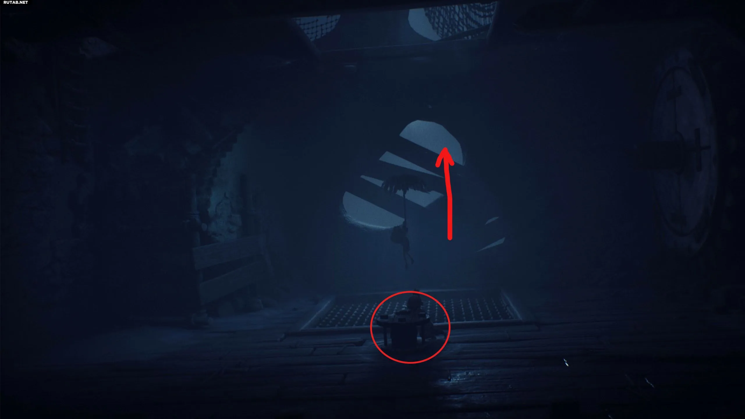 Вместе откройте небольшую дверь и дождитесь, пока гигантская рука скроется. Продвигайтесь вперед мимо вентиляционных шахт и откройте шкаф, чтобы получить два перьевых зонта.