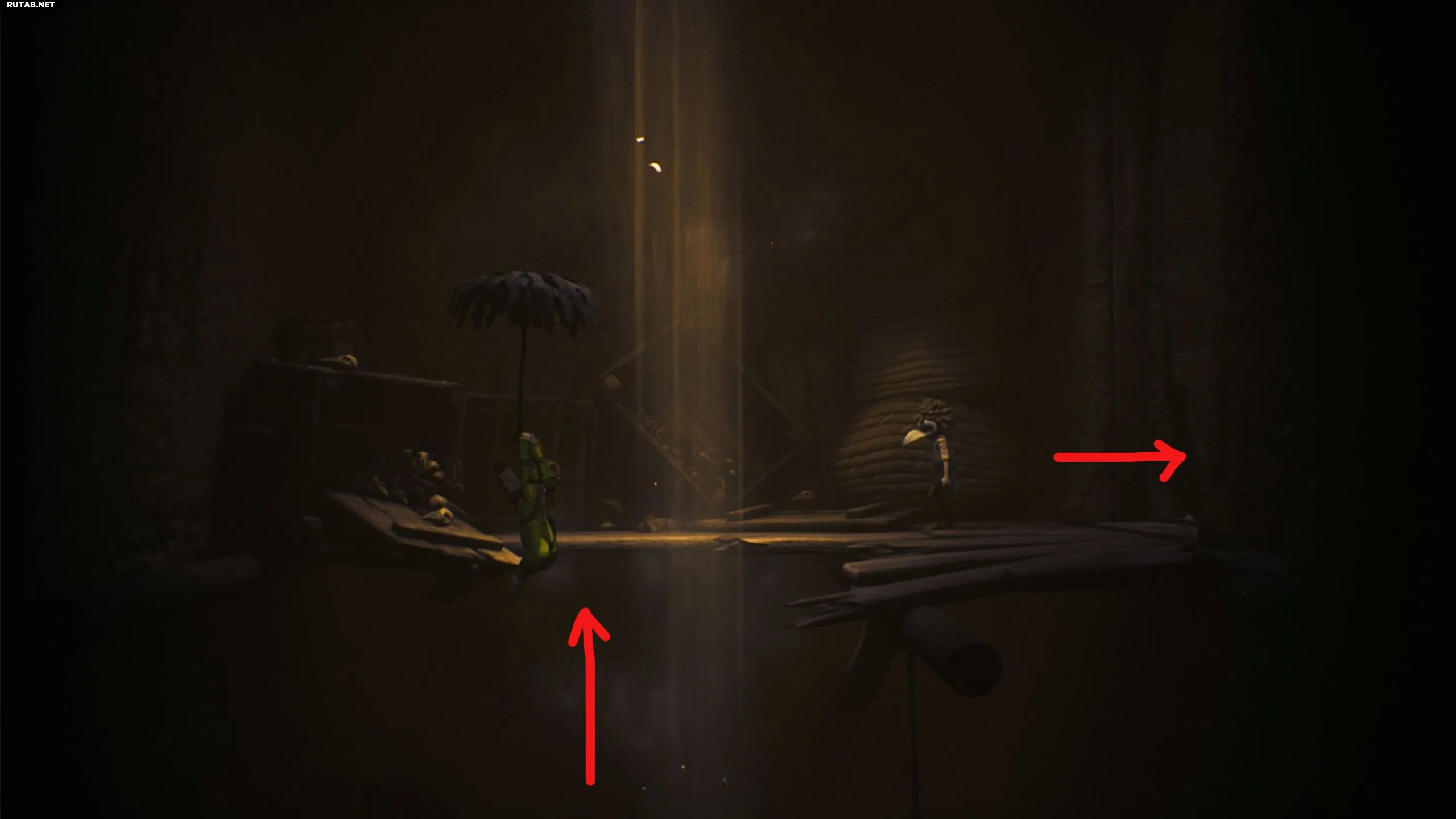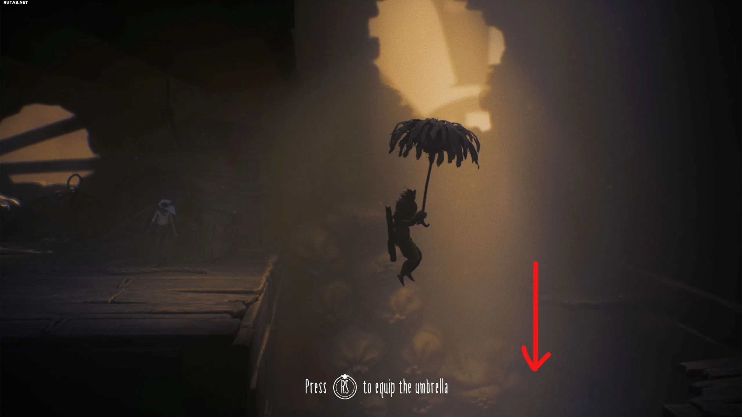 Вернитесь назад по направлению к камере, чтобы найти дверь справа. Поднимитесь по лестнице, чтобы забрать еще одну Куклу, затем используйте зонт, чтобы добраться до платформы.