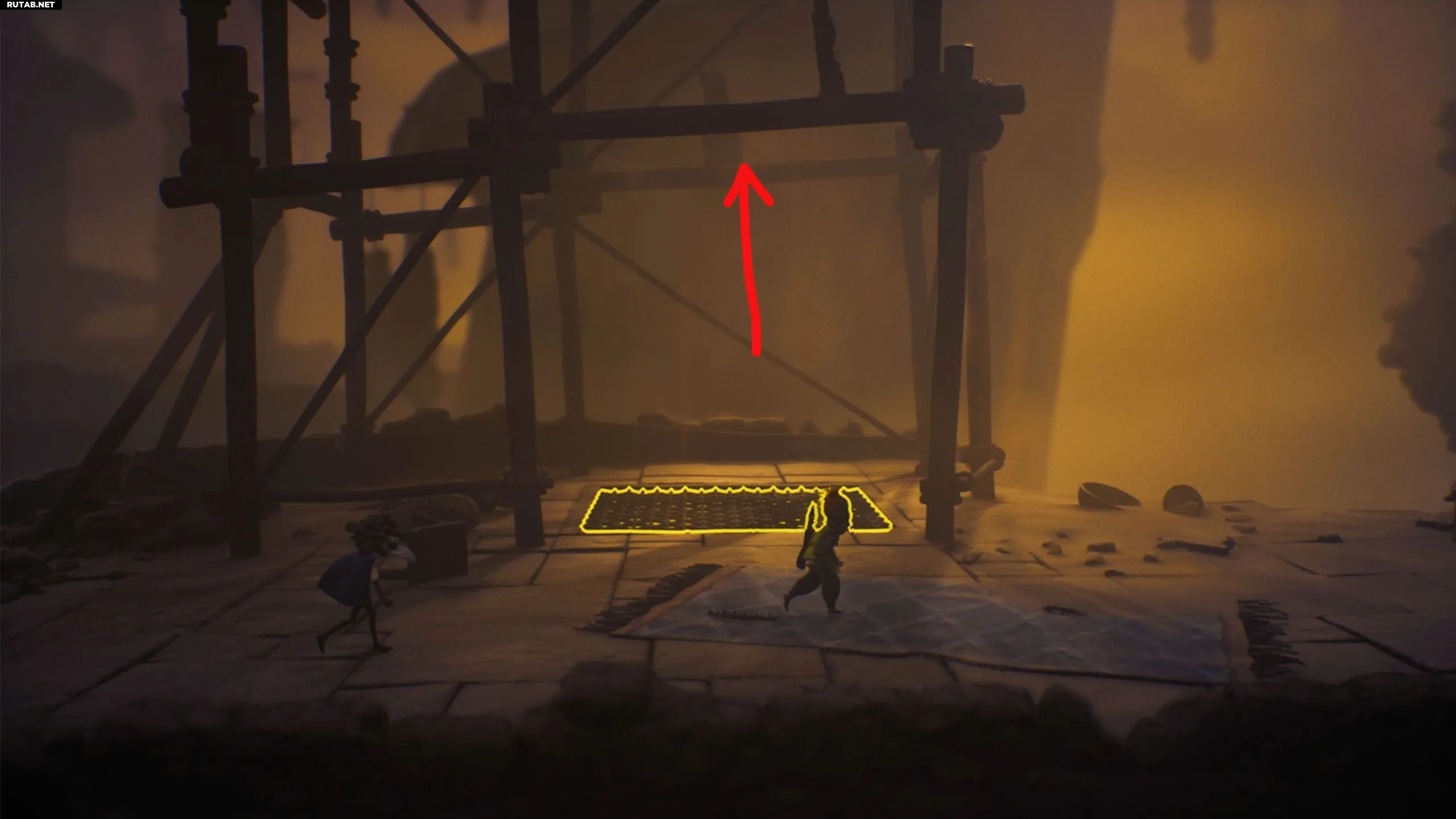 Поднимитесь по лестнице и двигайтесь налево по доскам. Один из персонажей должен повернуть рычаг, пока другой встанет на ящик, чтобы подняться выше. Потяните рычаг, чтобы опустить лестницу для второго персонажа, и вместе уберите деревянную доску, преграждающую путь налево.