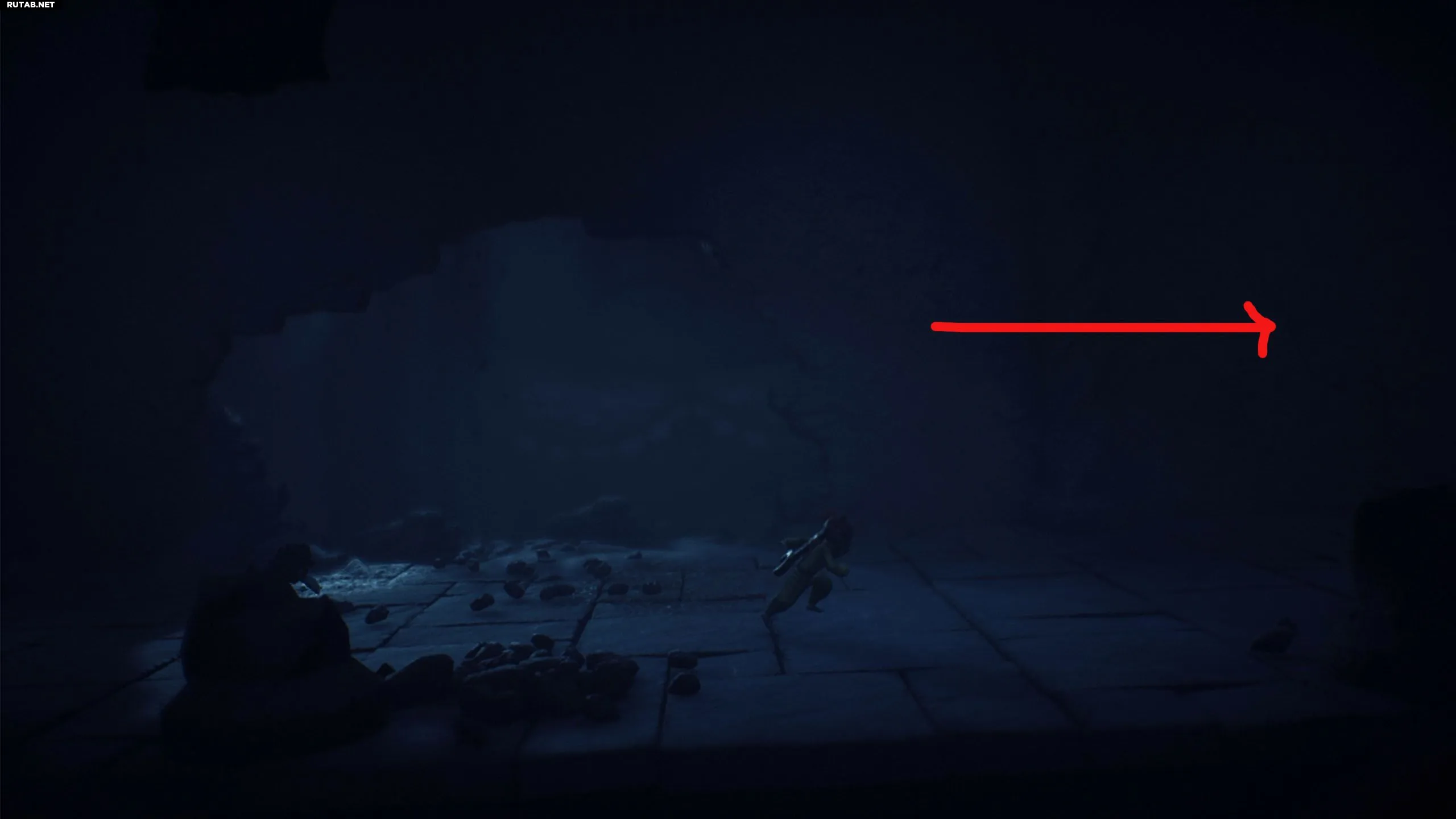 Разрушьте камни слева, чтобы забрать Куклу, затем пролезьте через левую щель. Продвигайтесь вперед по туннелю мимо висящих тел, чтобы найти в конце небольшую дверь.