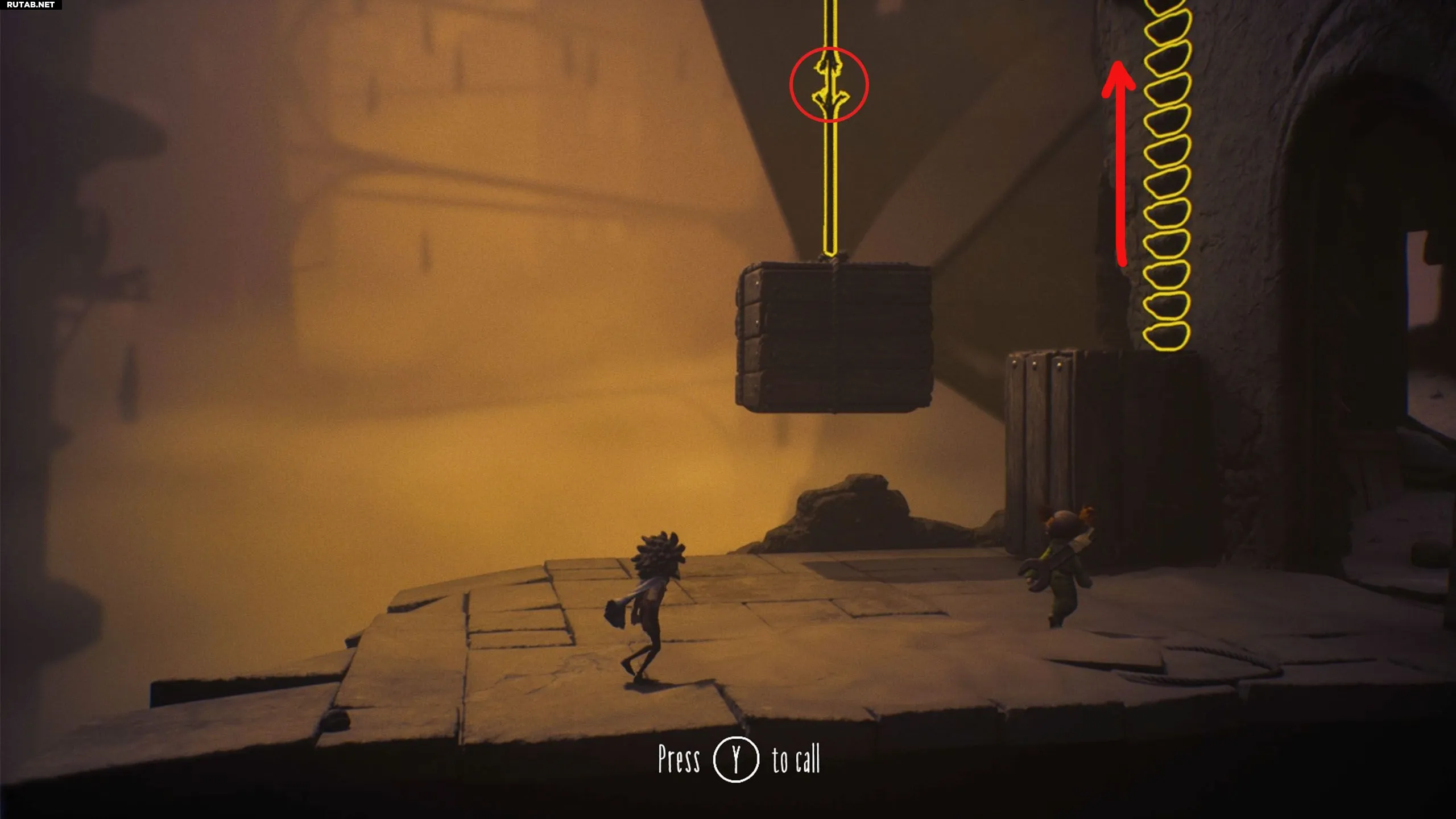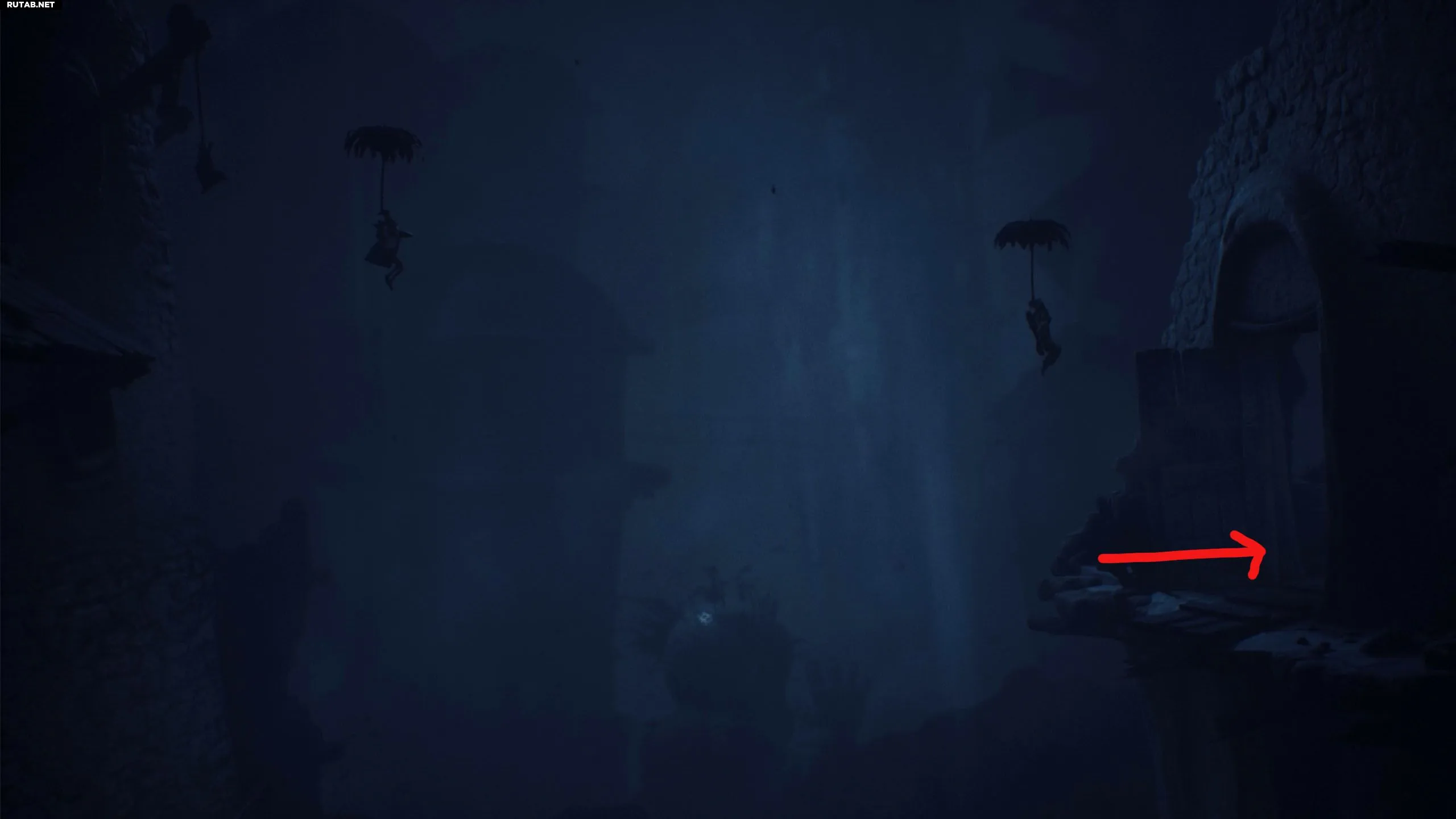 После того как гигантская рука исчезнет, бегите направо и используйте зонт, чтобы взлететь. Затем позвольте Алон разрушить стену гаечным ключом. Снова возьмите перьевой зонт и спланируйте вниз, чтобы вместе открыть дверь.