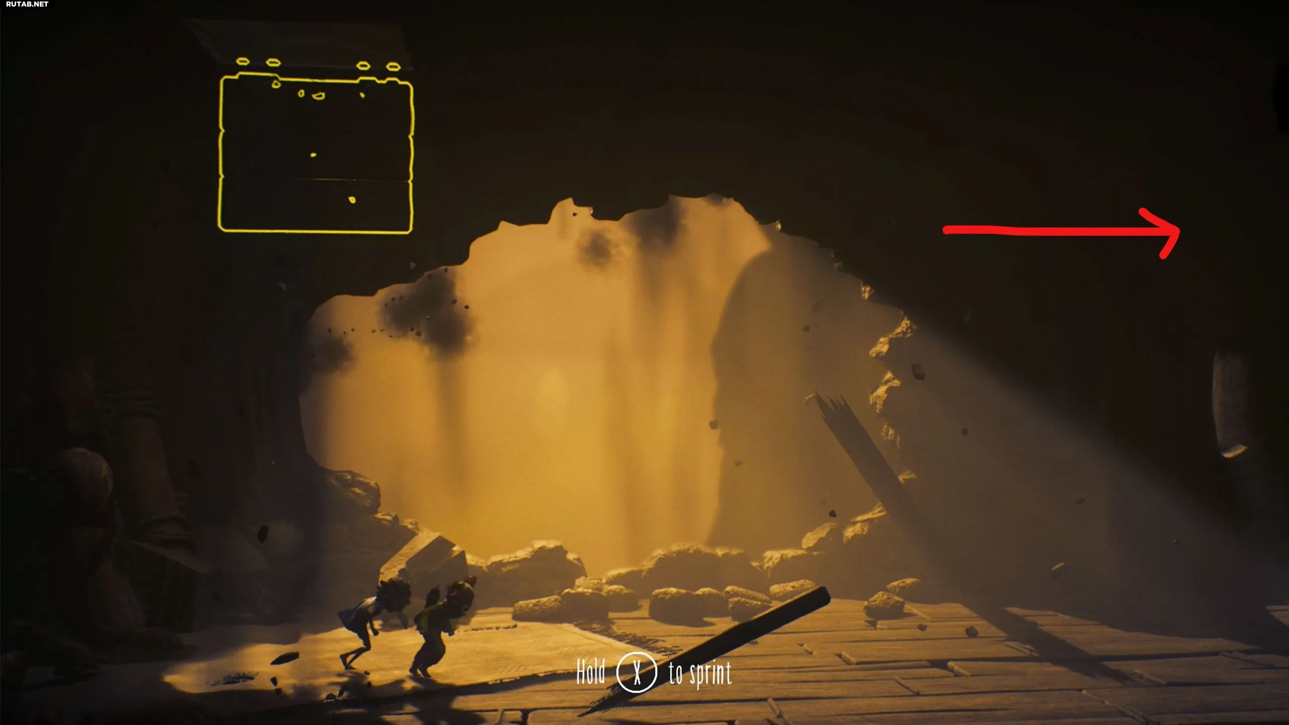 Выпрыгните через окно и продолжайте идти, пока не откроете маленькую дверь. Немедленно бегите направо, чтобы избежать падающих обломков, и в итоге спрячьтесь за ещё одной большой погремушкой.