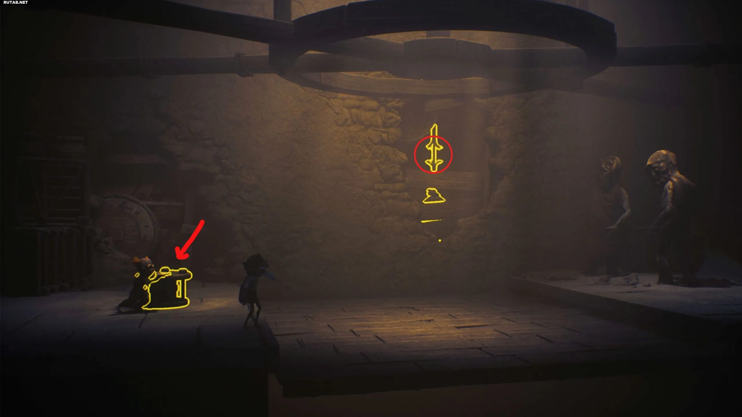 Сдвиньте ящик из-под лестницы и используйте его, чтобы добраться до верхней платформы. Разрушьте стену с помощью гаечного ключа и поднимитесь по двум лестницам, чтобы попасть в комнату с окаменевшим висящим телом.