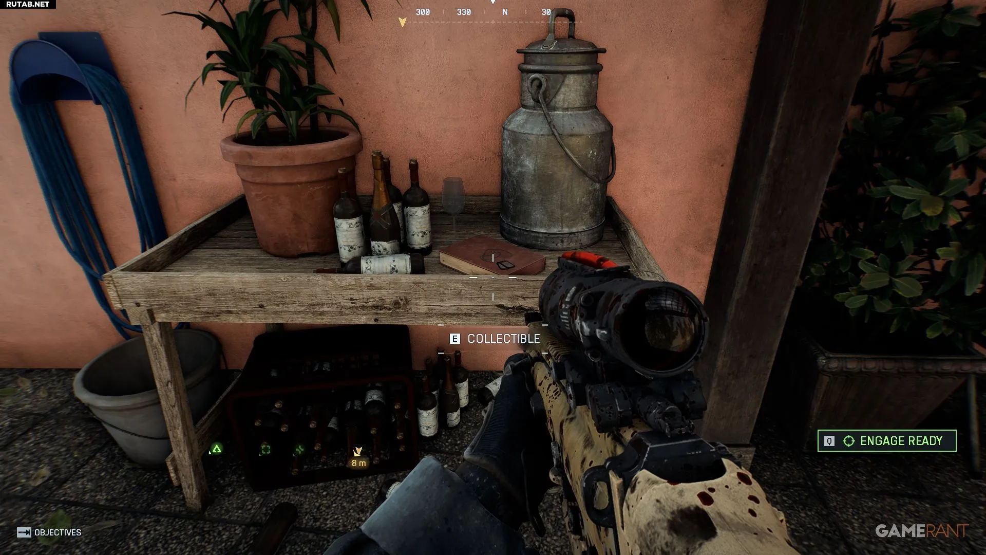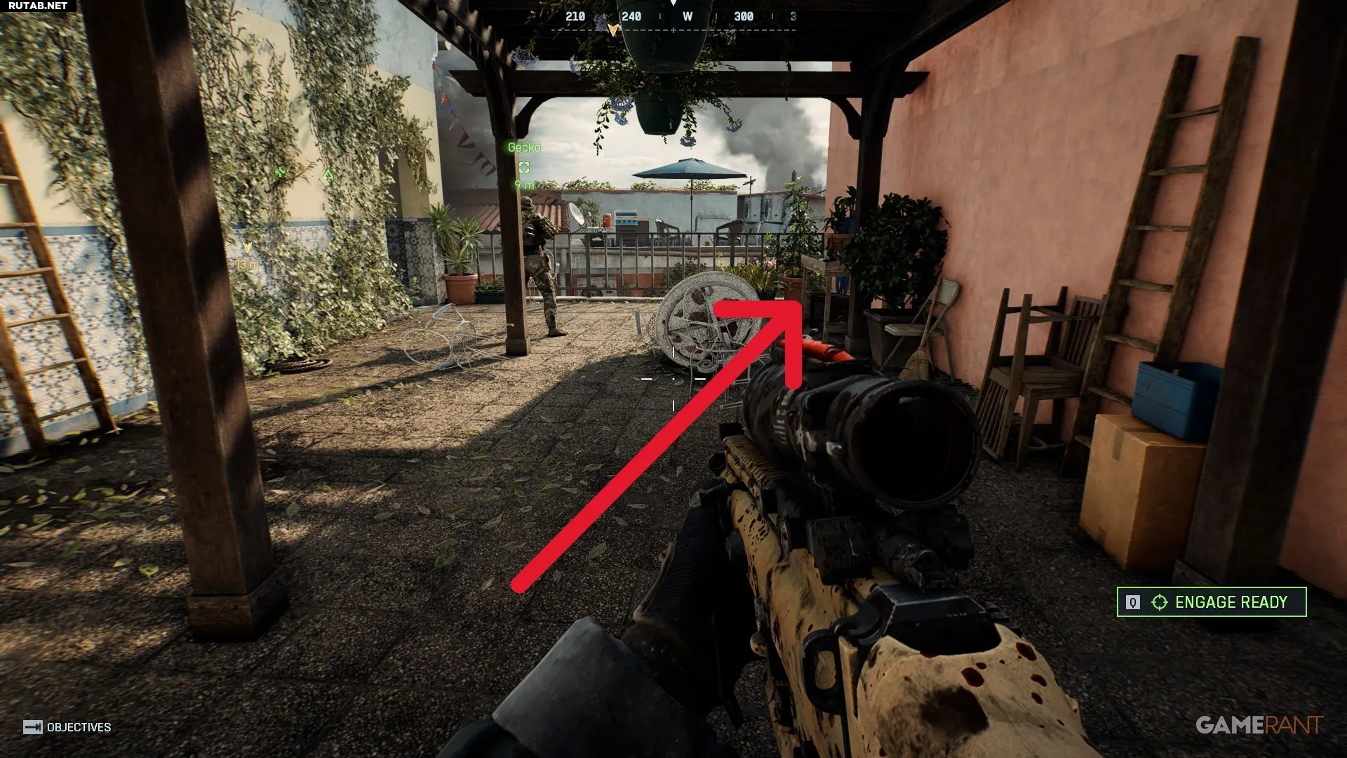 Продолжайте следовать за отрядом, пока не попадёте на открытую площадку, увитую виноградной лозой. Справа, рядом с балконом, стоит стол с горшечным растением и другими предметами, среди которых лежит второй жетон для «Операции Гладиус».
