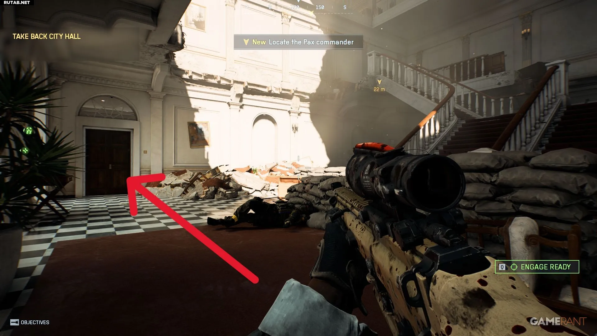 Третий жетон находится почти в самом конце миссии, после того как игроки очистят большую открытую площадь. Затем они войдут в большое белое здание, где только что видели, как командир Pax Armata расстреливает заложника.
