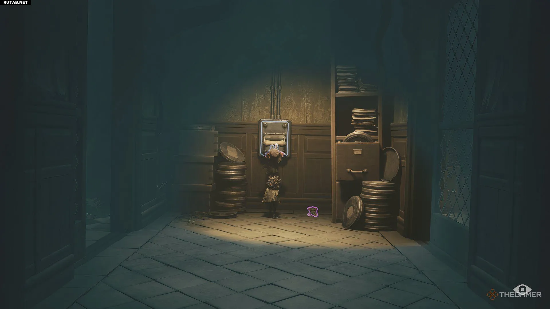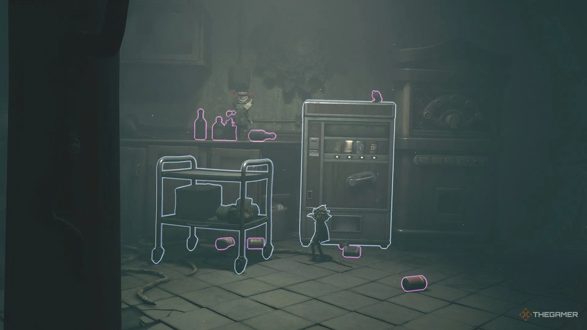 Войдя в комнату, вы увидите торговый автомат и несколько шкафов у дальней стены. Если посмотреть наверх, то на автомате можно заметить куклу. Чтобы добраться до неё, возьмите тележку из коридора, пододвиньте её к шкафам и заберитесь наверх, чтобы собрать куклу.