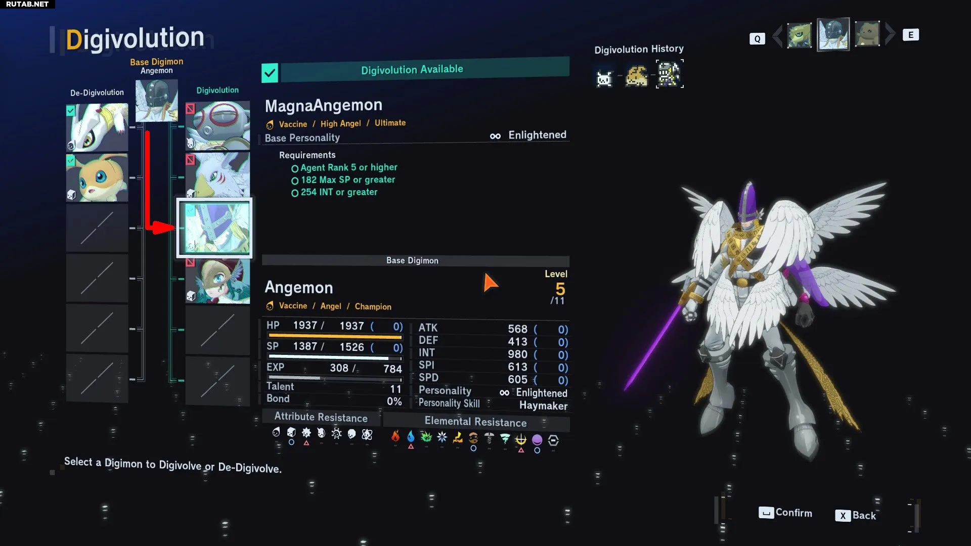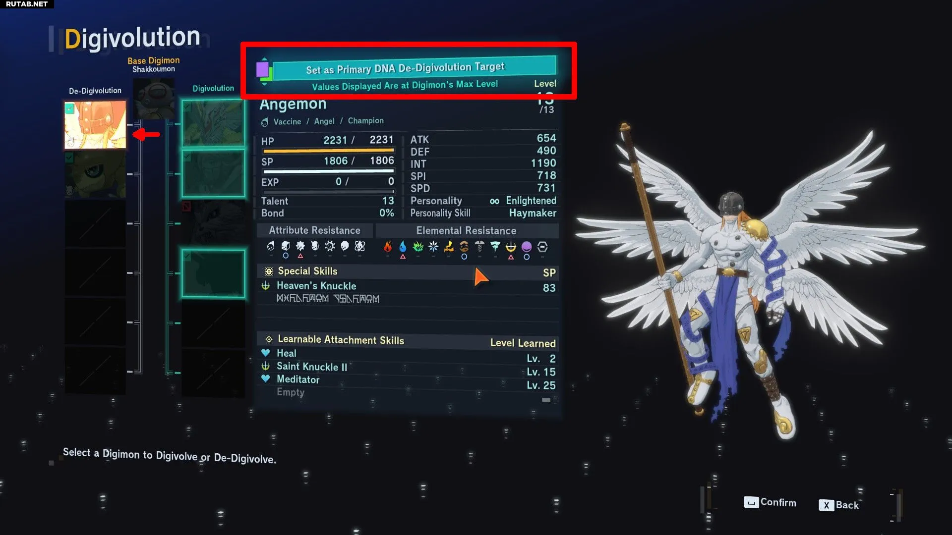 - Убедитесь, что Angemon имеет личность Просветлённый. При необходимости измените её на Ферме дигимонов.
