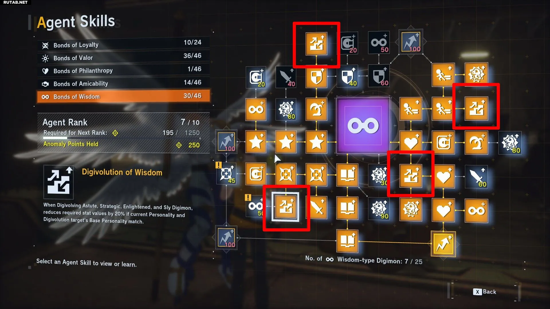 После разблокировки Shakkoumon в Полевом руководстве откройте четыре узла Дигиволюции Мудрости в дереве навыков Агента Мудрости. Эти навыки позволят выполнять следующие действия: