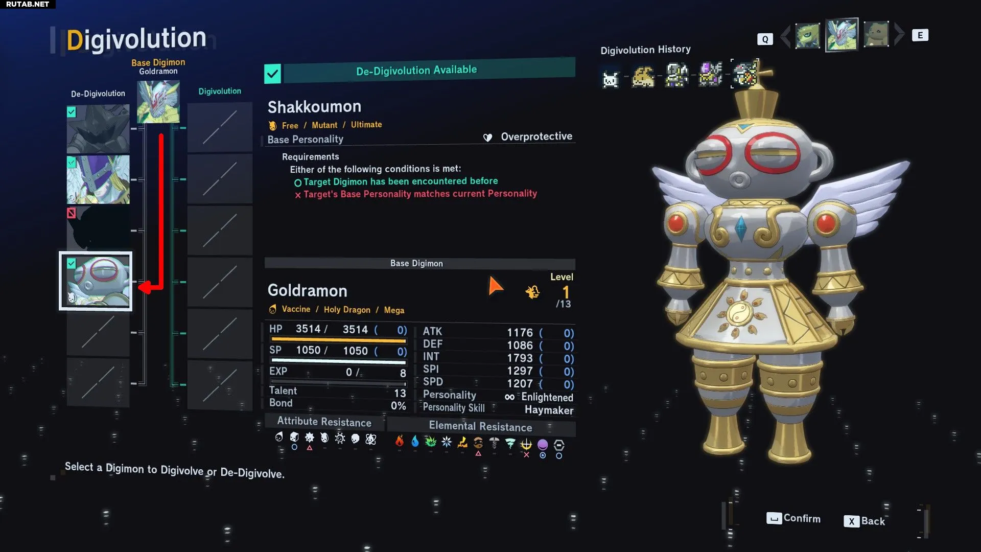 - Провести де-дигиволюцию Goldramon в Shakkoumon.