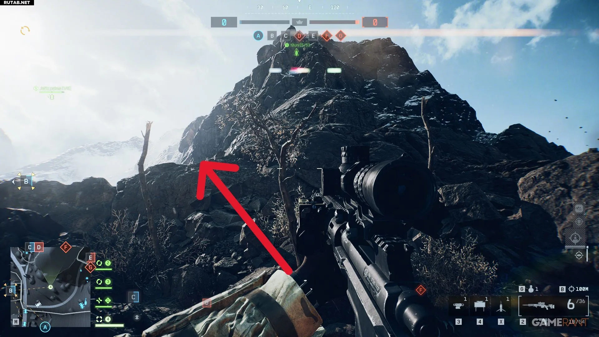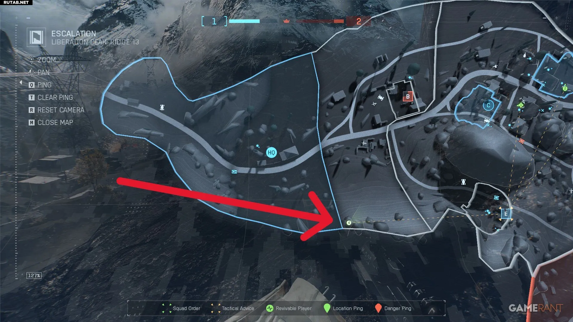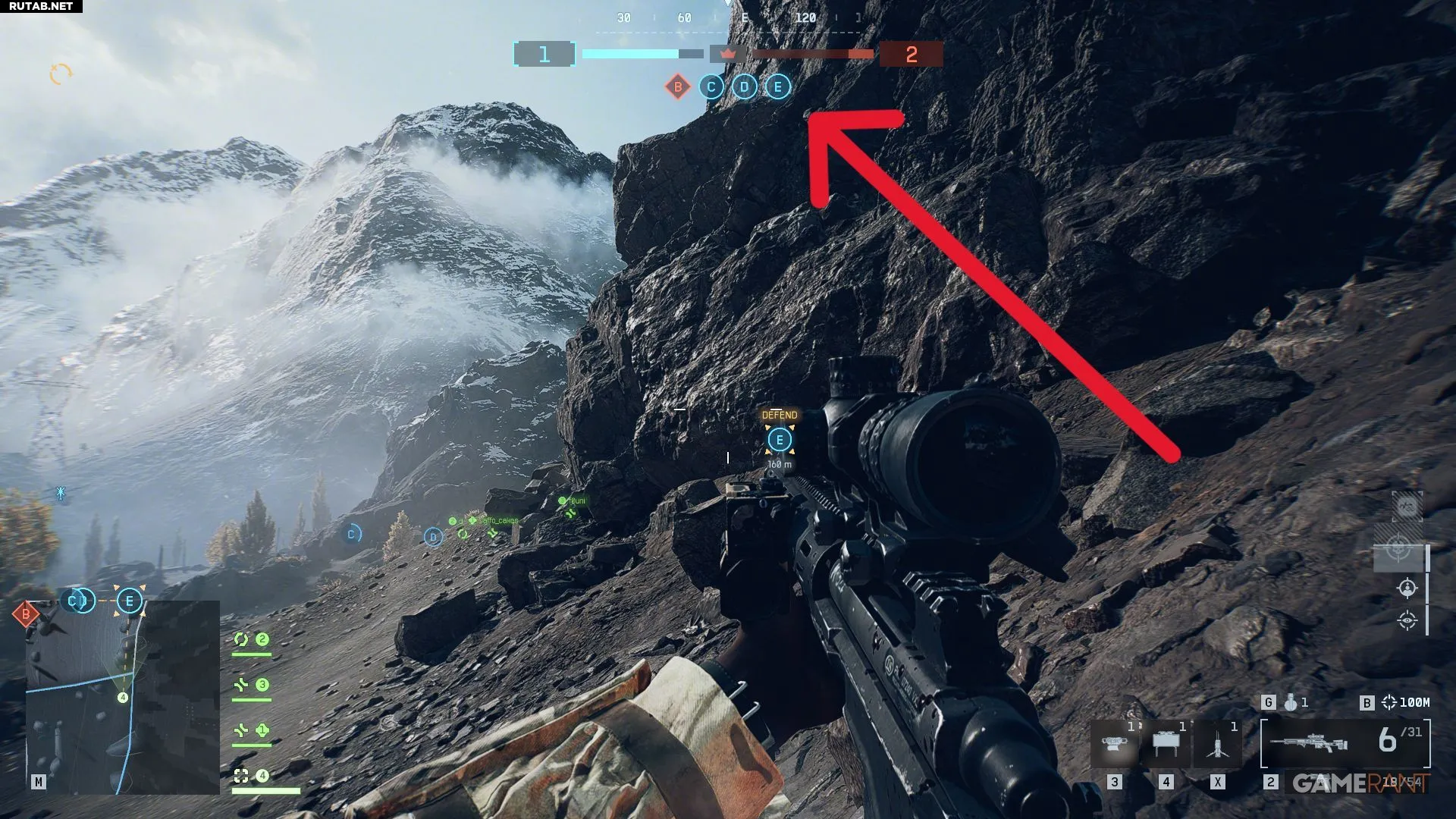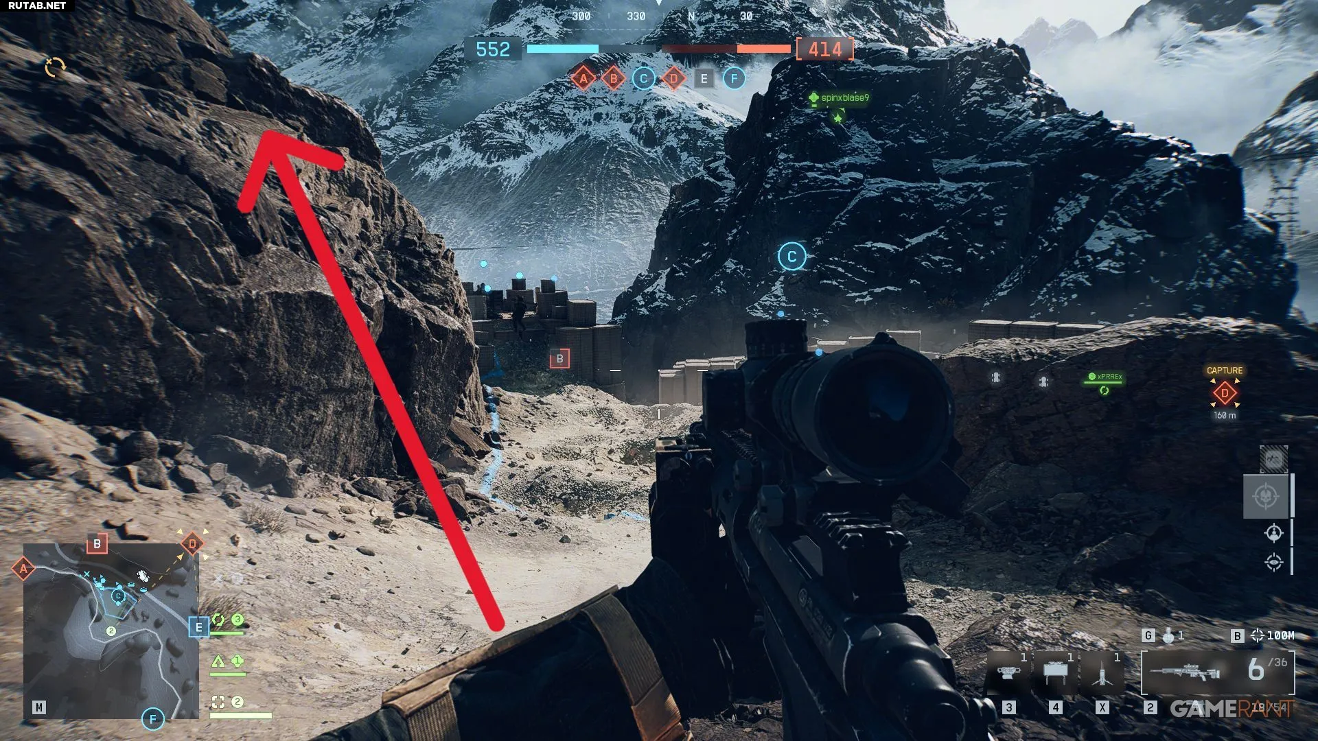 Если дела у команды НАТО идут не очень хорошо и их оттеснили, есть хорошая позиция прямо за пределами зоны базы. Используйте указатель-стрелку и переберитесь через скалы на небольшой выступ.